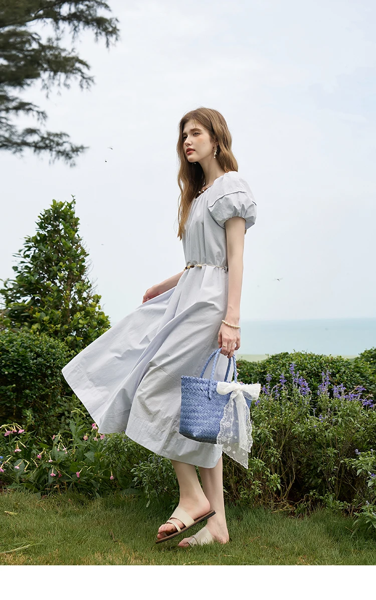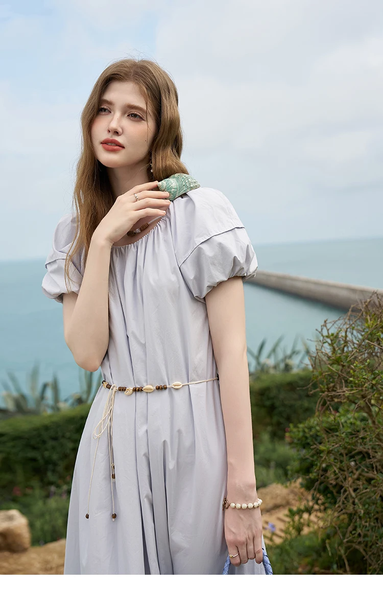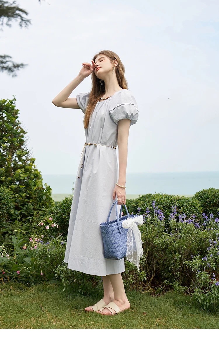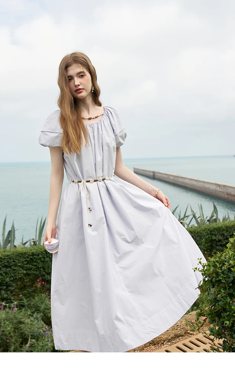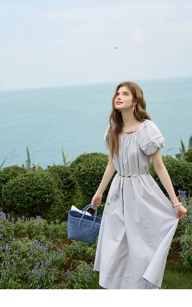MISHOW 100 Cotton Bohemian Dress 2024 Summer French Elegant Elastic Round Neck Bubble Sleeve Long Dresses with Belt MXD26L1940