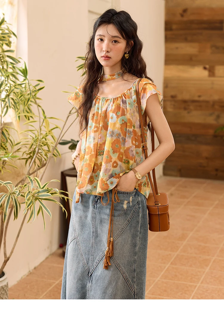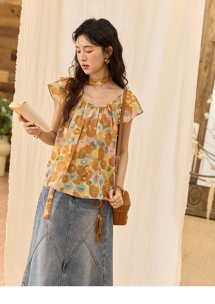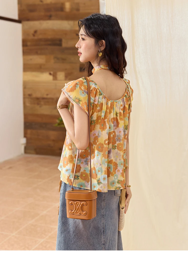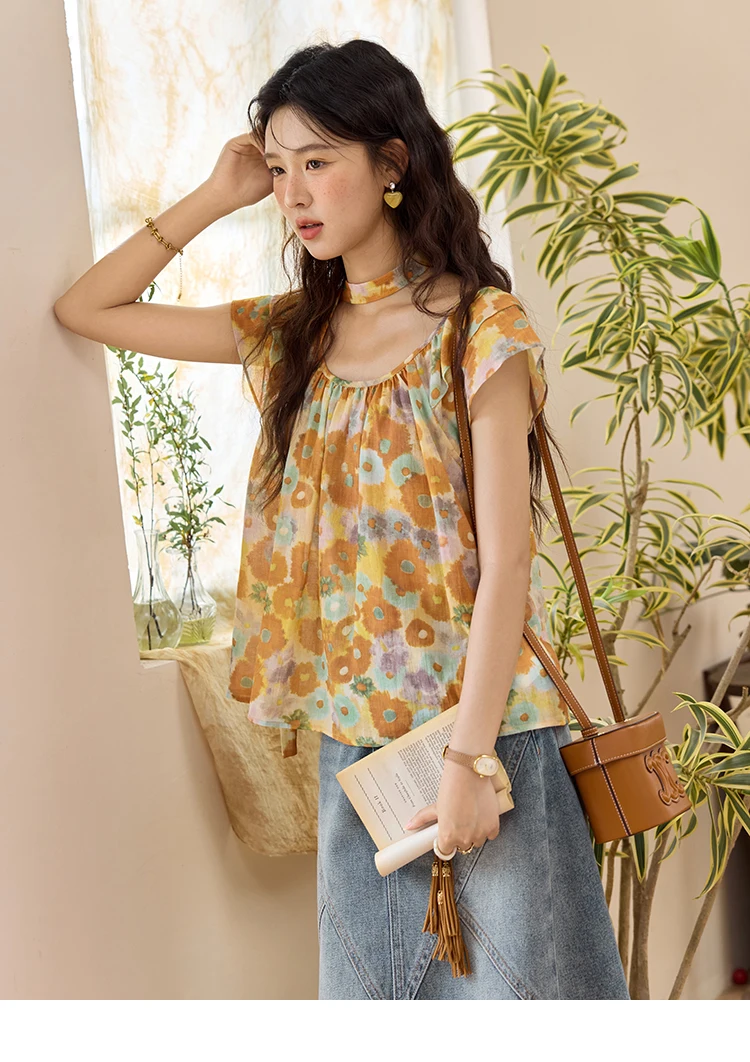MISHOW 100 Cotton Citrus Oil Painting Printed blouse for Women 2025 Summer Vacation Korean Flying Sleeve Casual Top MXE36X1872