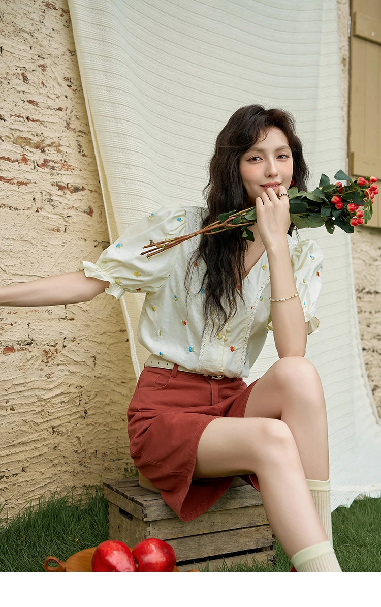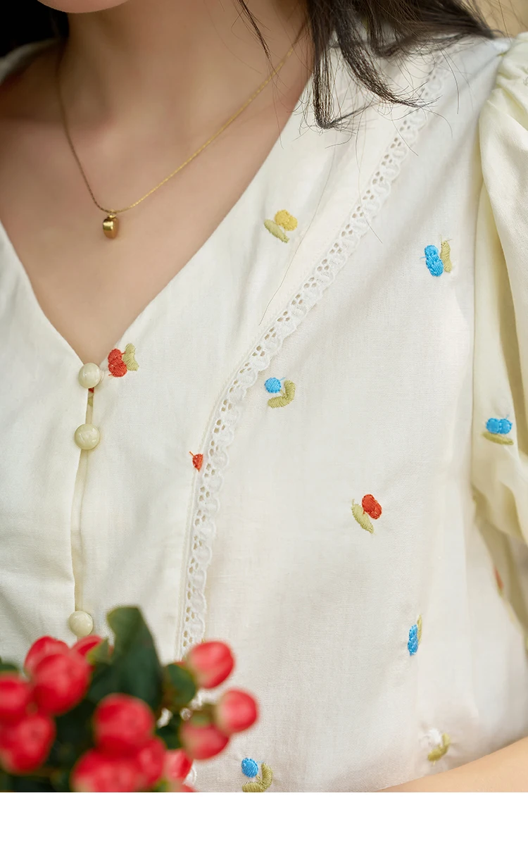 MISHOW 100% Cotton Women's Puff Short Sleeve Shirt 2025 Summer New Square Neck Blouse Embroidered Lace Patchwork Tops MXD22X1420