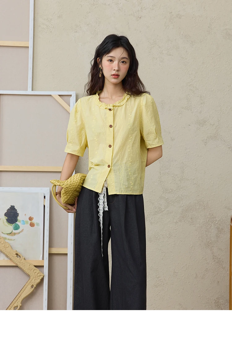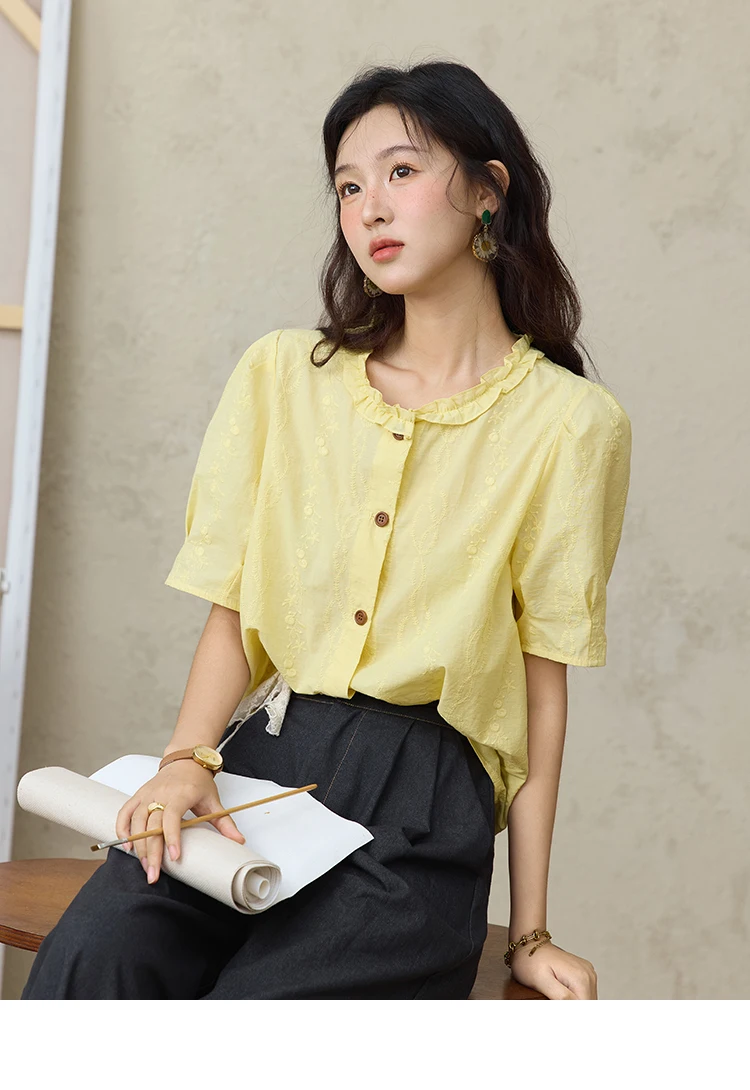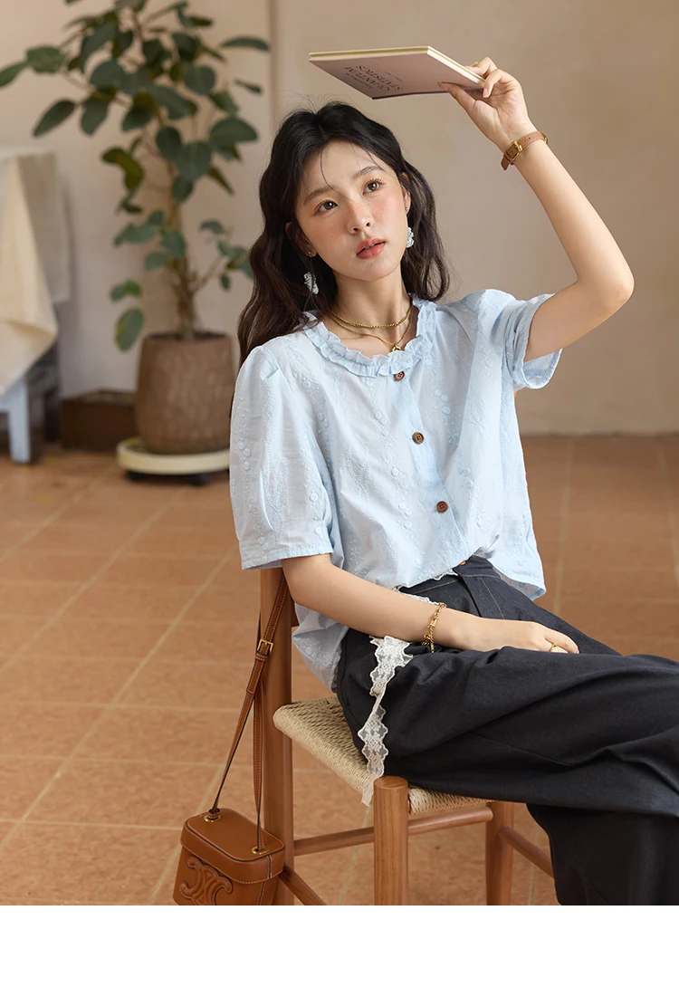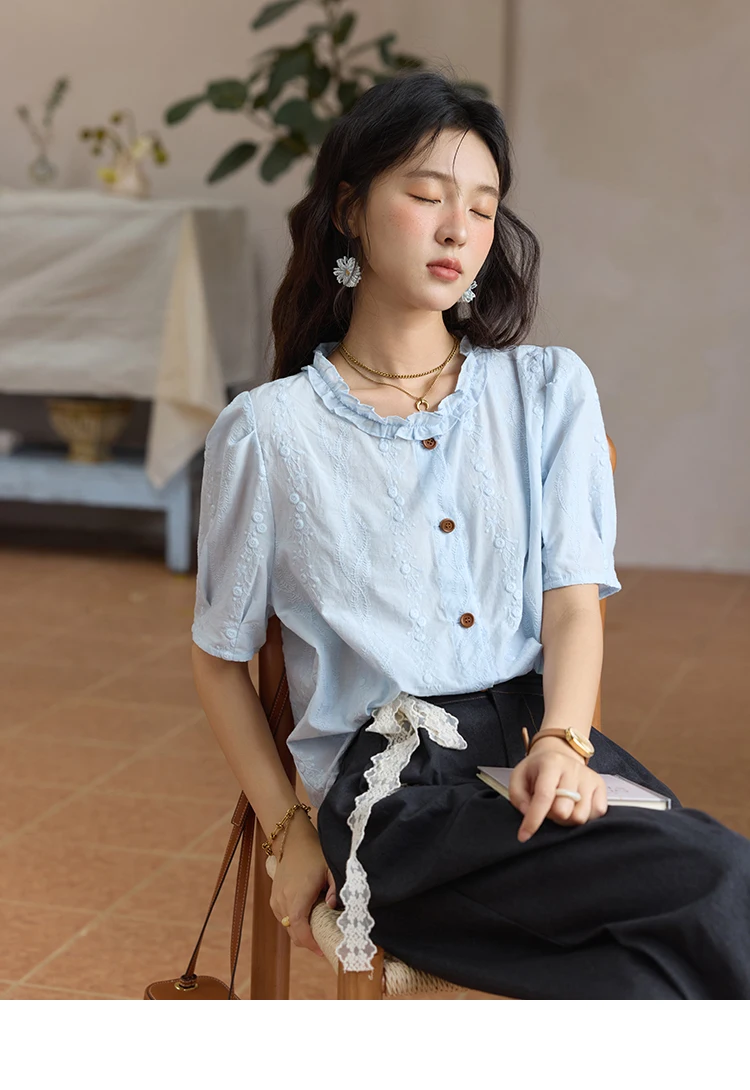 MISHOW 100% Cotton Women's Puff Sleeve Shirt 2025 Summer New Fashion Round Neck Button Top Casual Female Clothing MXE36X1873