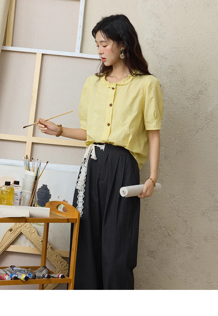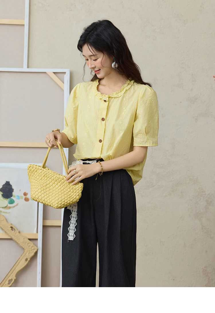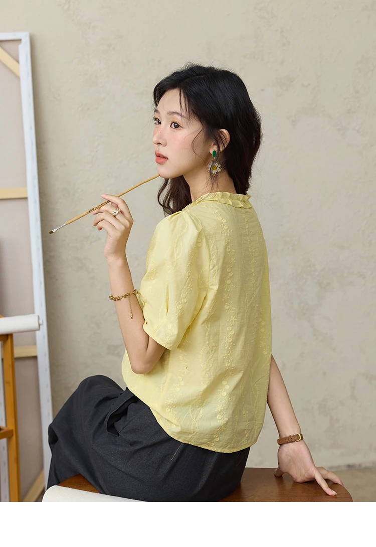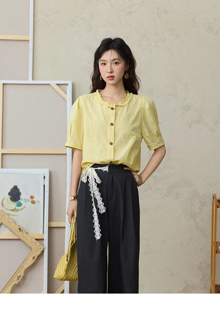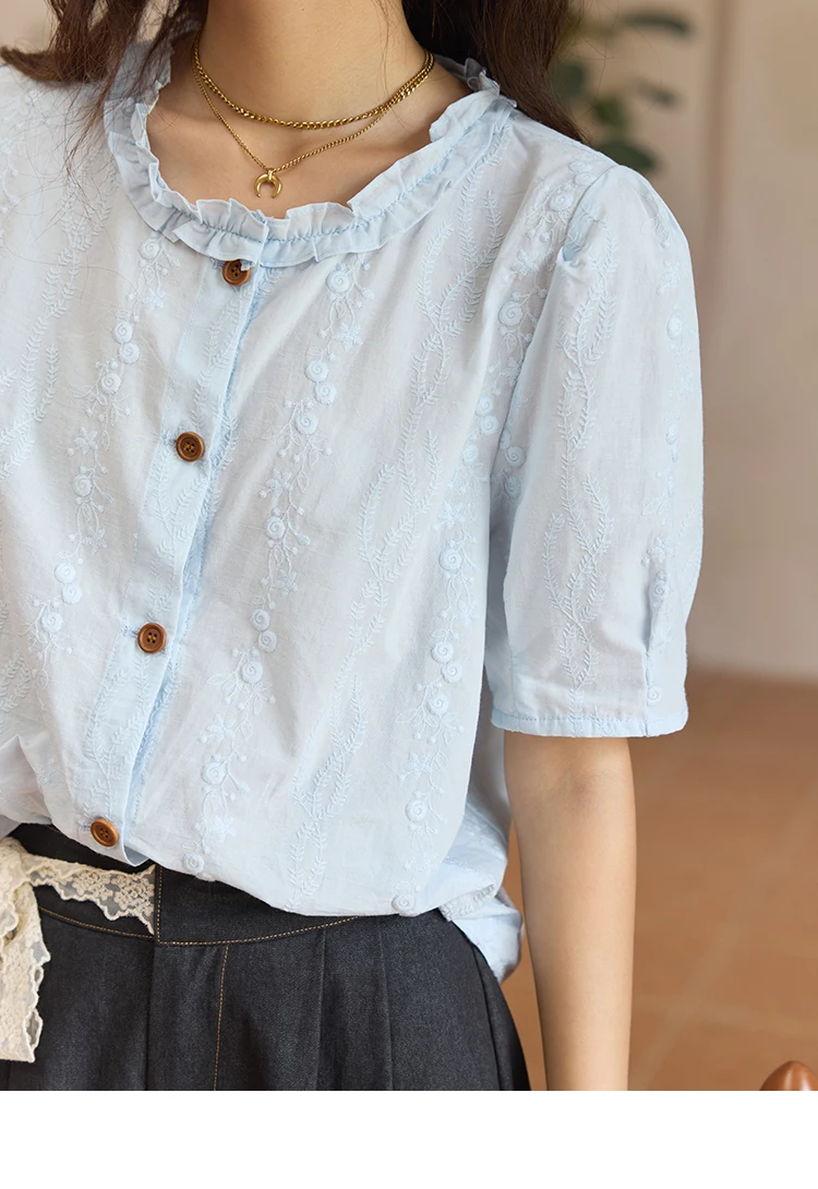 MISHOW 100% Cotton Women's Puff Sleeve Shirt 2025 Summer New Fashion Round Neck Button Top Casual Female Clothing MXE36X1873