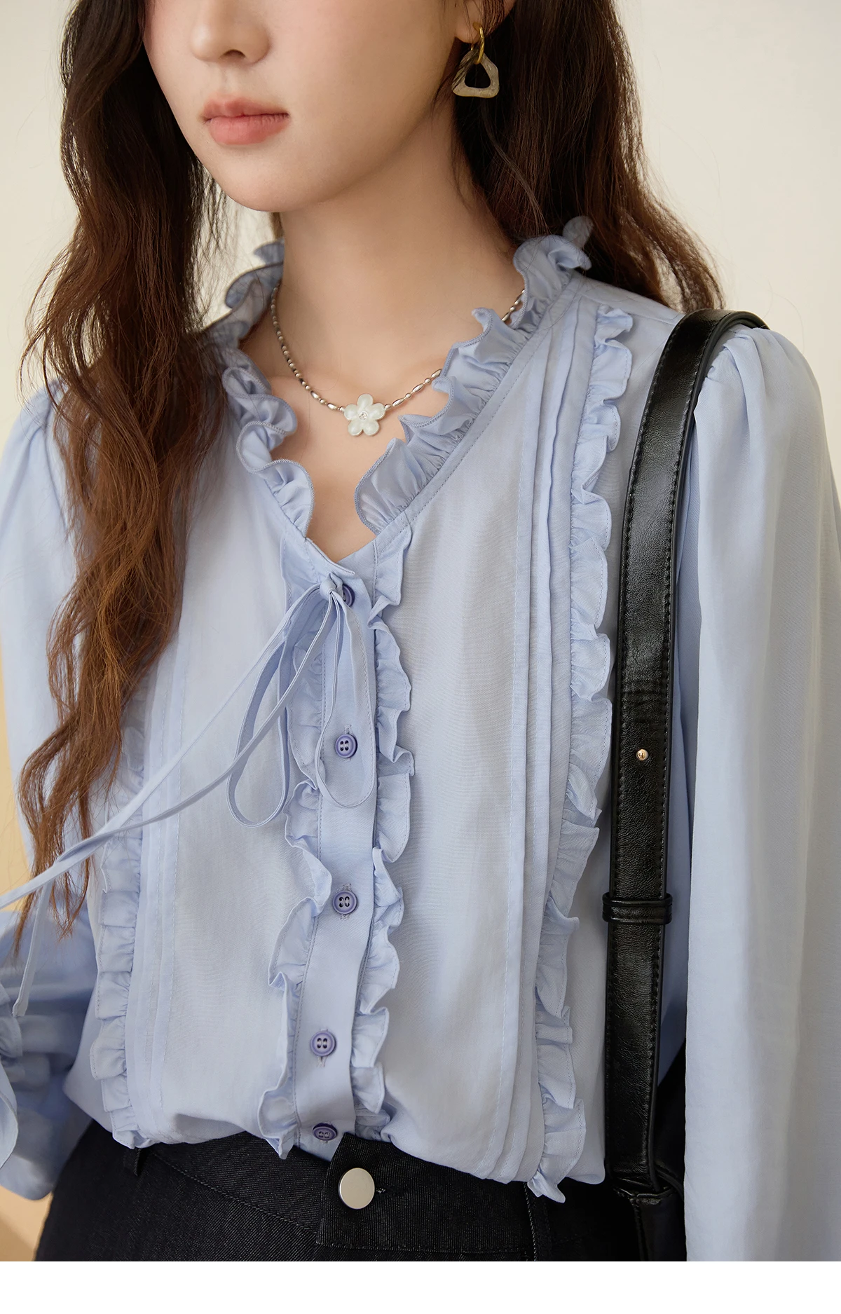 MISHOW 100% Lyocell Women's Blue Shirt 2025 Autumn French Ruffles Long Sleeves Ties Blouse Office Lady Elegant Top MXE45X2484