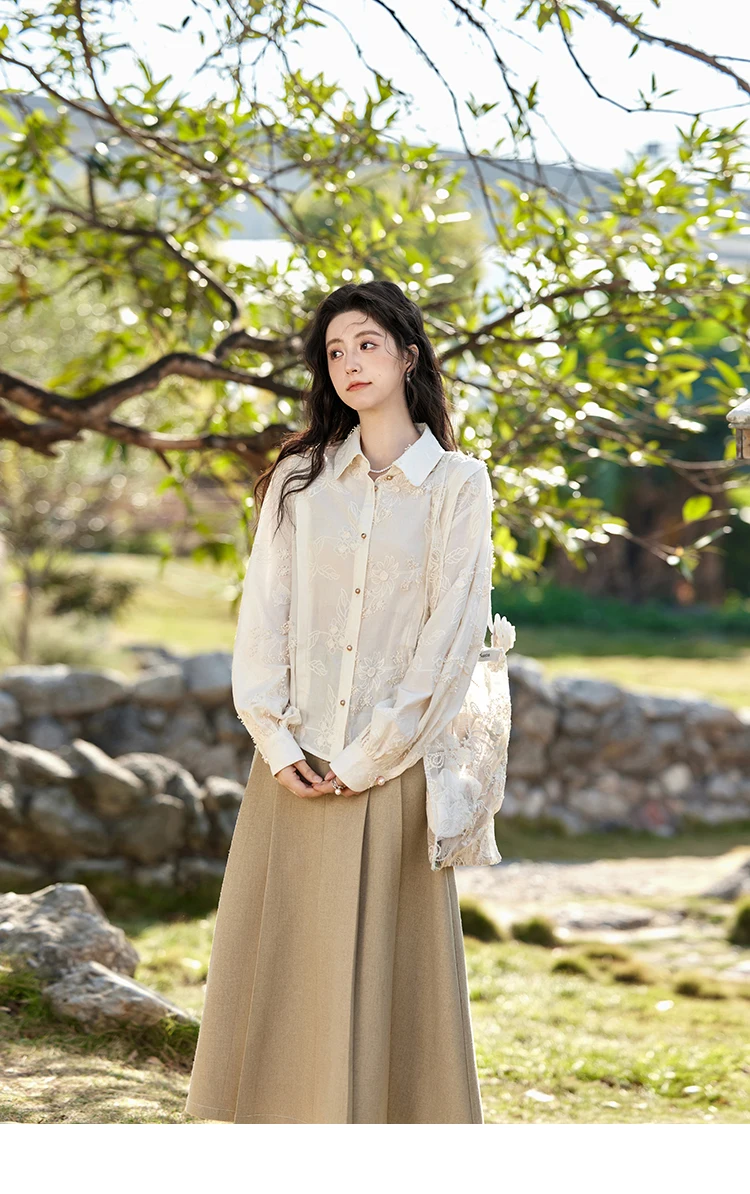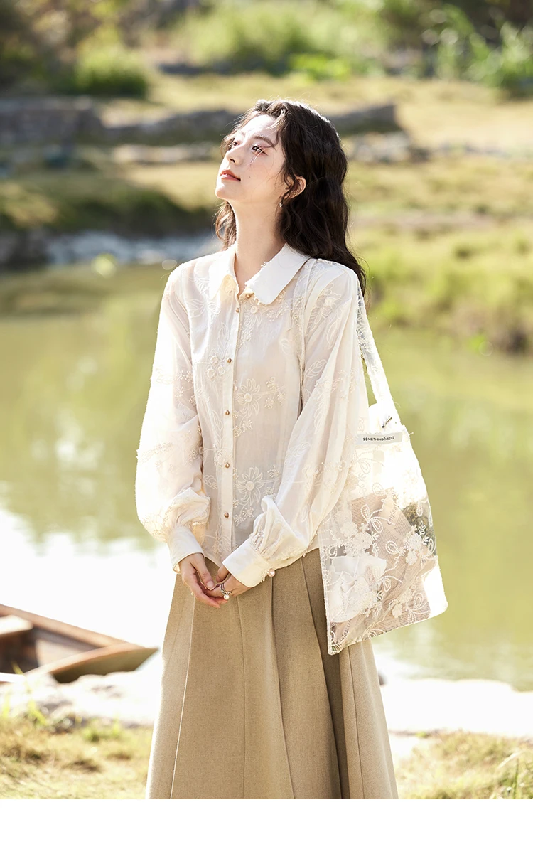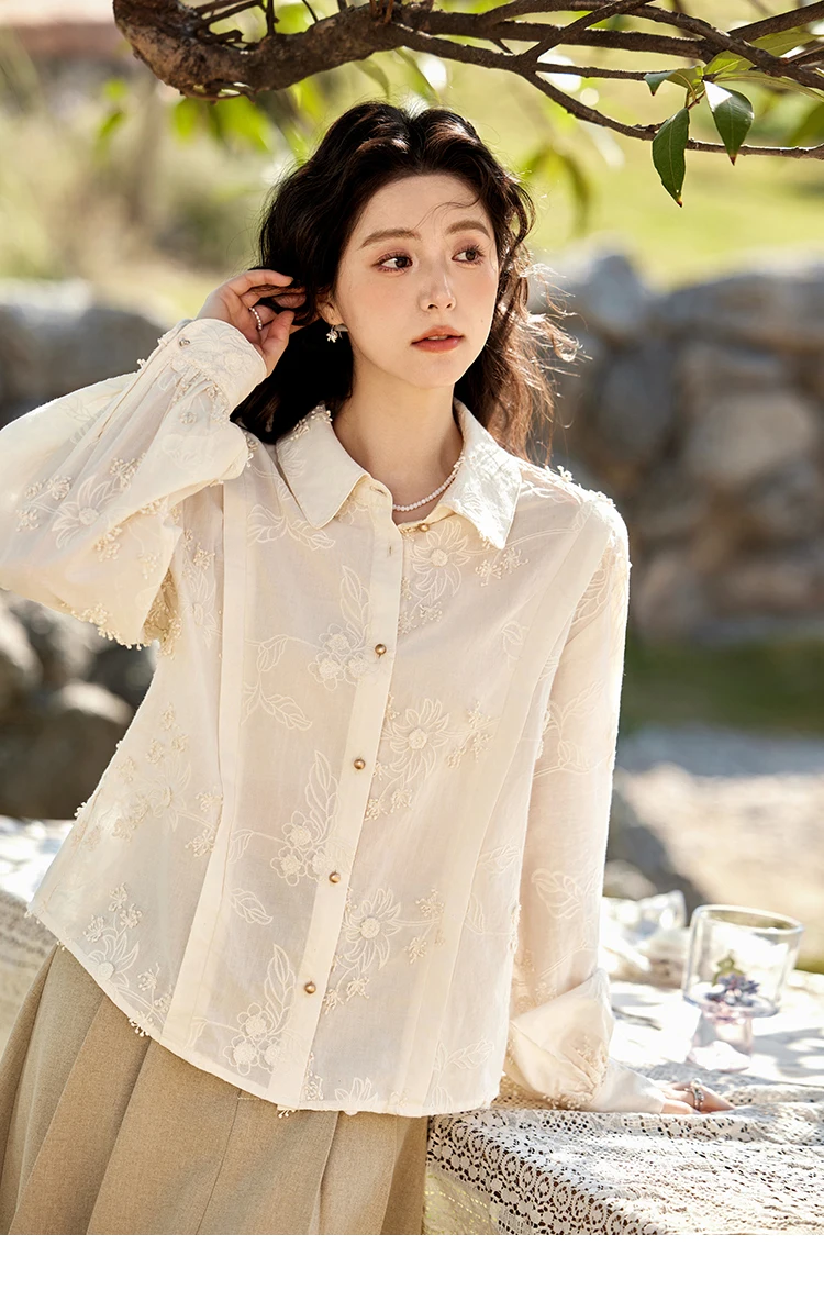 MISHOW 100Cotton Embroidered Jacquard Shirt for Women Spring 2025 Long Sleeved Loose Top Lapel Single Breasted Shirts MXE12C0391