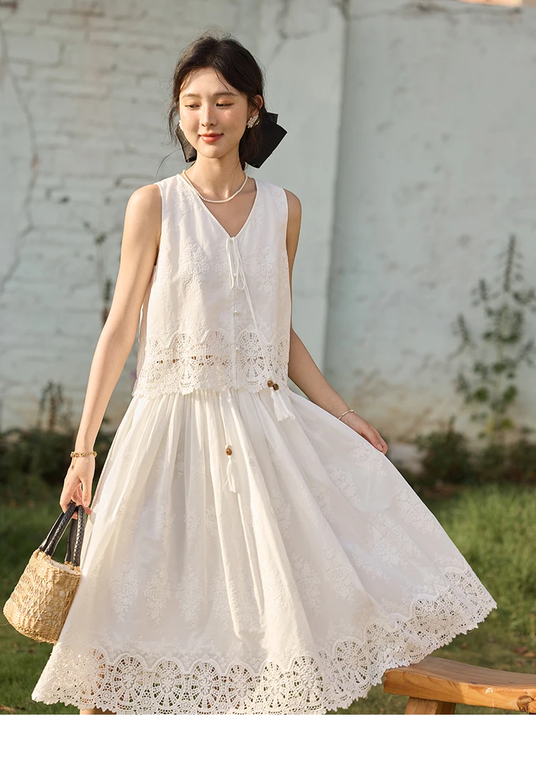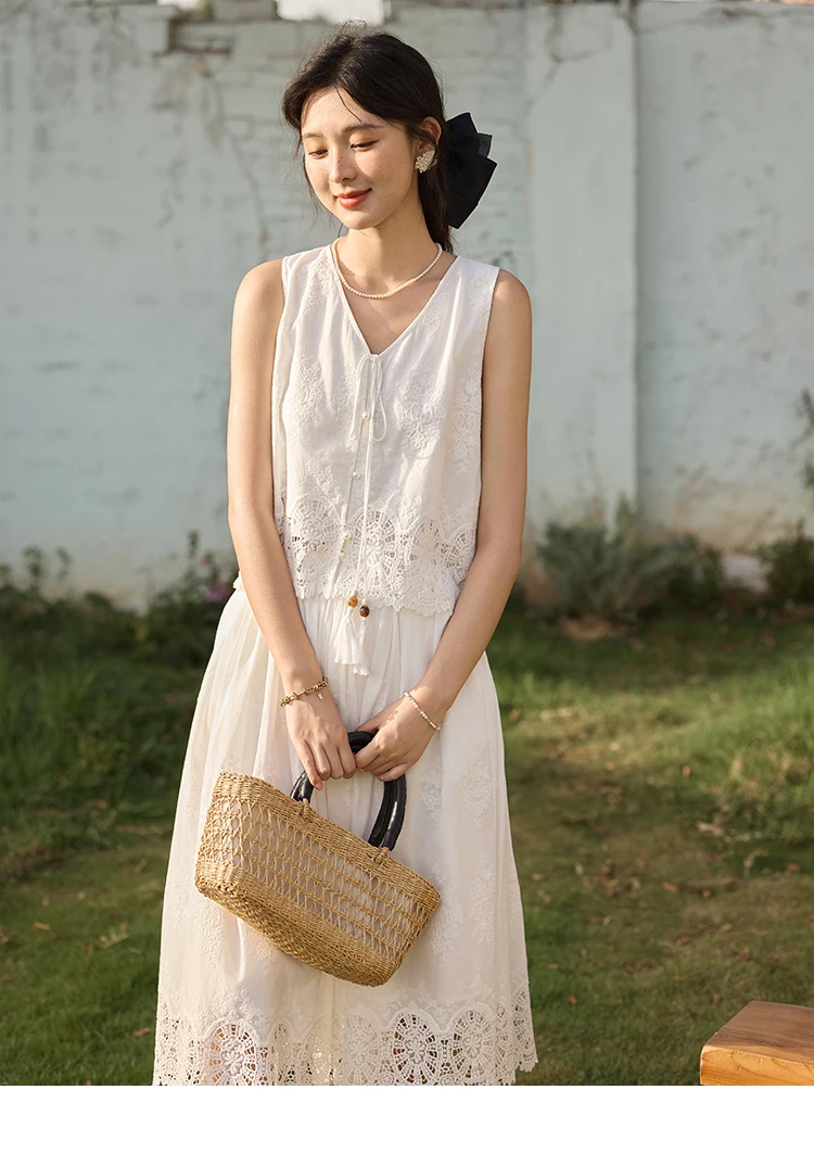 MISHOW 2 Pieces Set Woman Embroidery V-neck Hollow Lace Up Sleeveless Top Summer 2025 Slim Elastic Waist Skirt Set MXE33T0593