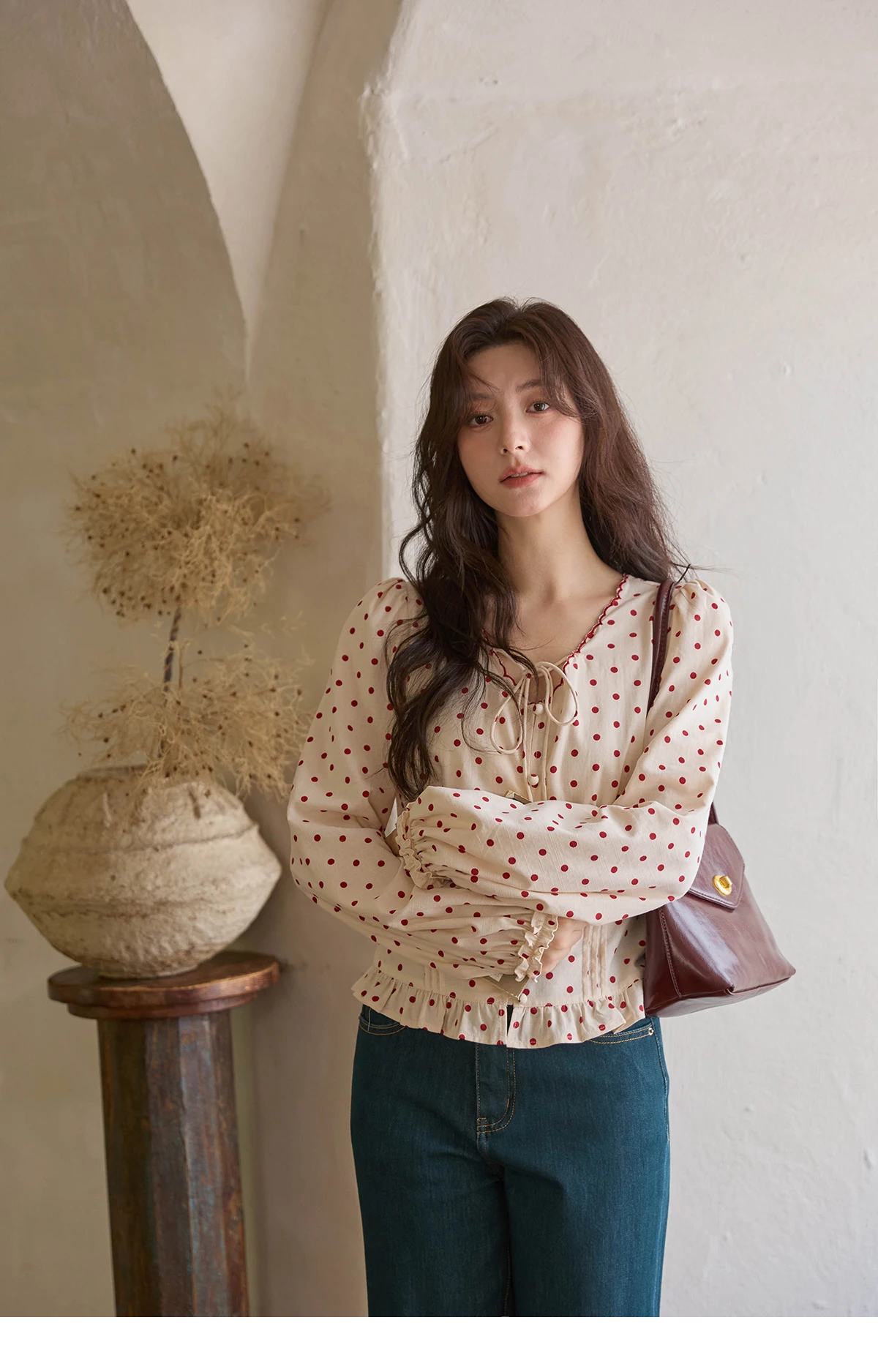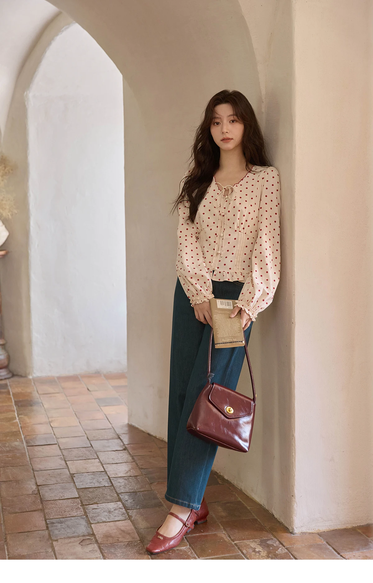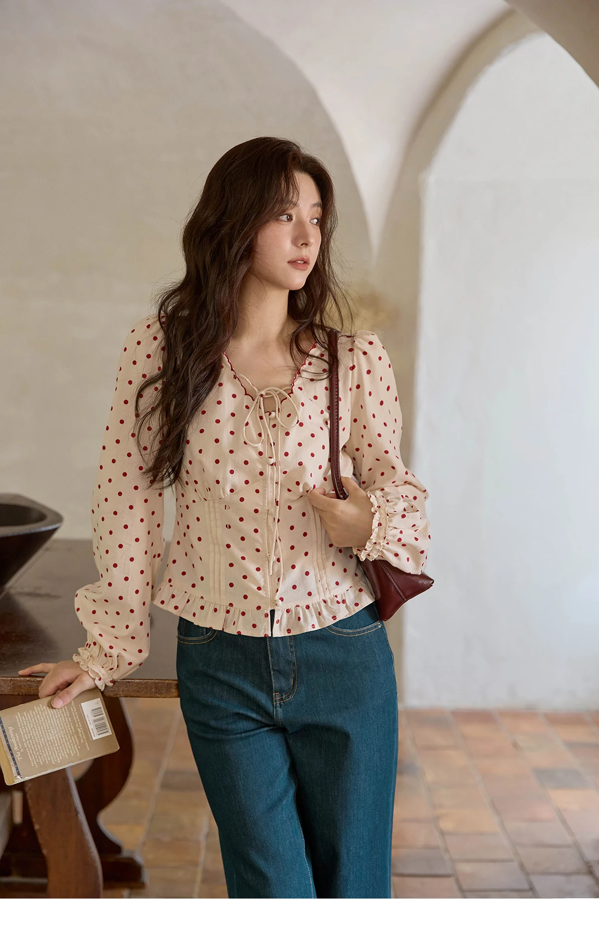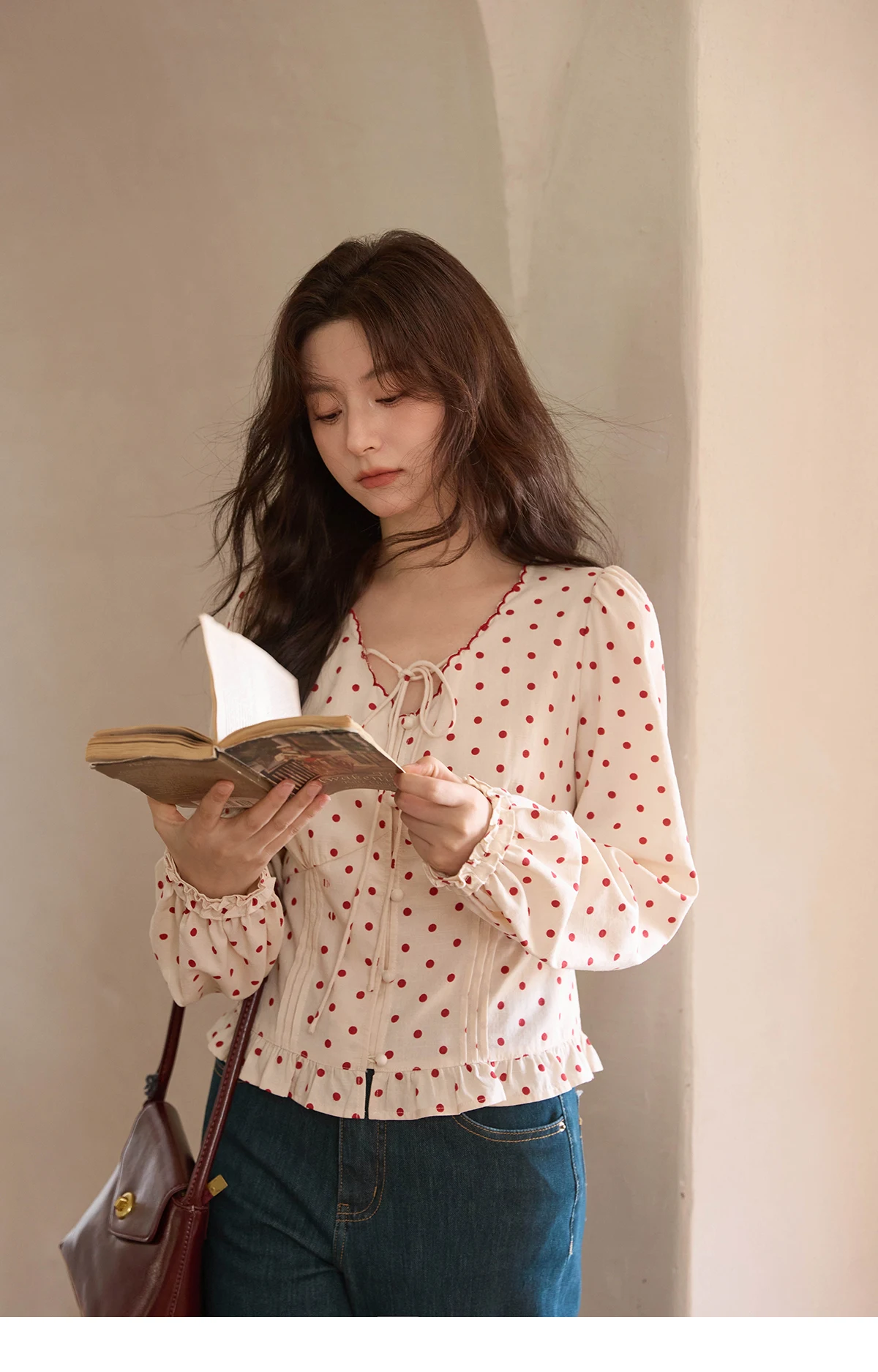 MISHOW Apricot Bottom Red Polka Dot Shirt for Women Autumn 2025 Korean Ruffled Edges Shirts V-neck Lace-up Sweet Top MXE42X1971