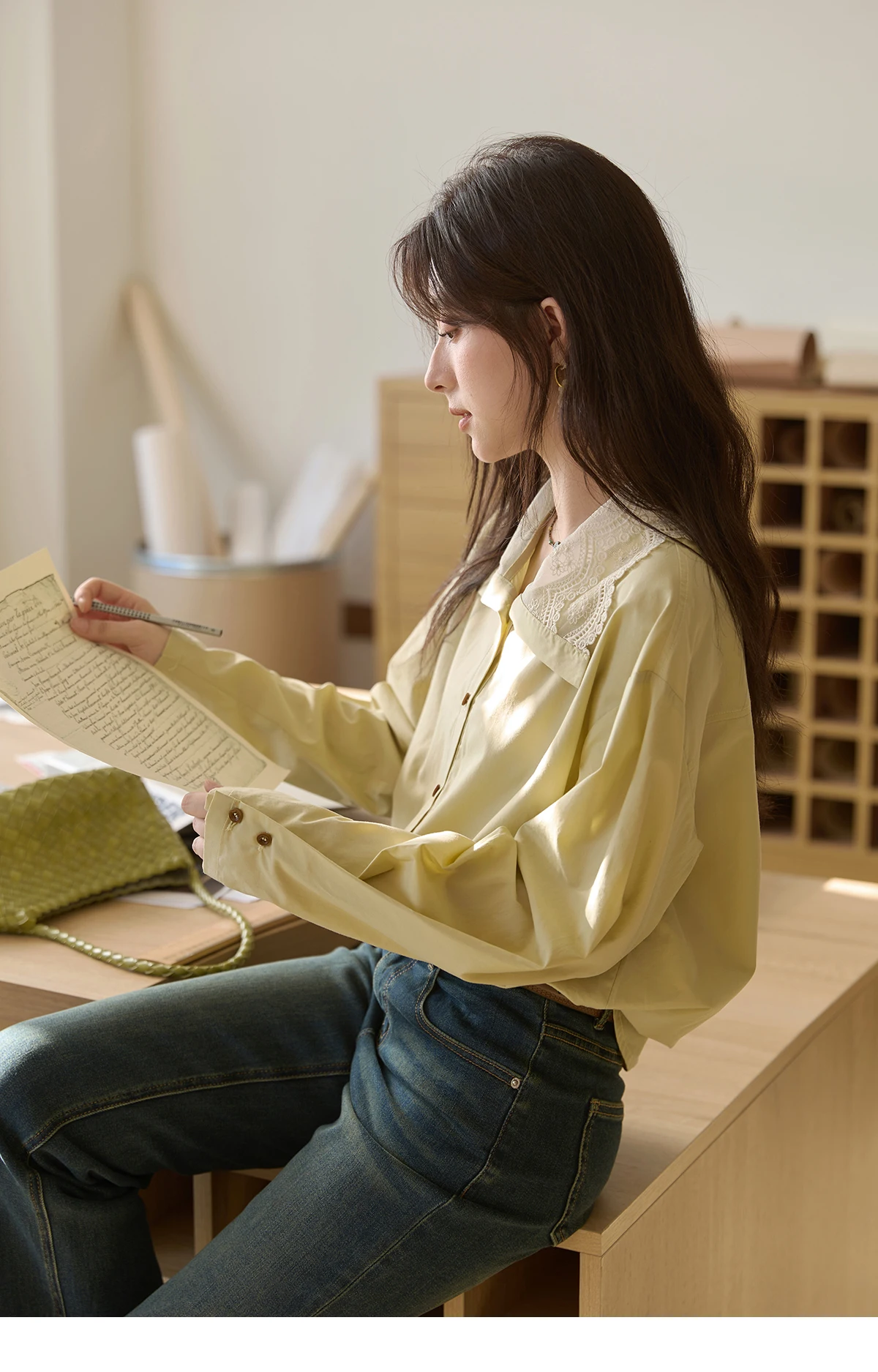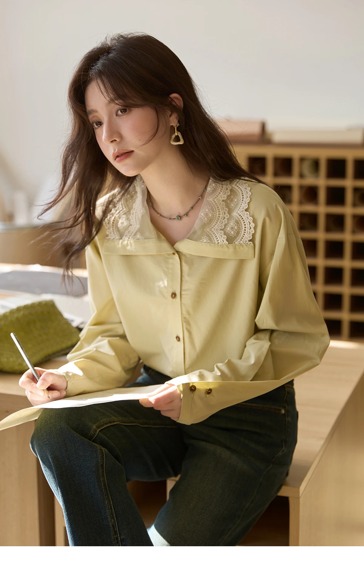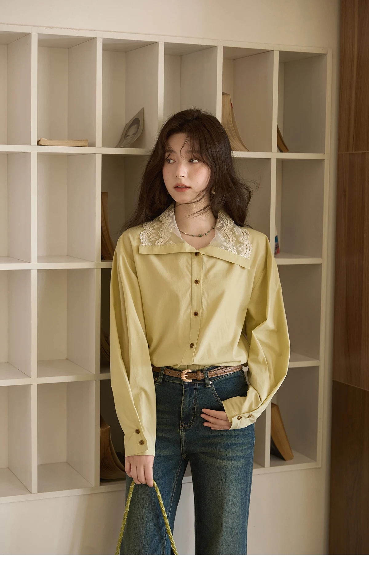 MISHOW Autumn Solid Cotton Shirt Autumn V-neck Double-layer Lace Retro Design Shirts Single Breasted Tops Office Lady MXE41C2366