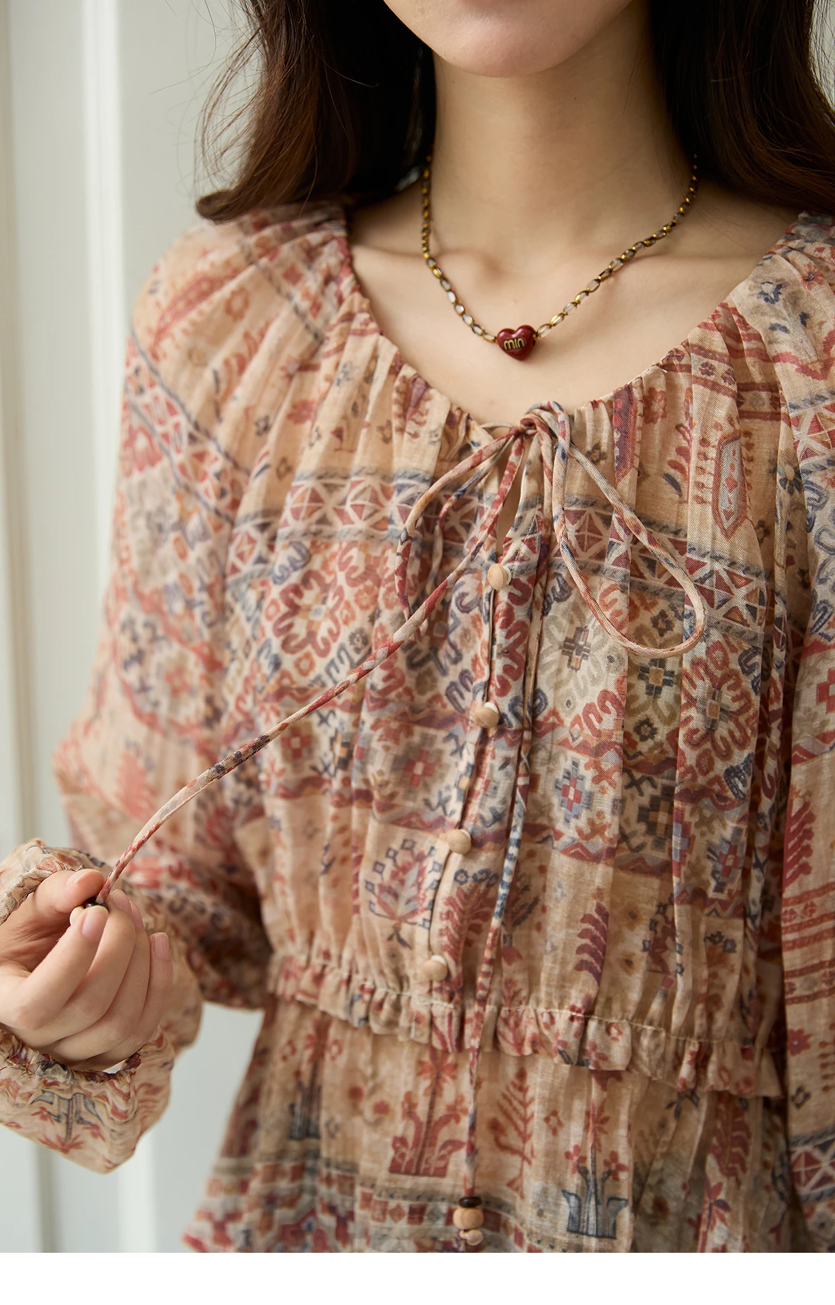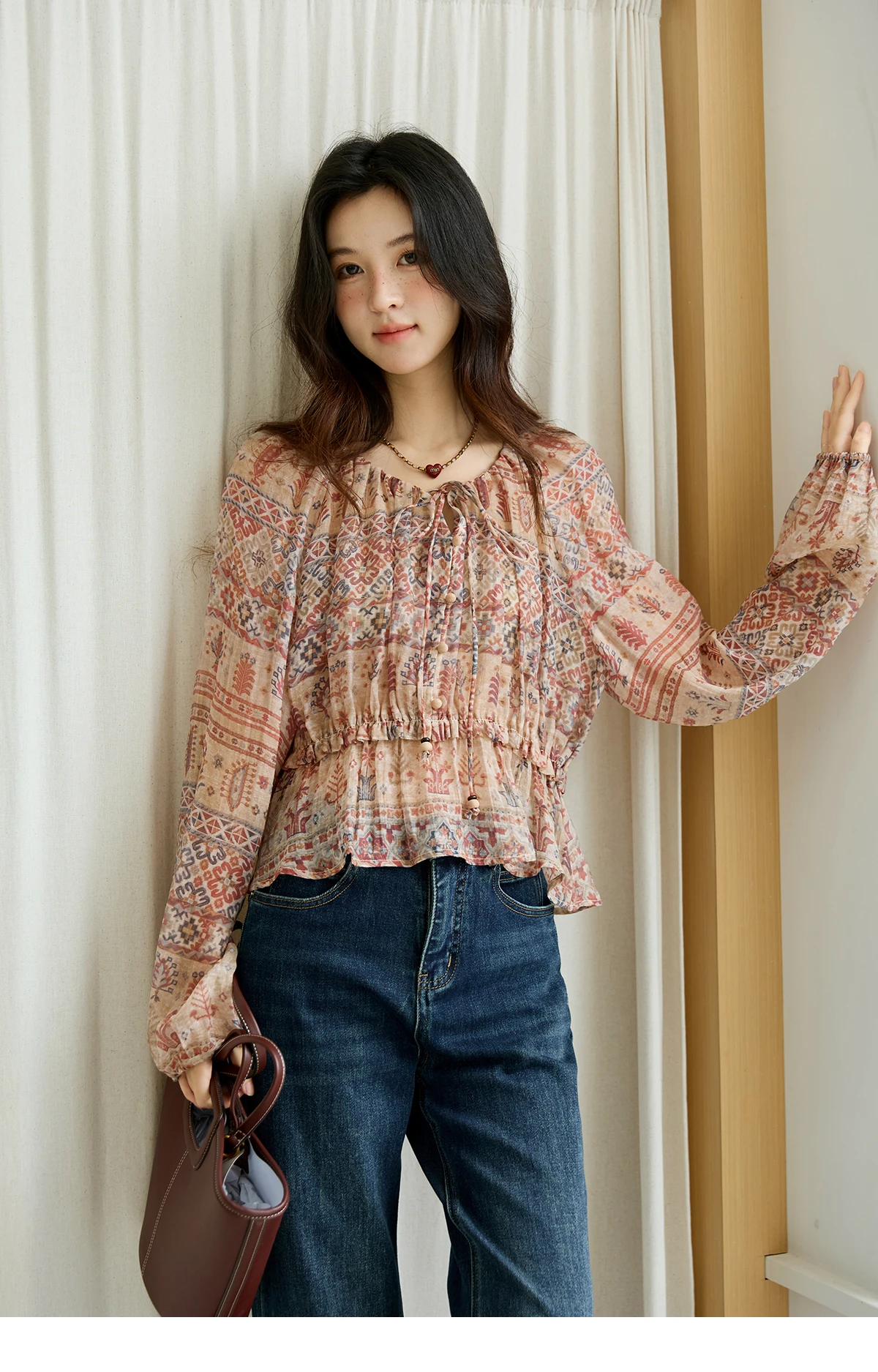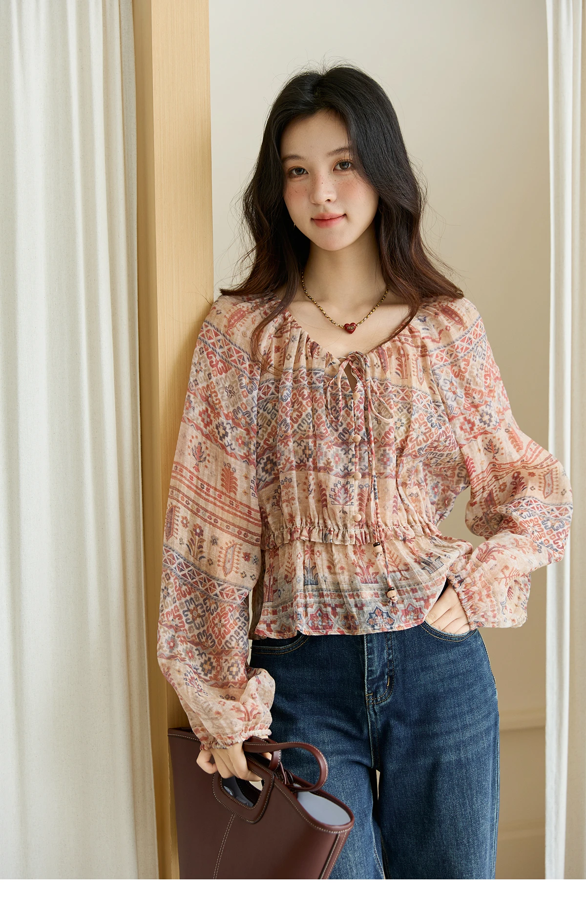 MISHOW Blouse Women 2025 National Style Printed Waist Round Neck Long-sleeved Top Commute Comfortable Autumn Blouse MXE47X2508