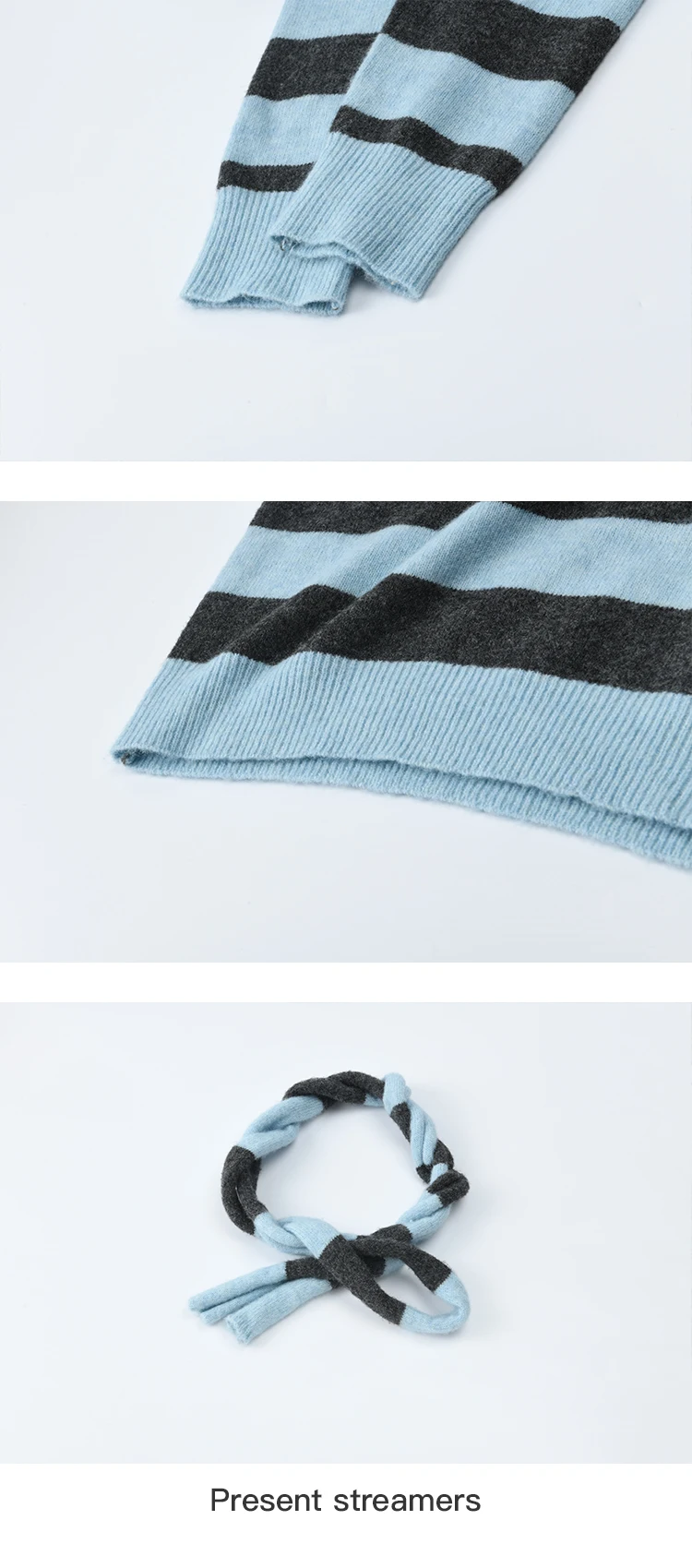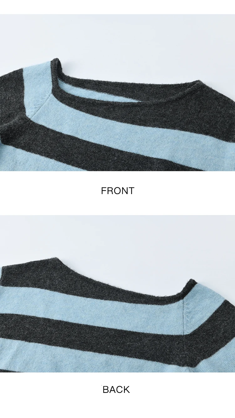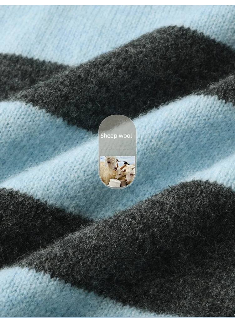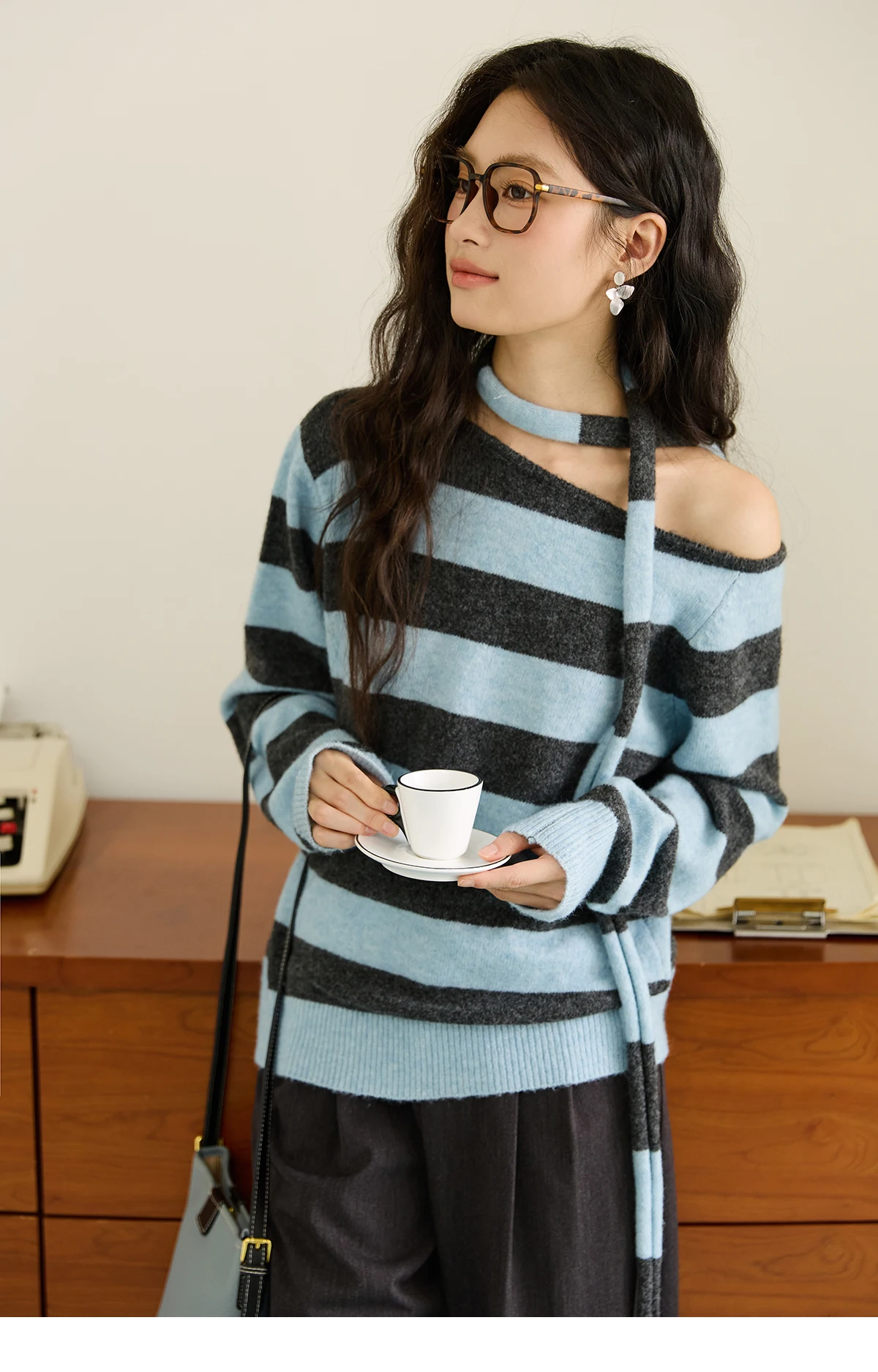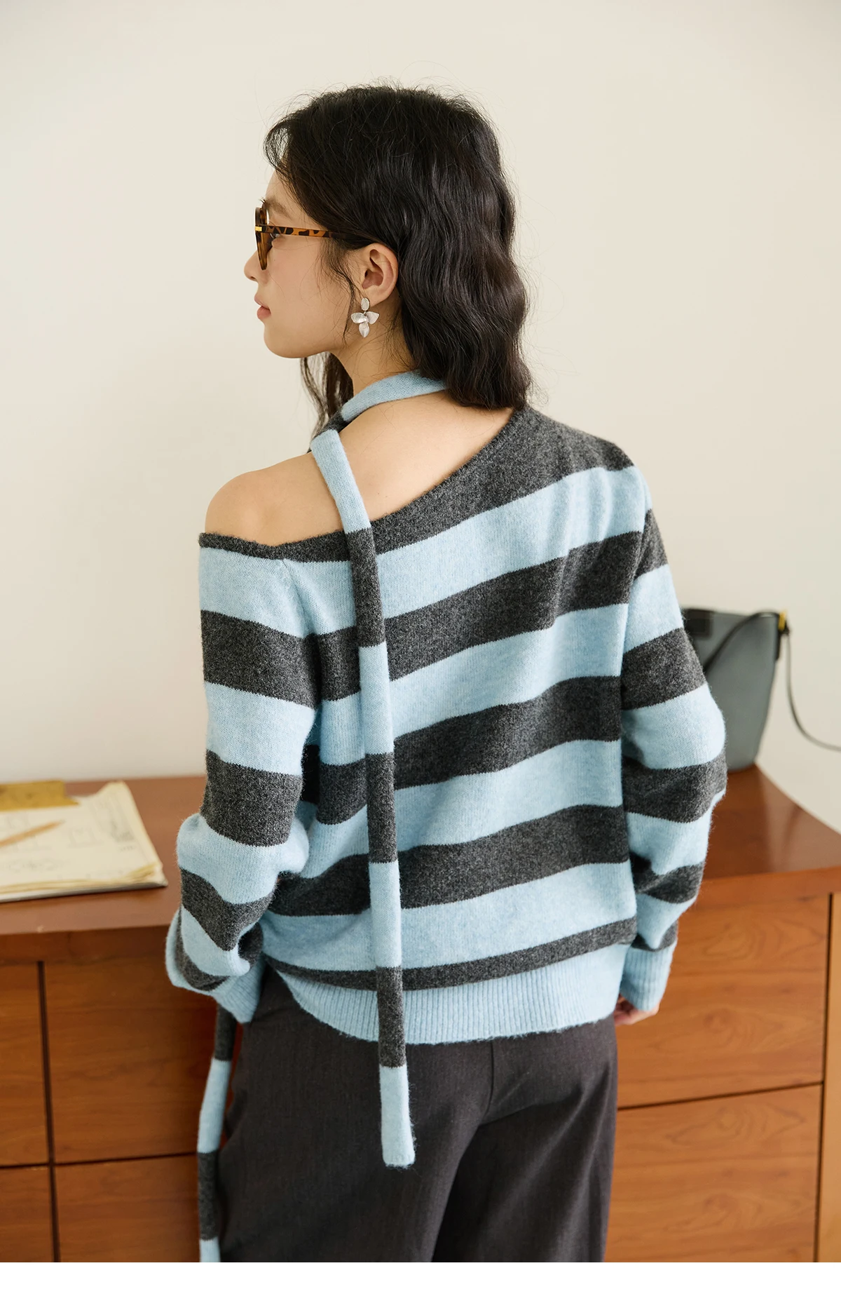 MISHOW Blue Gray Stripe Knitted Top 2025 Autumn Slanted Shoulder Collar Sweaters with Ribbon Loose Wool Blend Sweater MXE46Z2540