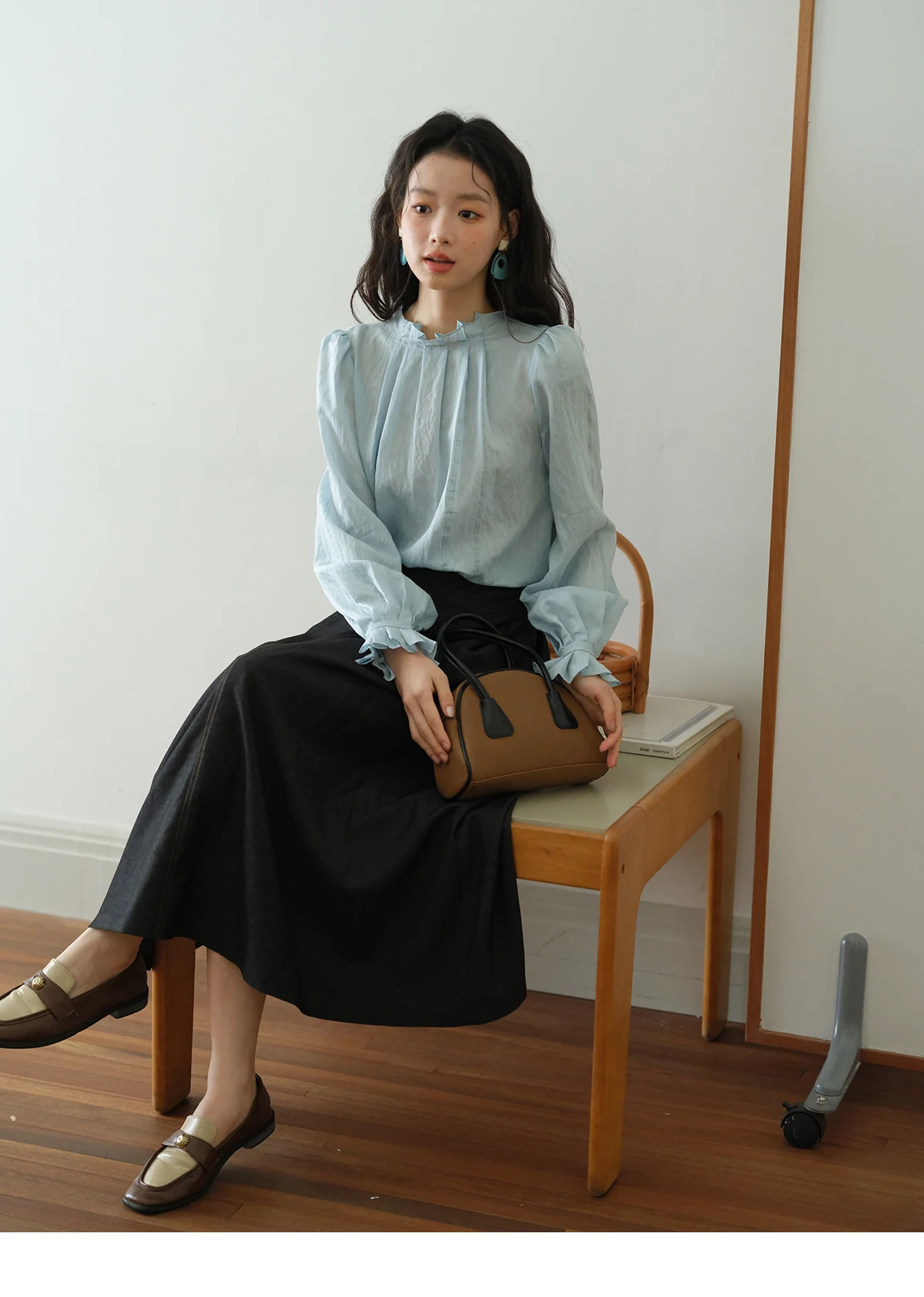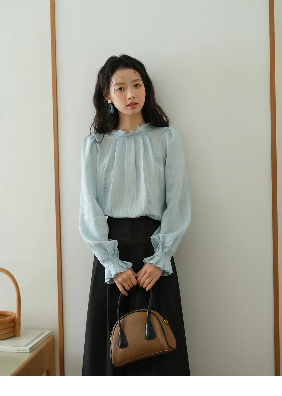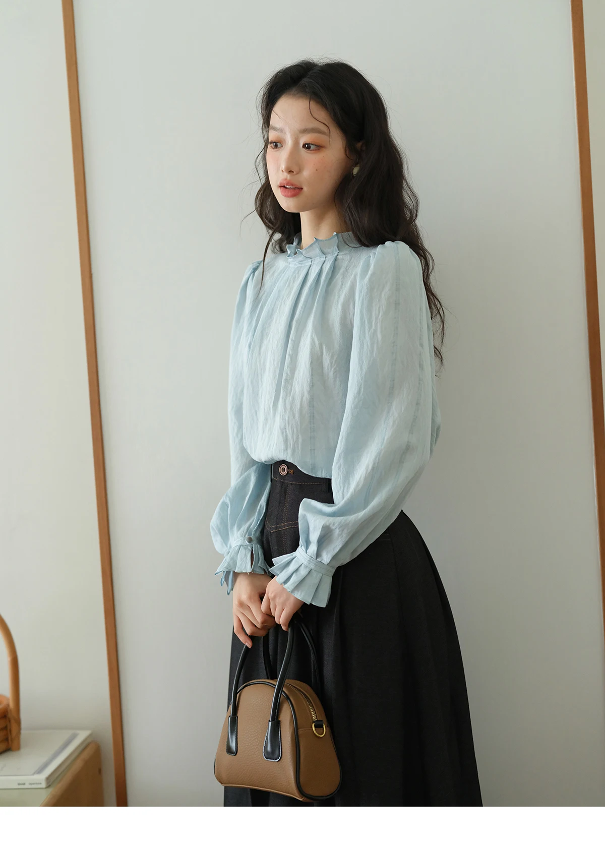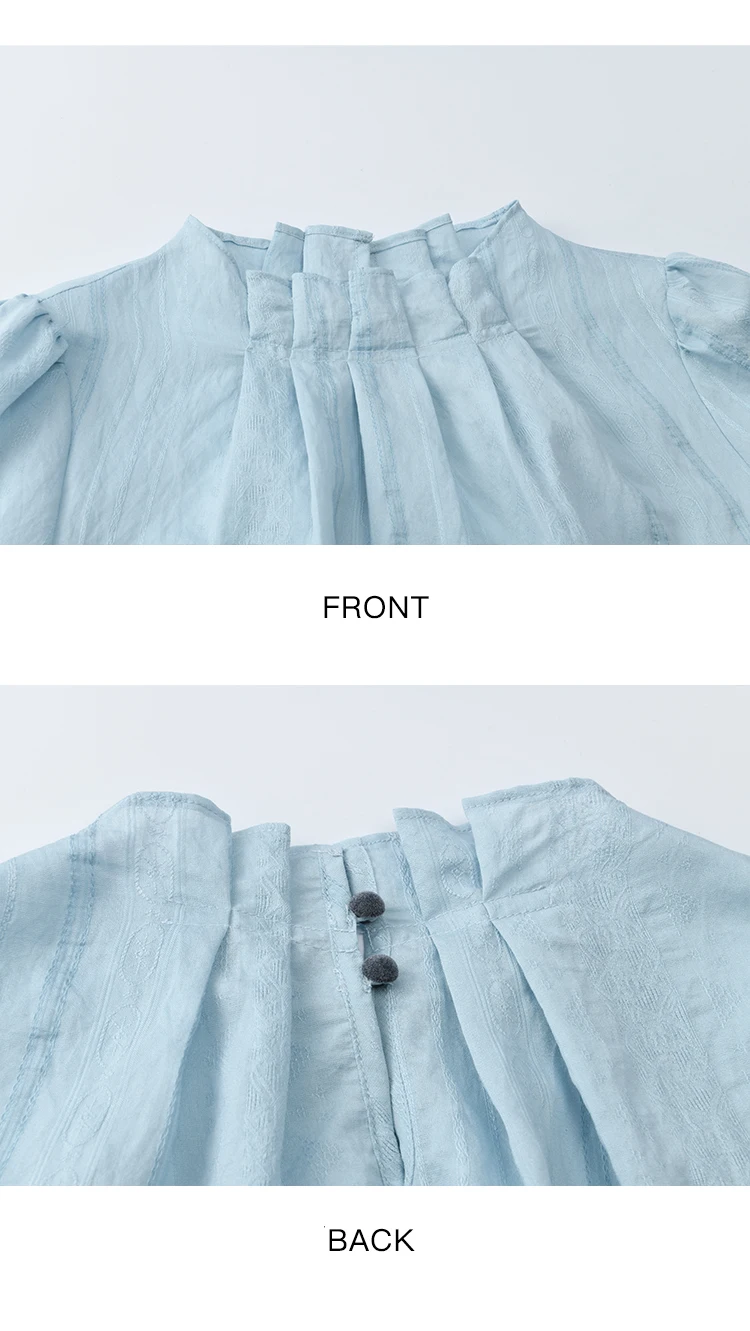 MISHOW Blue Jacquard Texture Blouses 2025 Autumn Black Fungus Edged Stand Collar Blouse Bubble Sleeves Commuting Top MXE41X1934