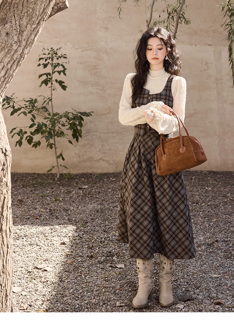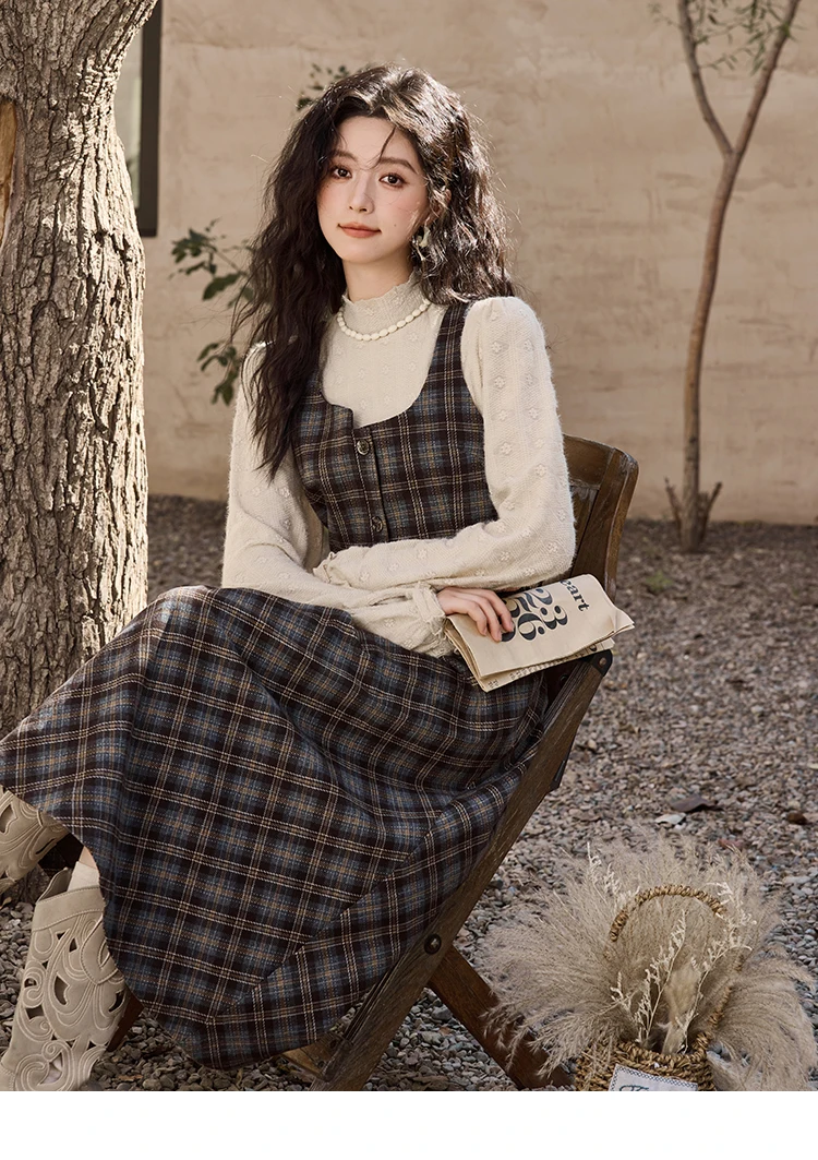 MISHOW Blue Plaid Vest Retro Skirt Separately Women 2024 Winter Retro Plaid Irregular Square Collar Top Midi Skirt MXD44W0454