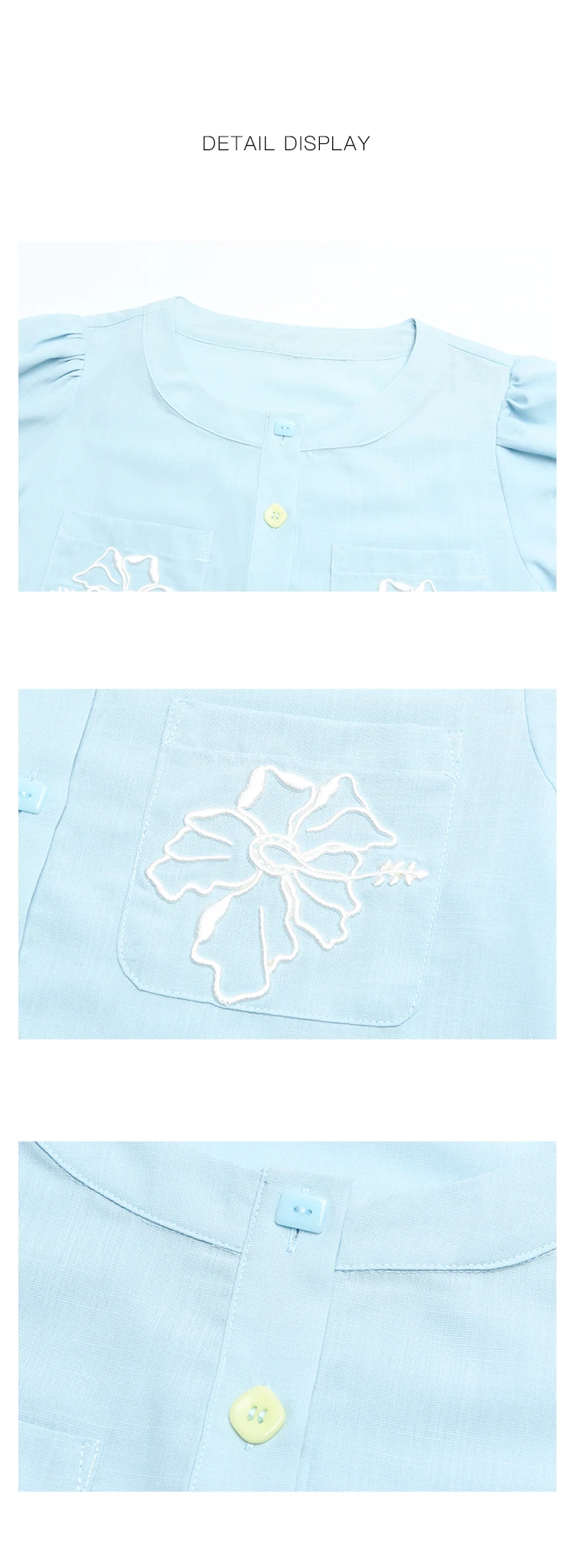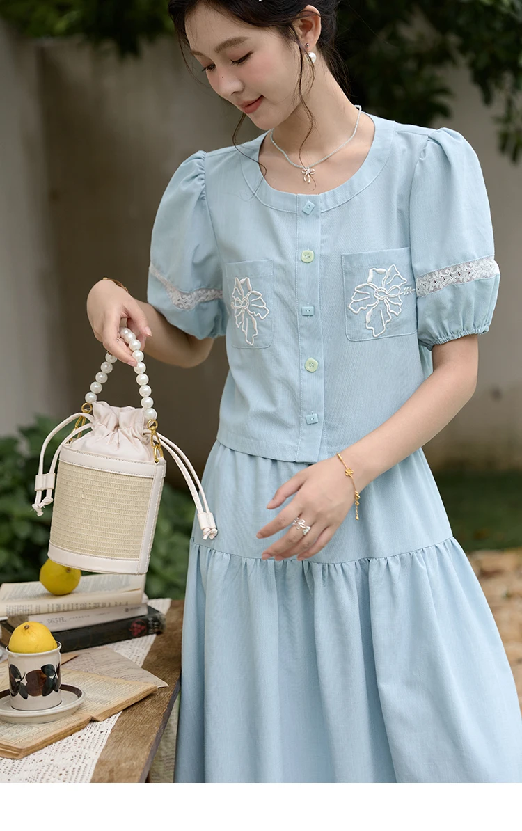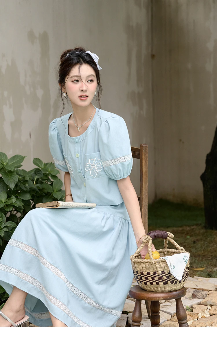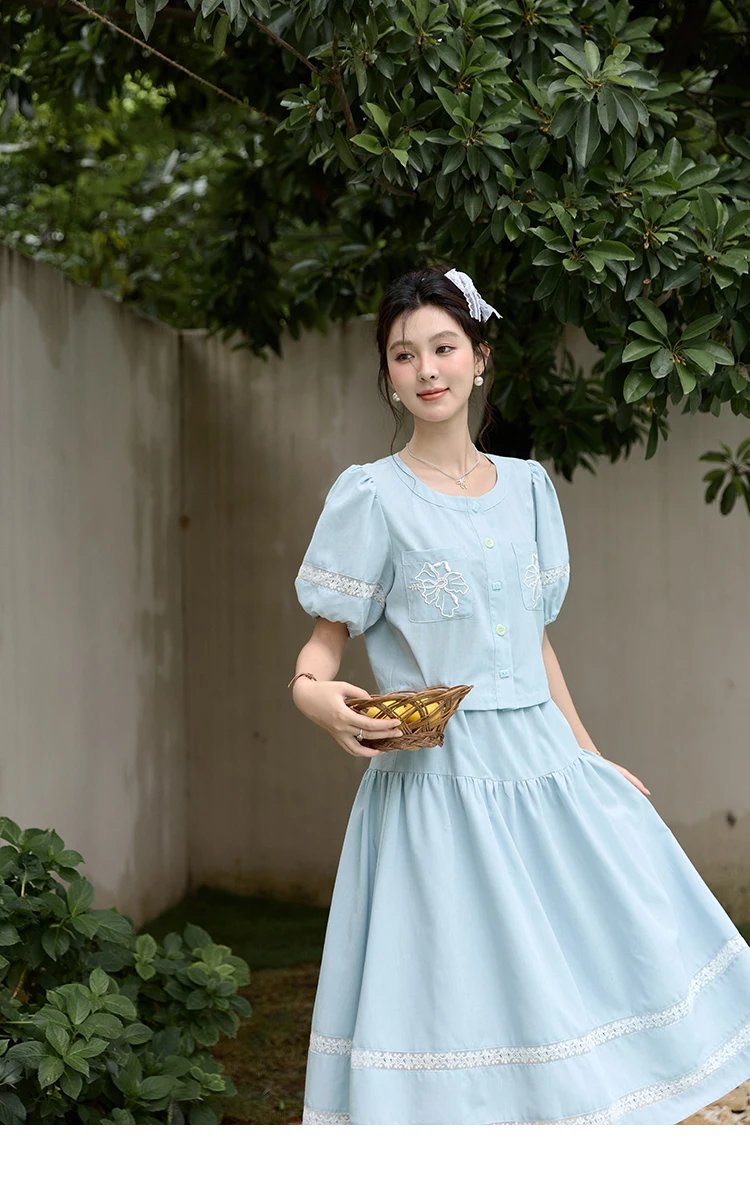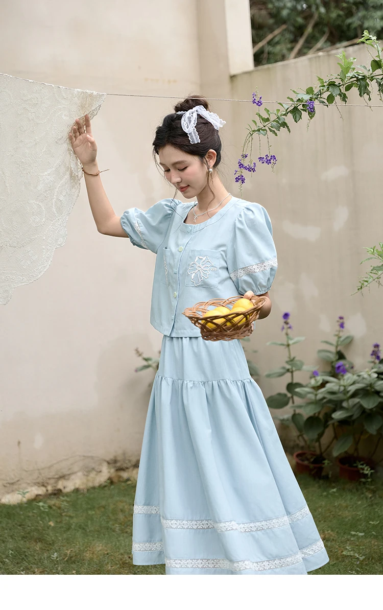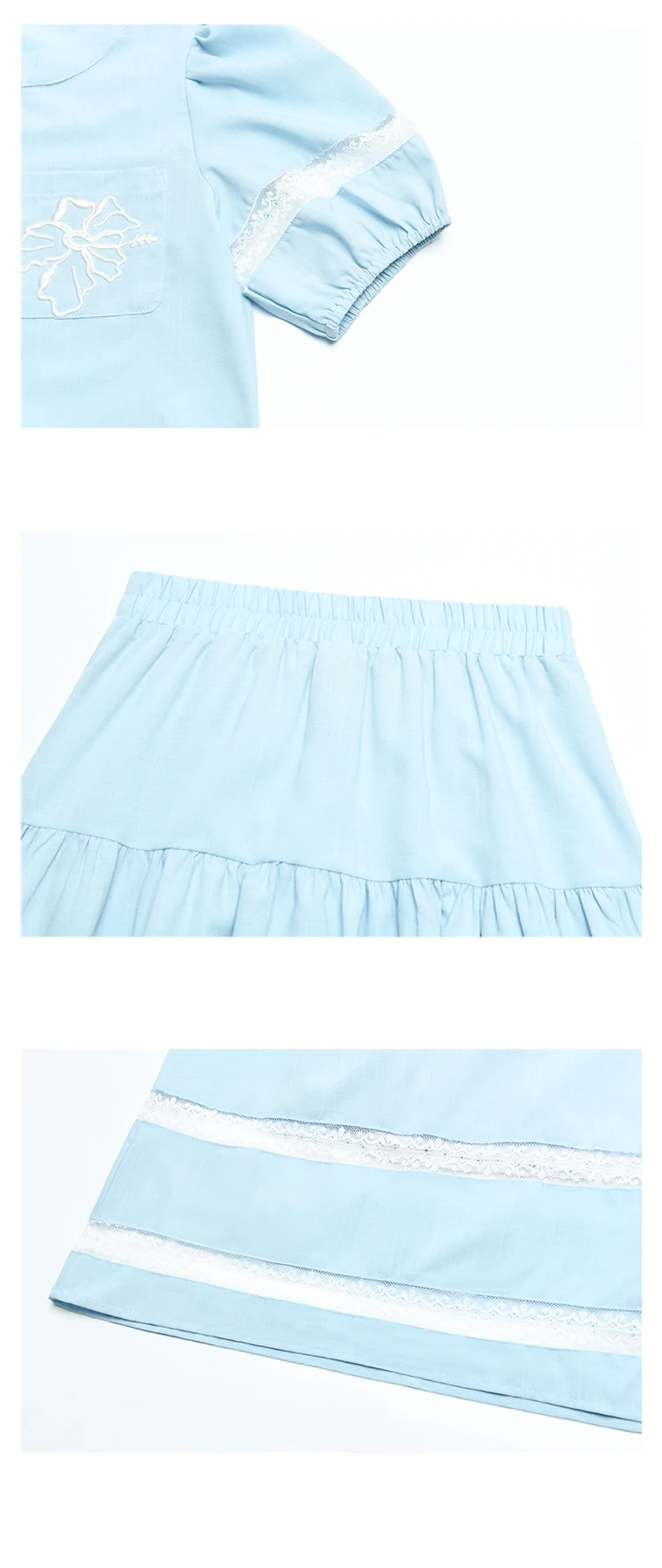 MISHOW Blue Pocket Patchwork Lace Shirt Elastic Waist Skirt Separately 2024 Summer Korean Round Neck Top Sweet Skirts MPD22B0450