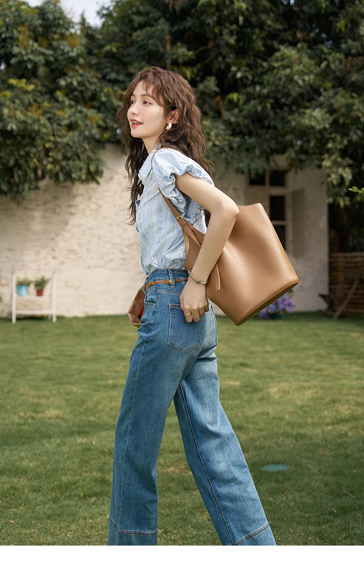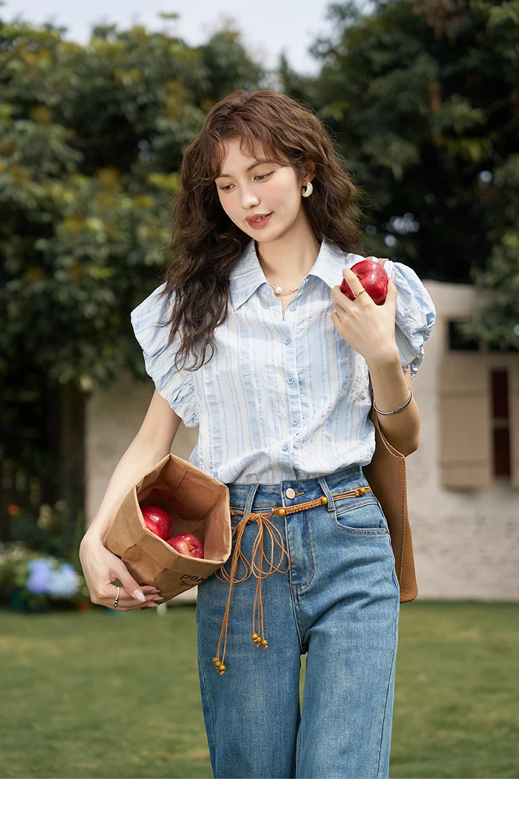 MISHOW Blue Striped Short Sleeve Shirt for Women Summer 2025 Bubble Flower Bud Sleeves Lapel Neck Shirt with Tube Top MXD24C0204
