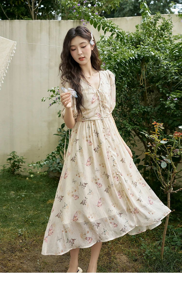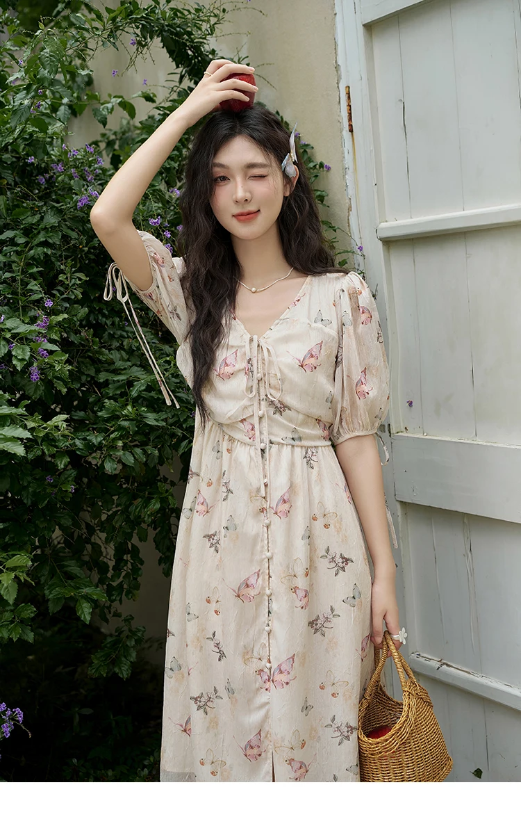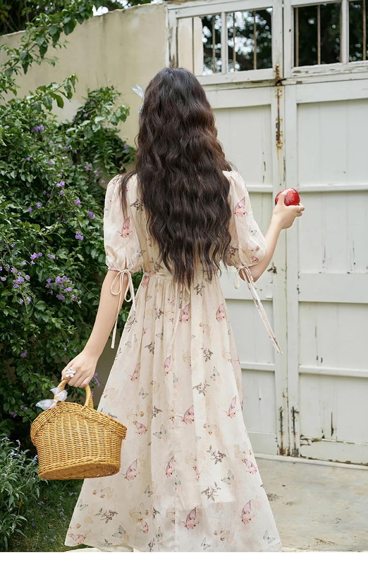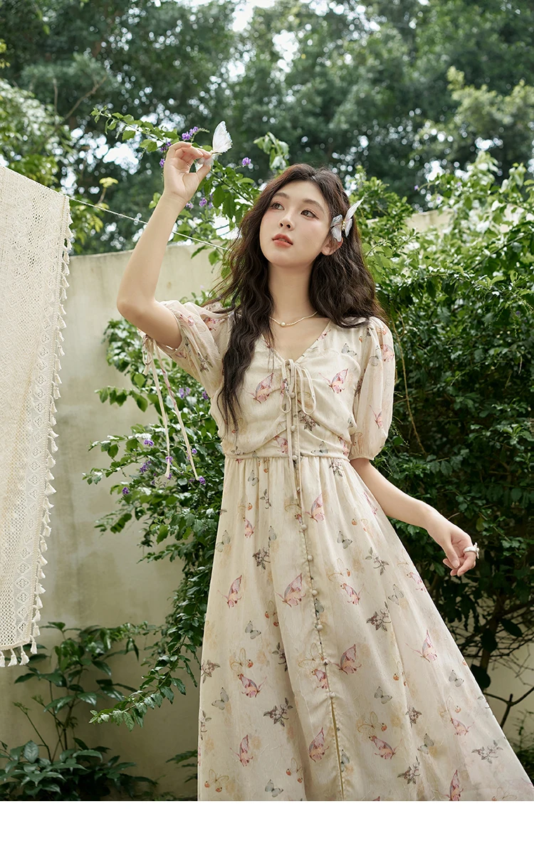 MISHOW Butterfly Printing Dress for Women 2025 Summer Luxury Elegant V-neck Lace-up Bubble Sleeves Slim Long Dress MXD15L1778