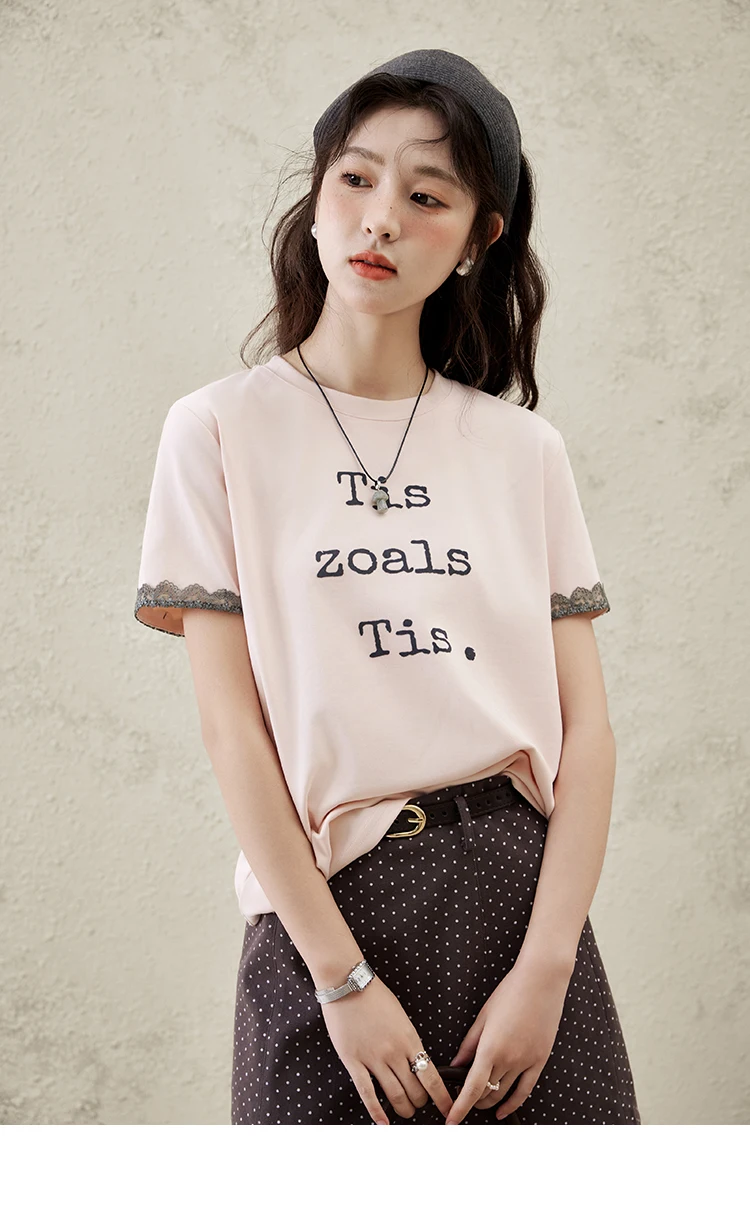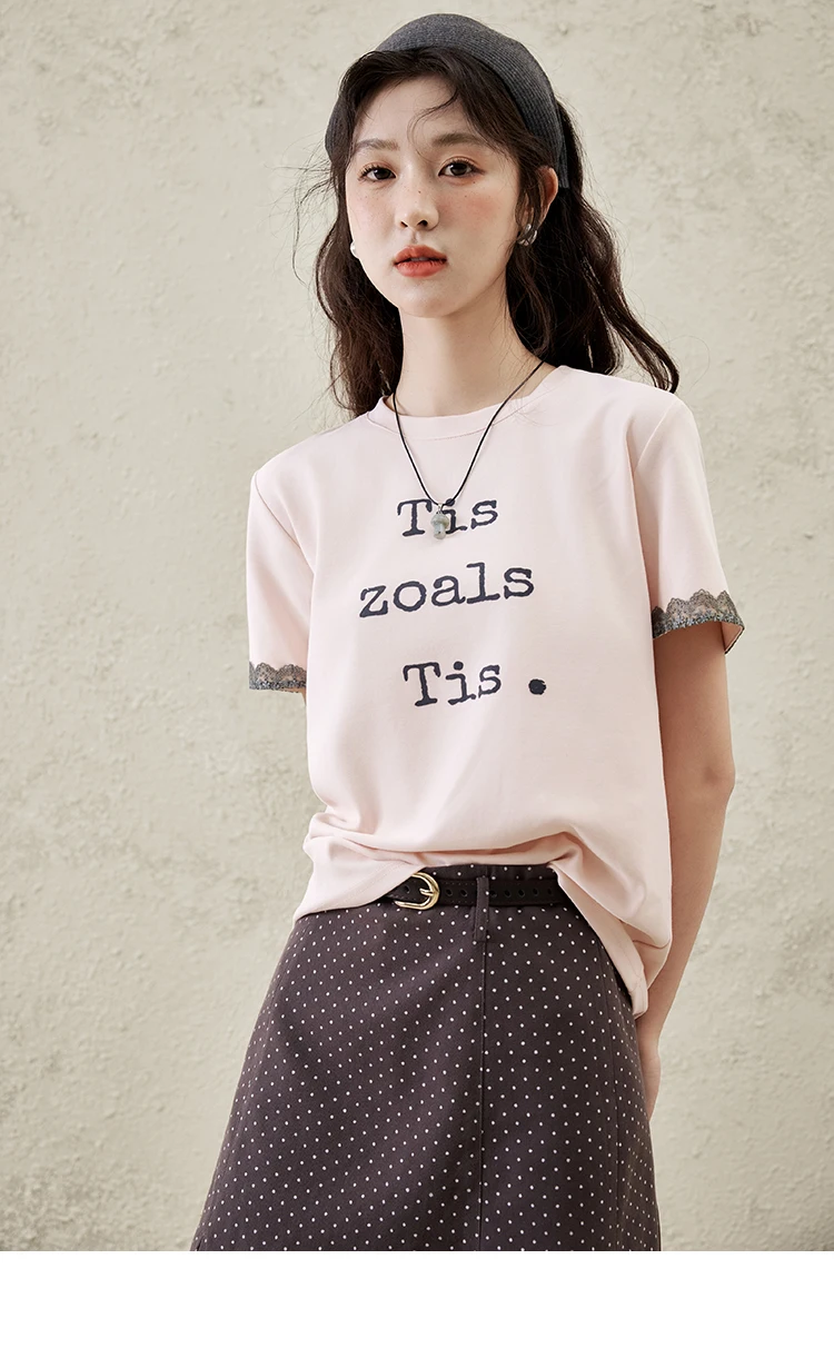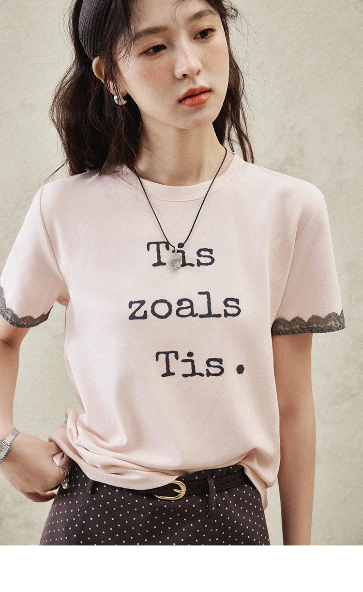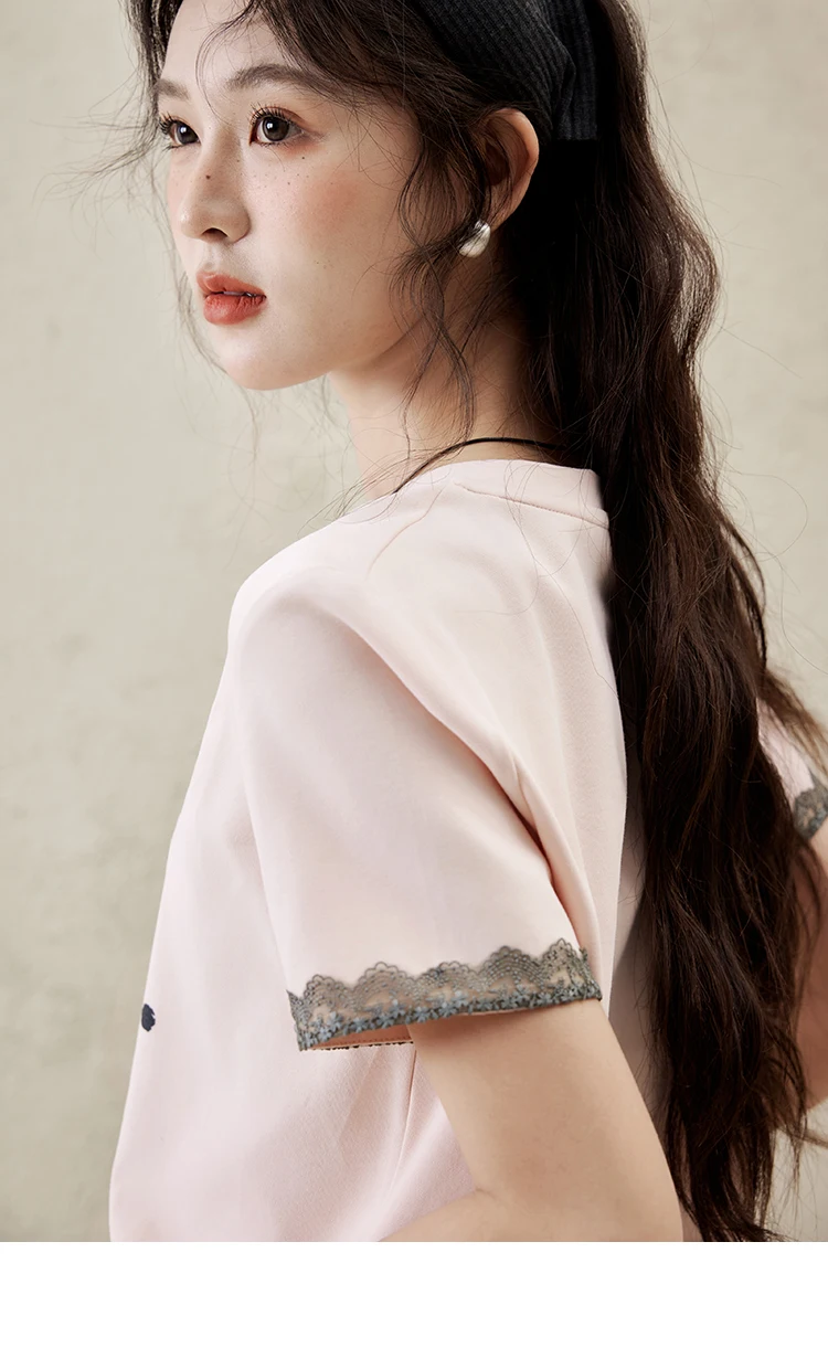 MISHOW Casual Pink Letter T-shrit Women Summer 2025 New Short Sleeve Round Neck Shirts Woman Fashion Lace Tops Lady MXE32T0529