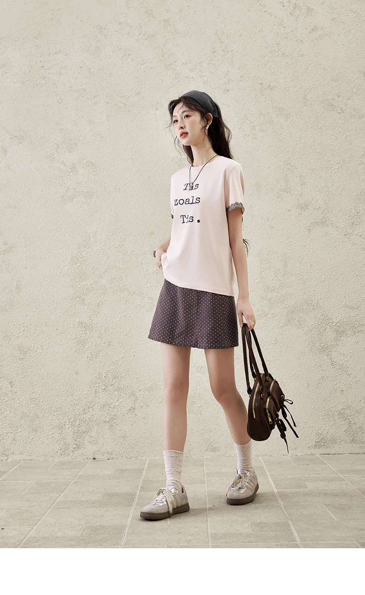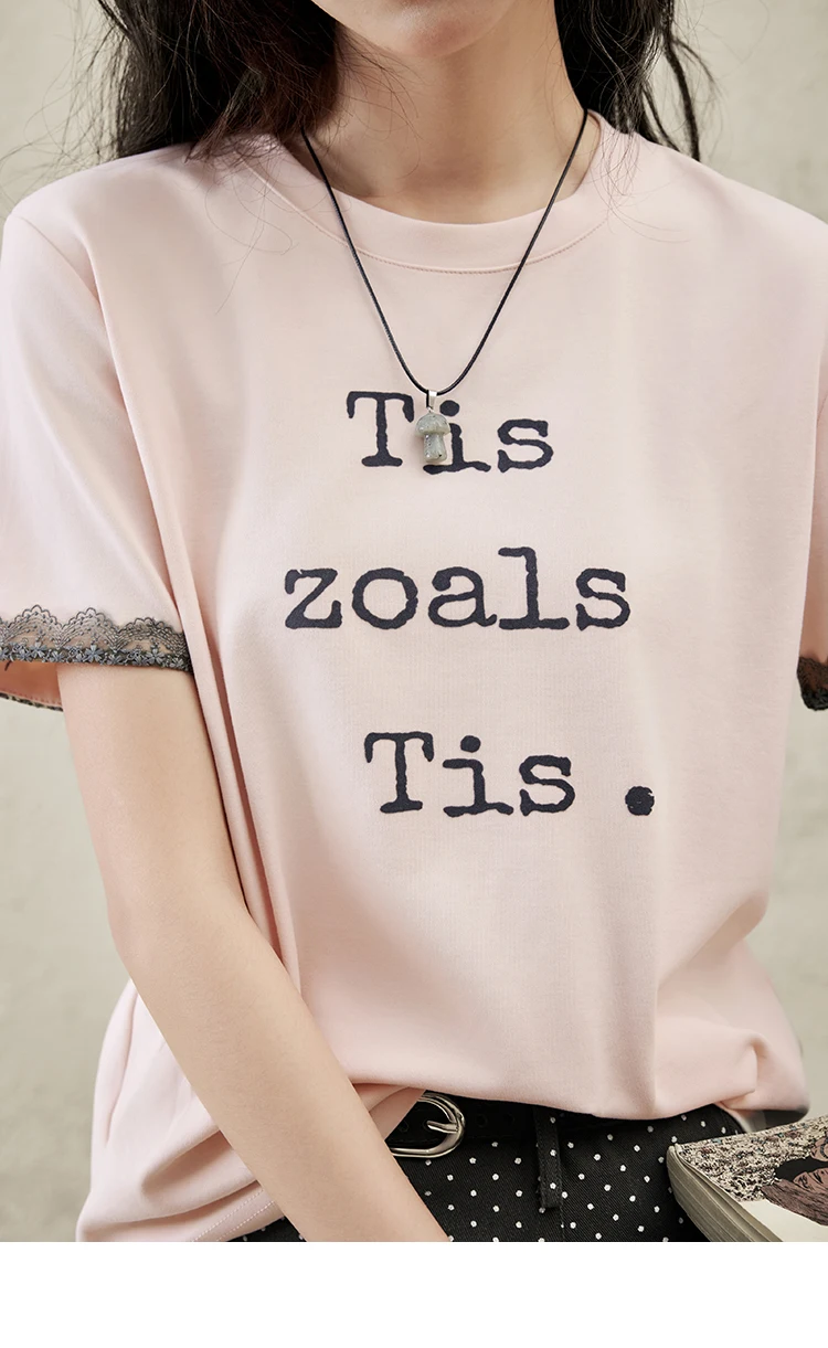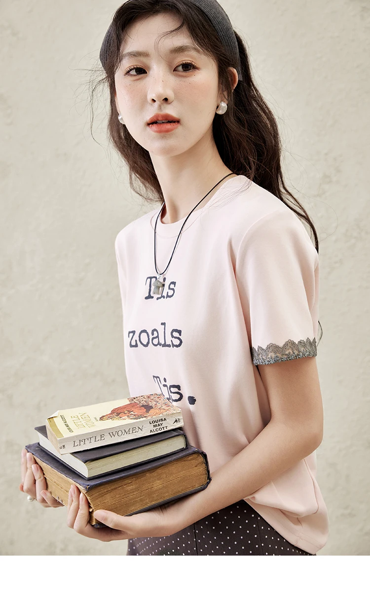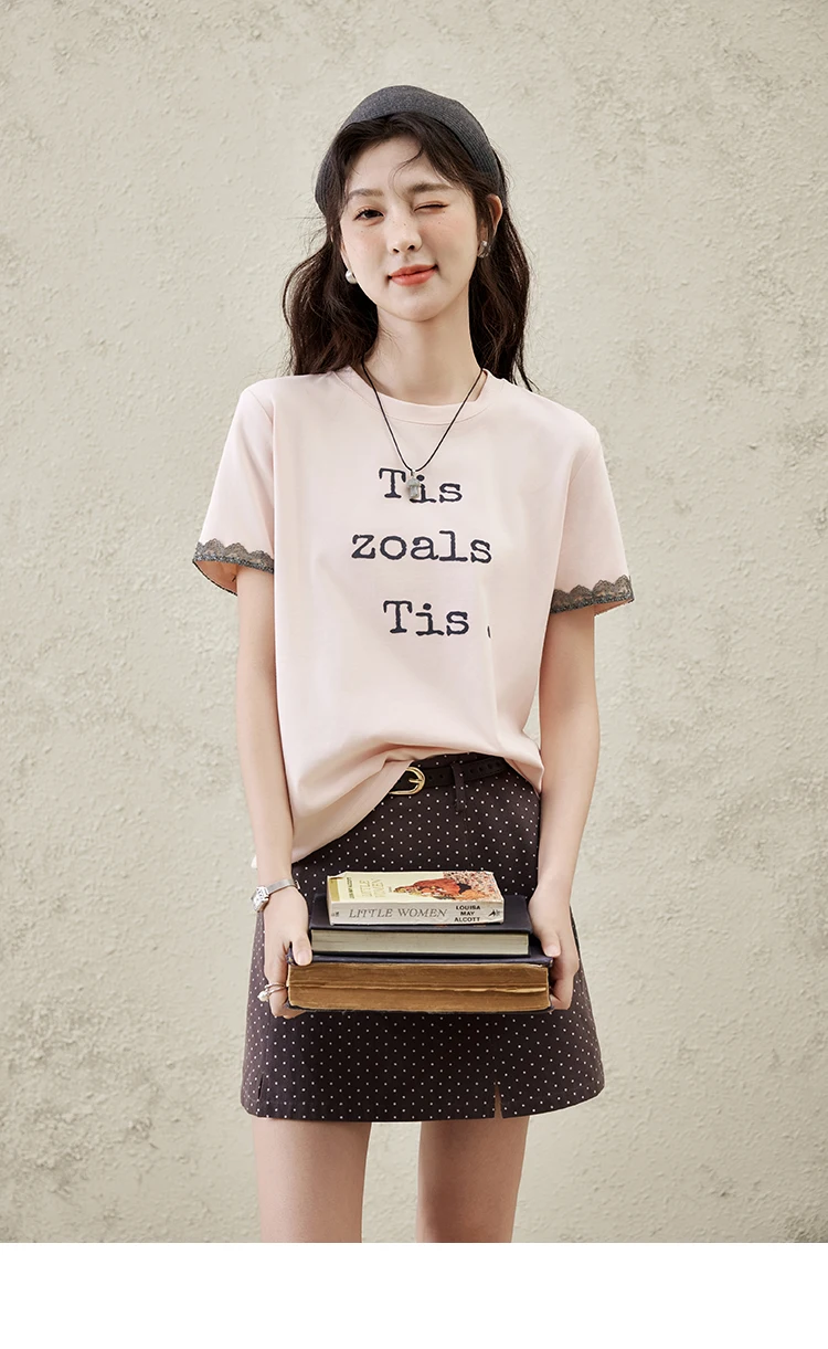 MISHOW Casual Pink Letter T-shrit Women Summer 2025 New Short Sleeve Round Neck Shirts Woman Fashion Lace Tops Lady MXE32T0529