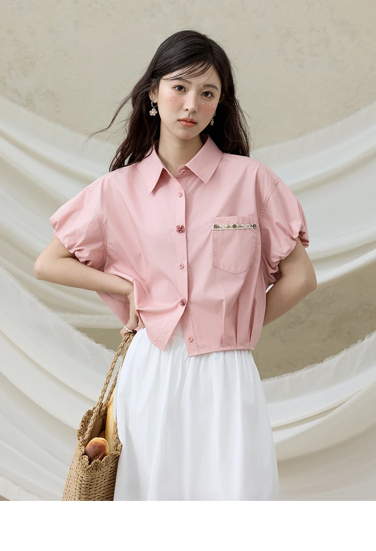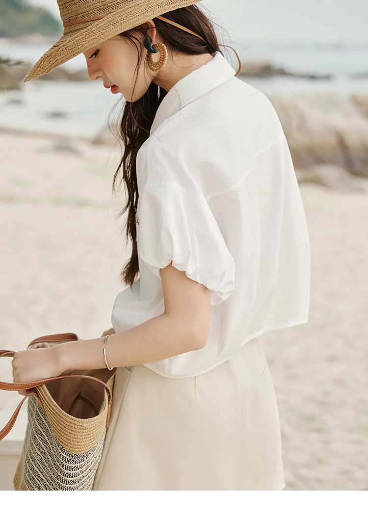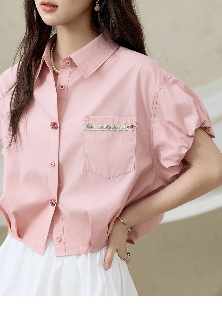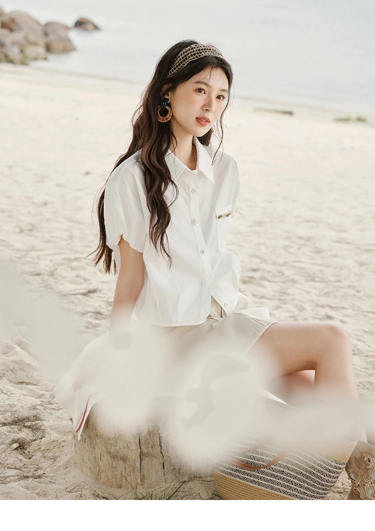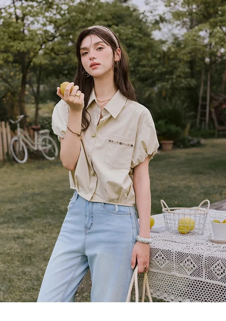 MISHOW Casual Summer Blouses Women 2025 New Short Puff Sleeve Turn Down Collar Shirt Female Fashion Shell Ribbon Tops MXE33C0773