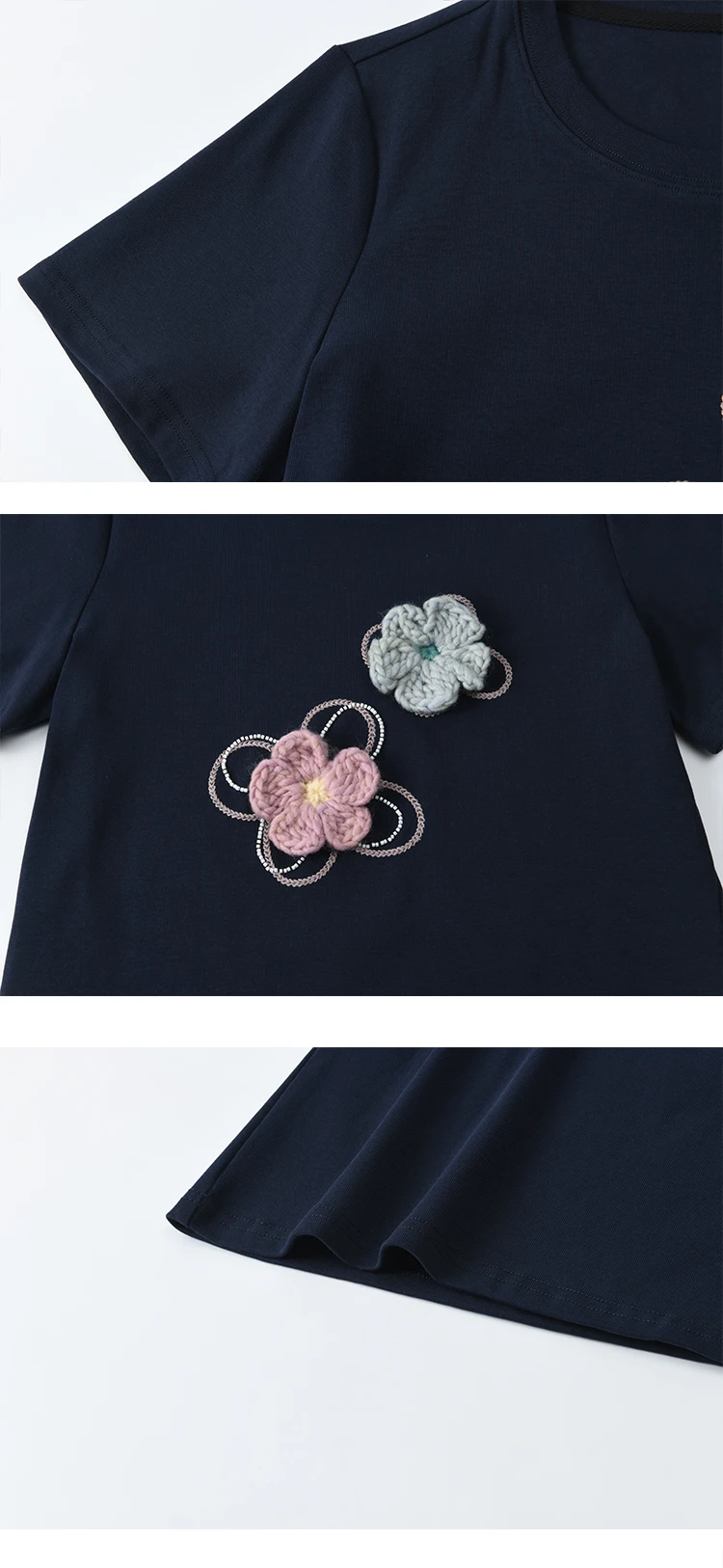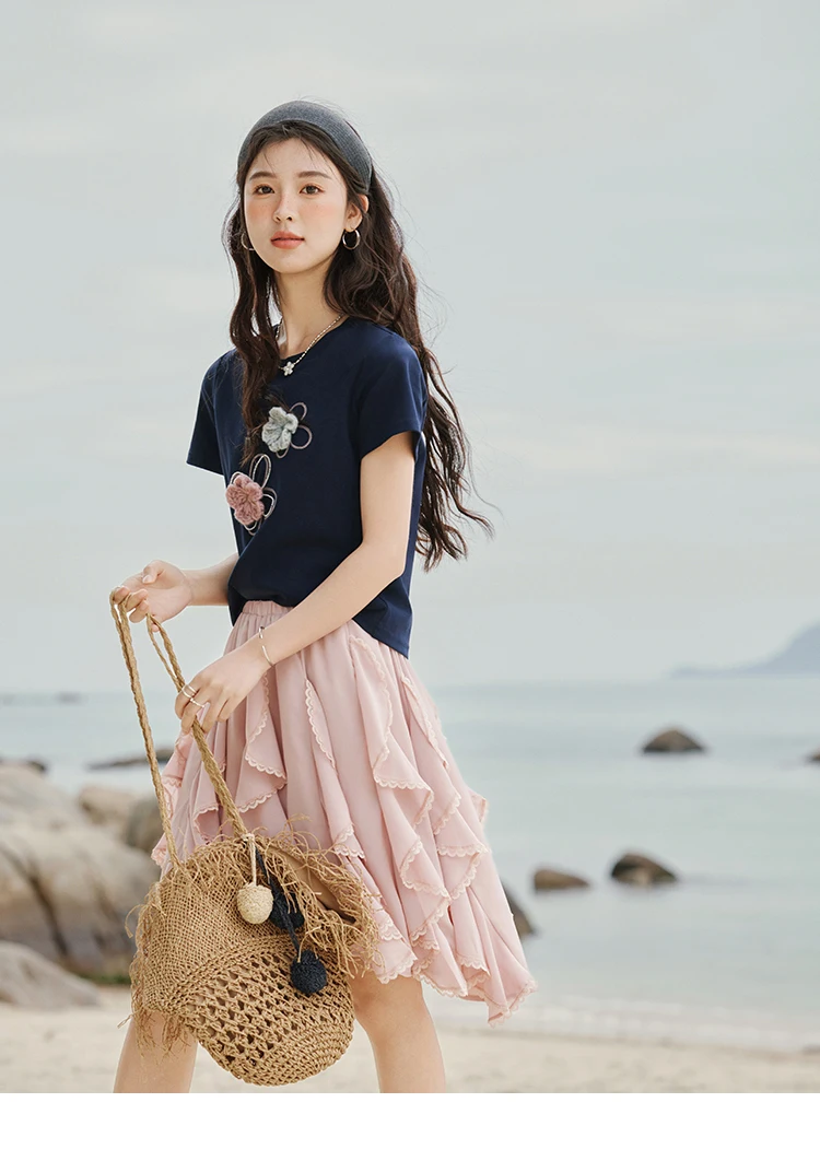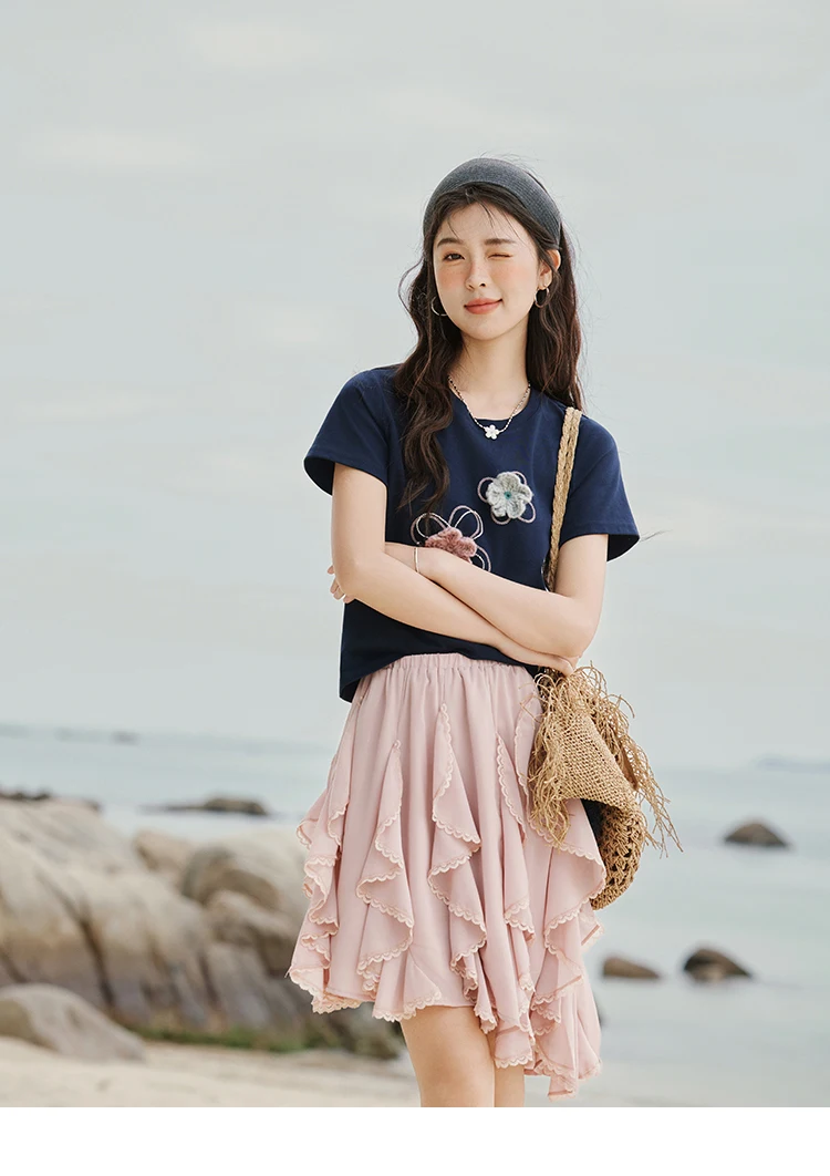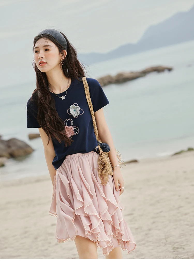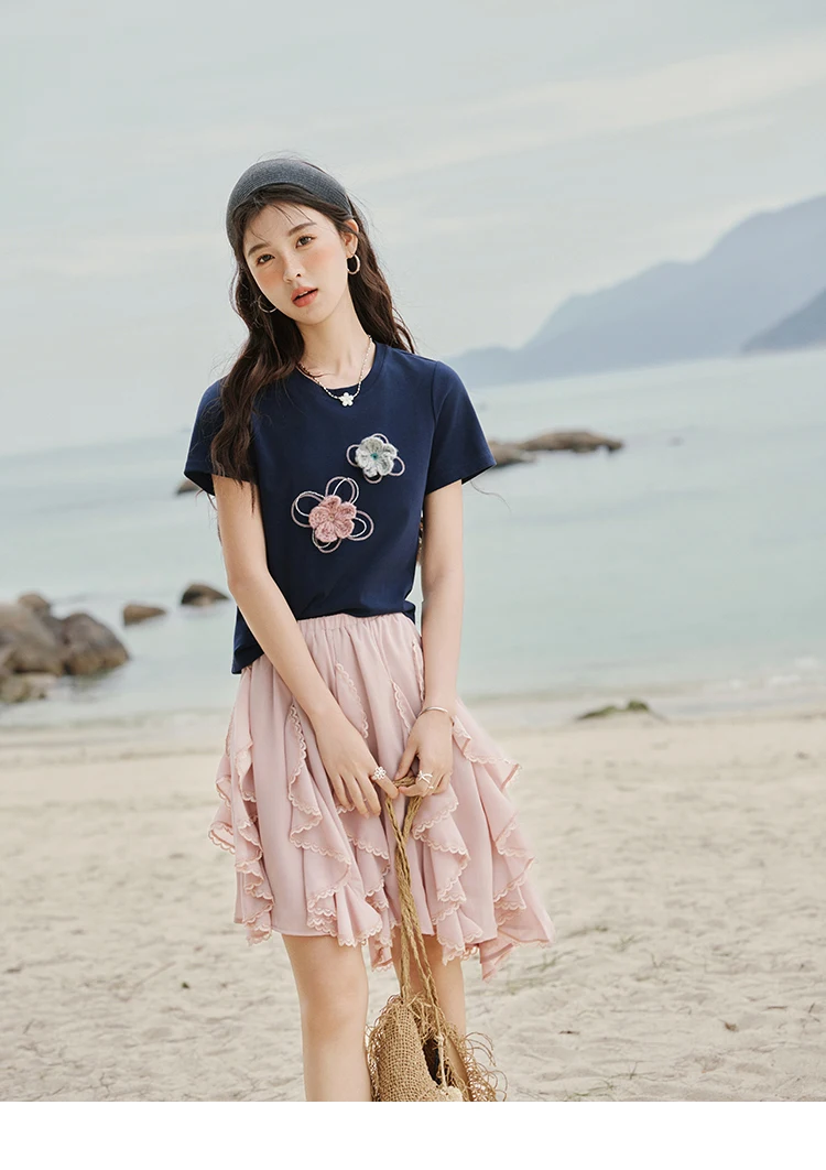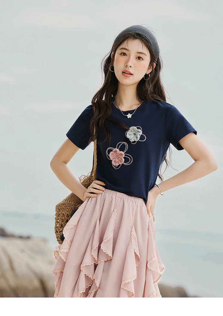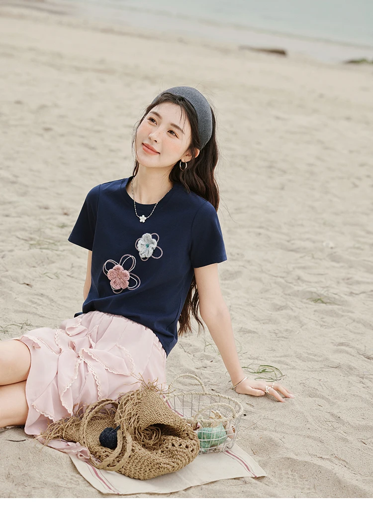 MISHOW Casual Summer Print T-shirts Women New 2025 Short Sleeve Round Neck Flower Beaded Shirts Female Fashion Tops MXE33T0499