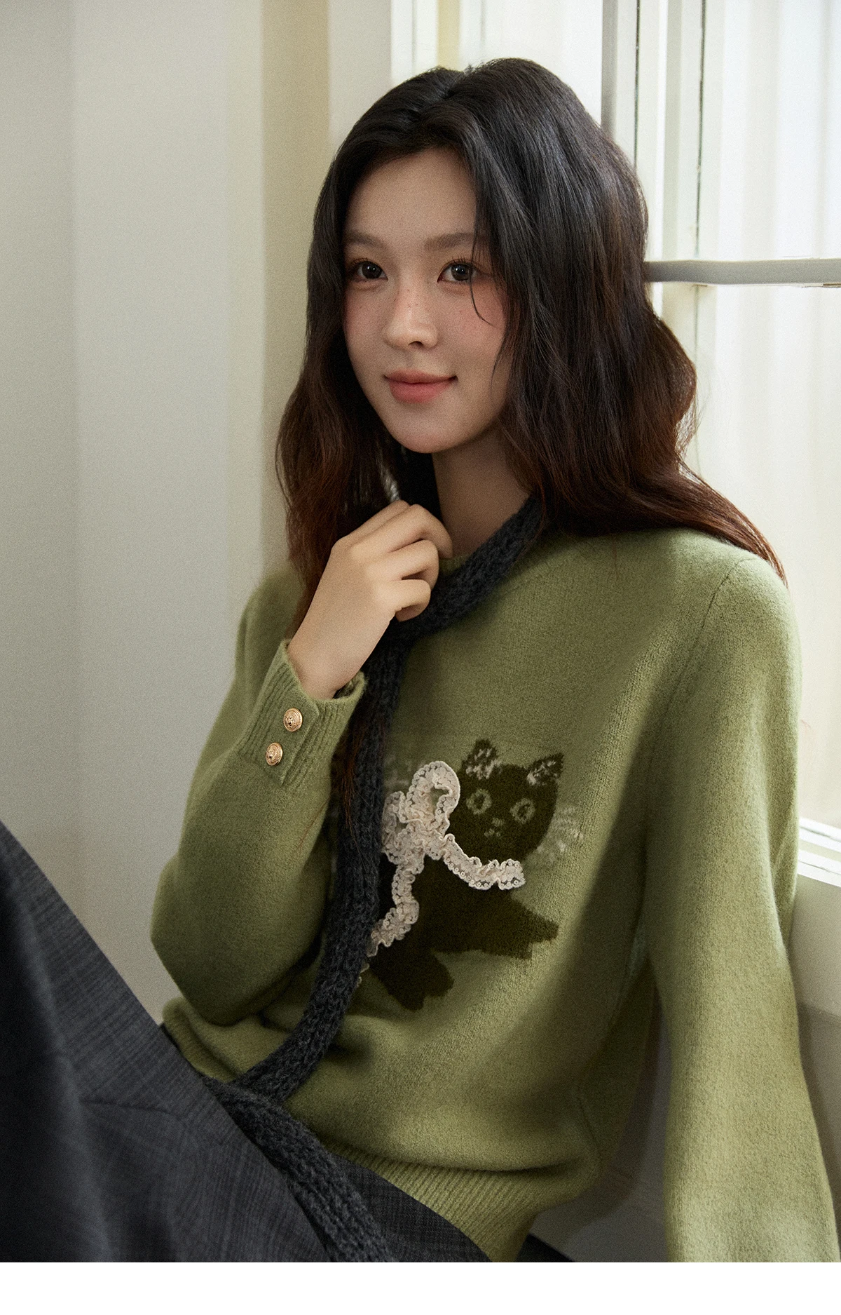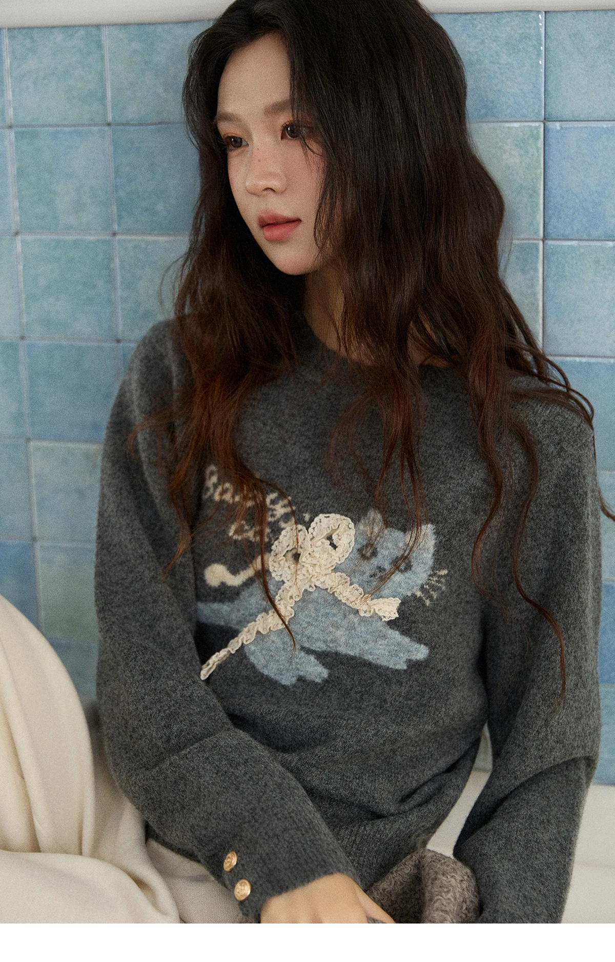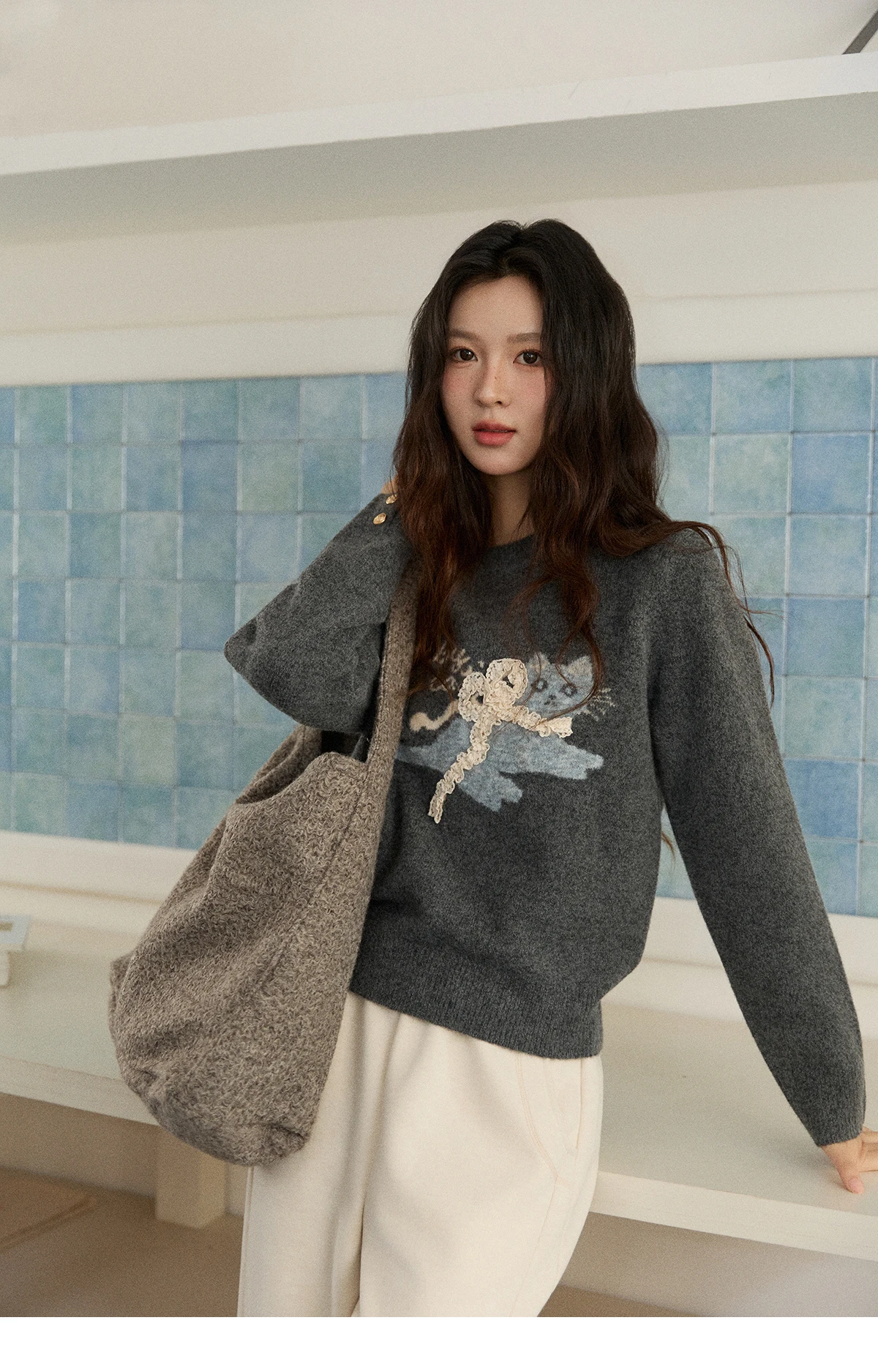 MISHOW Cat Jacquard Pullovers for Woman 2025 Winter Lazy Style Round Neck Three-dimensional Bow Loose Knit Sweater MXE86Z2750