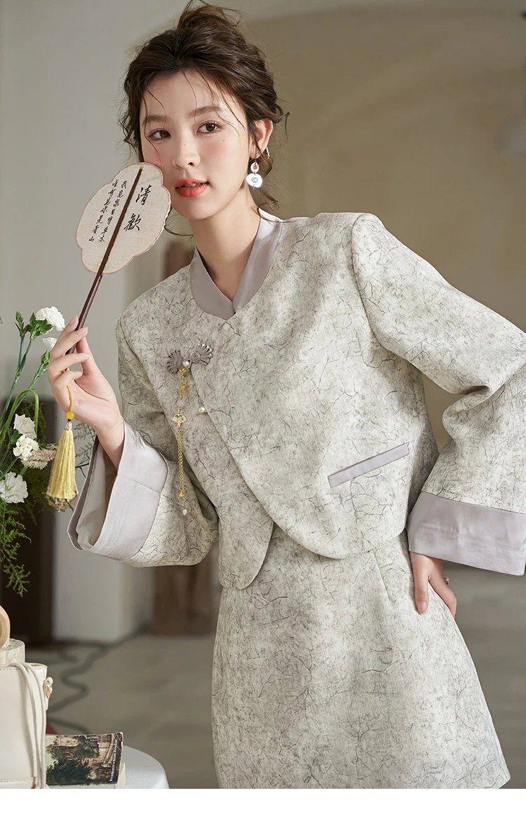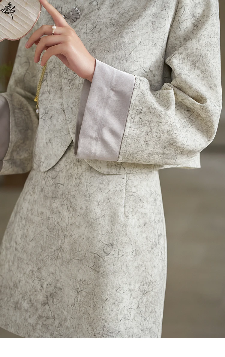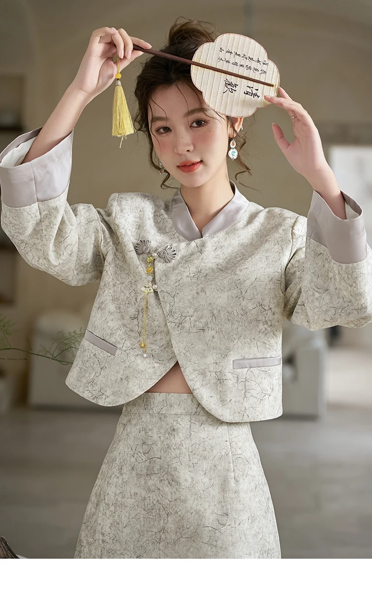 MISHOW Chinese Stand Up Collar Jacket A-line Skirt Separately Spring Textured Glossy Jacquard Irregular Placket Top MXD15W0373