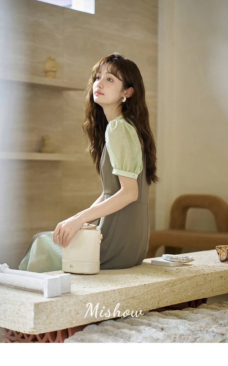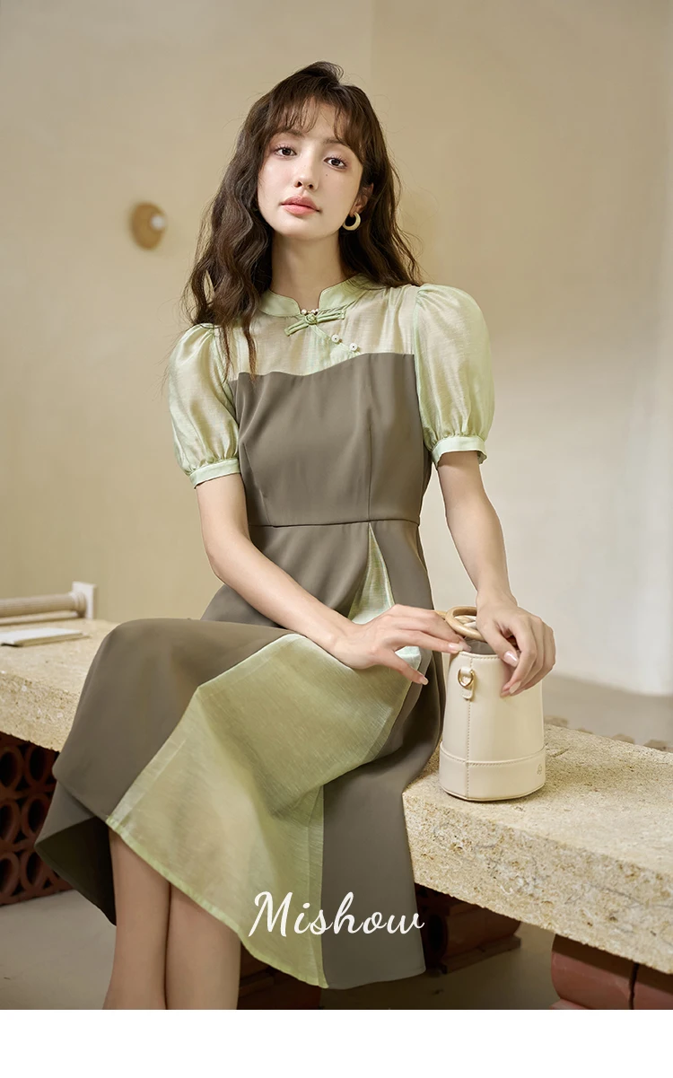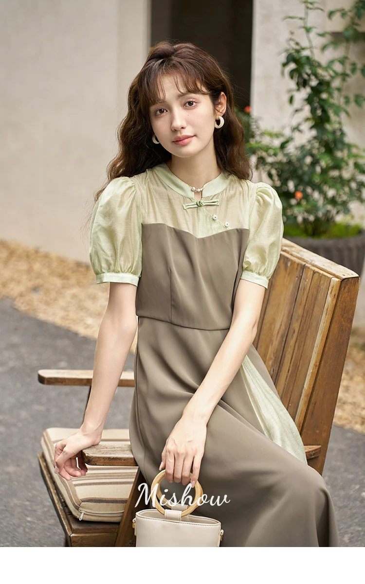 MISHOW Chinese Style Dress for Women 2023 Summer Waist Puff Sleeve Patchwork Fake Two Pieces French Slim Long DressES MXC35L1354