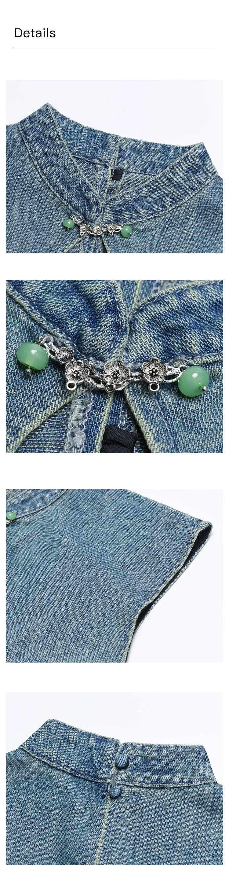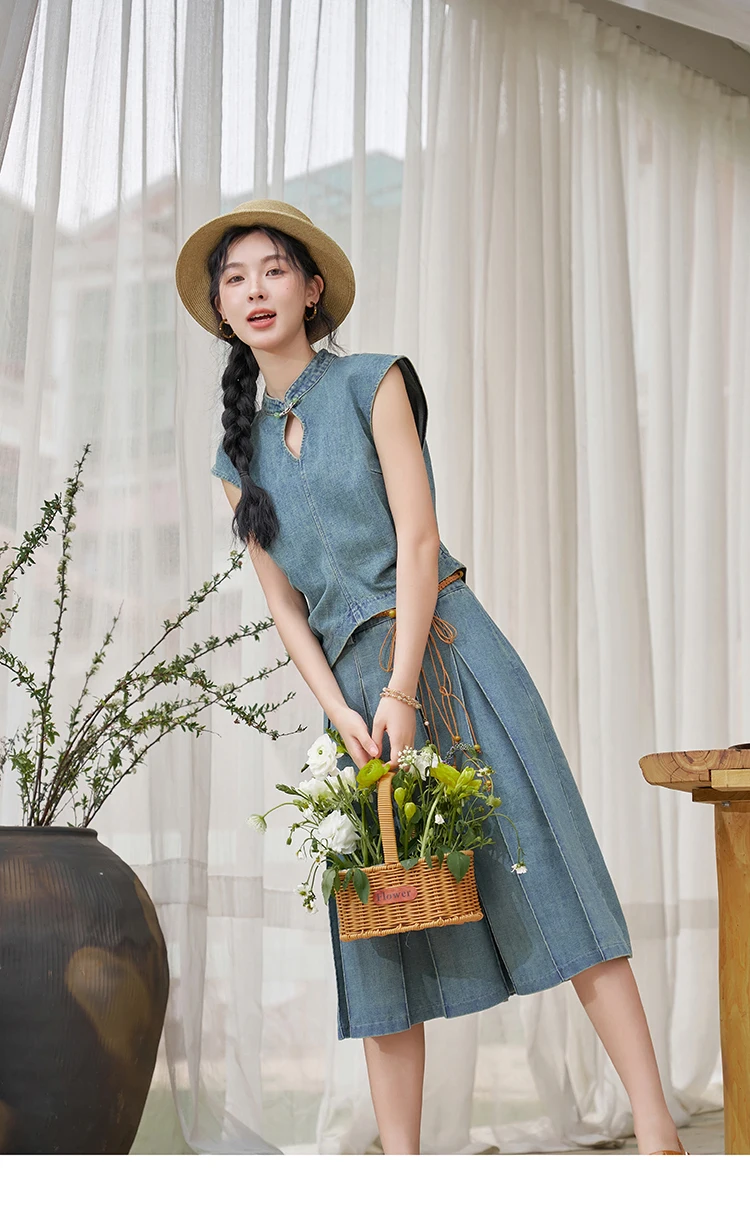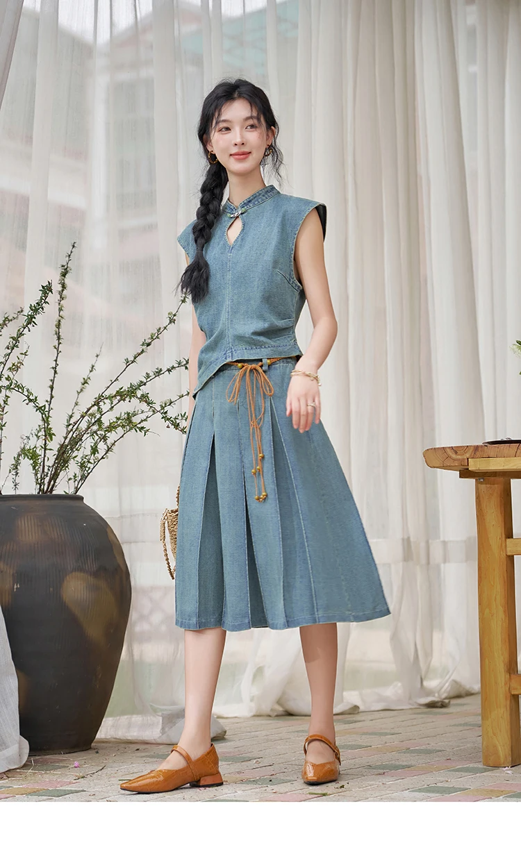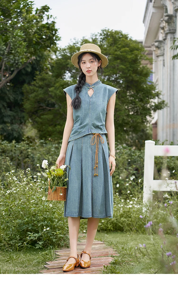 MISHOW Chinese Water Droplet Hollowed Stand Collar Vest Pleated Denim Skirt Separately Summer Retro Denim Collection MXD21X1465
