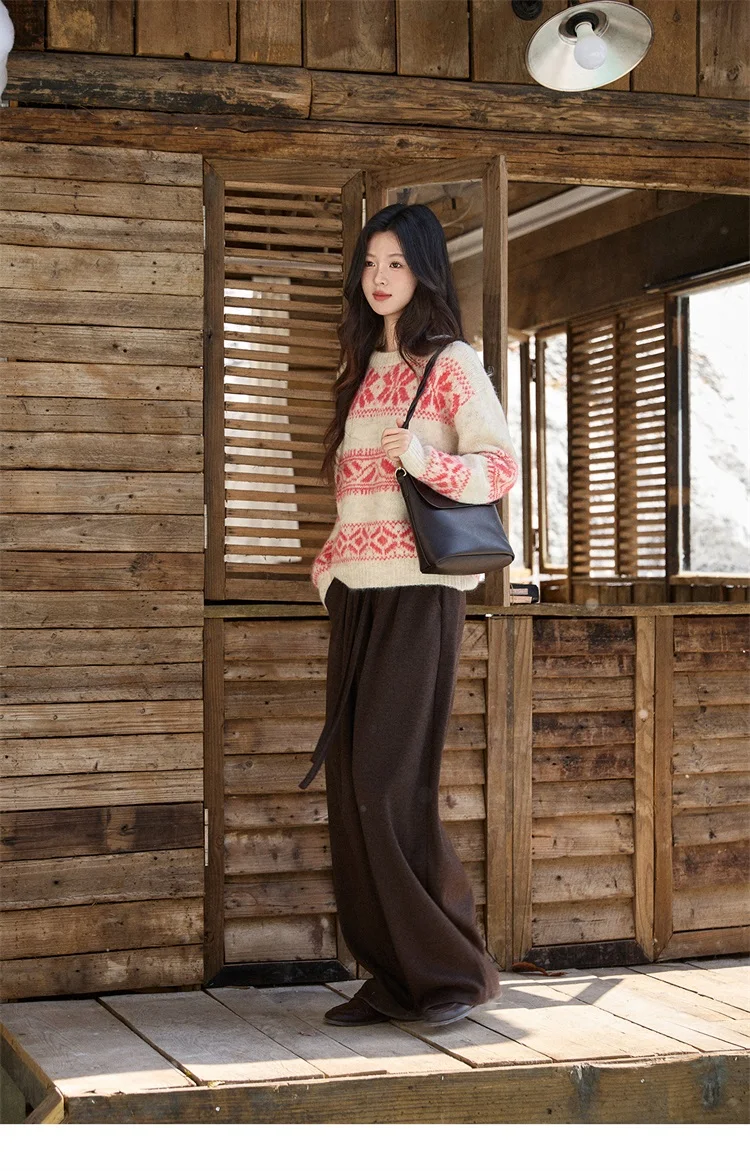 MISHOW Christmas Geometric Jacquard Sweater for Women 2025 Winter Beige White Wool Round Neck Loose Knitted Sweater MXE93Z2938