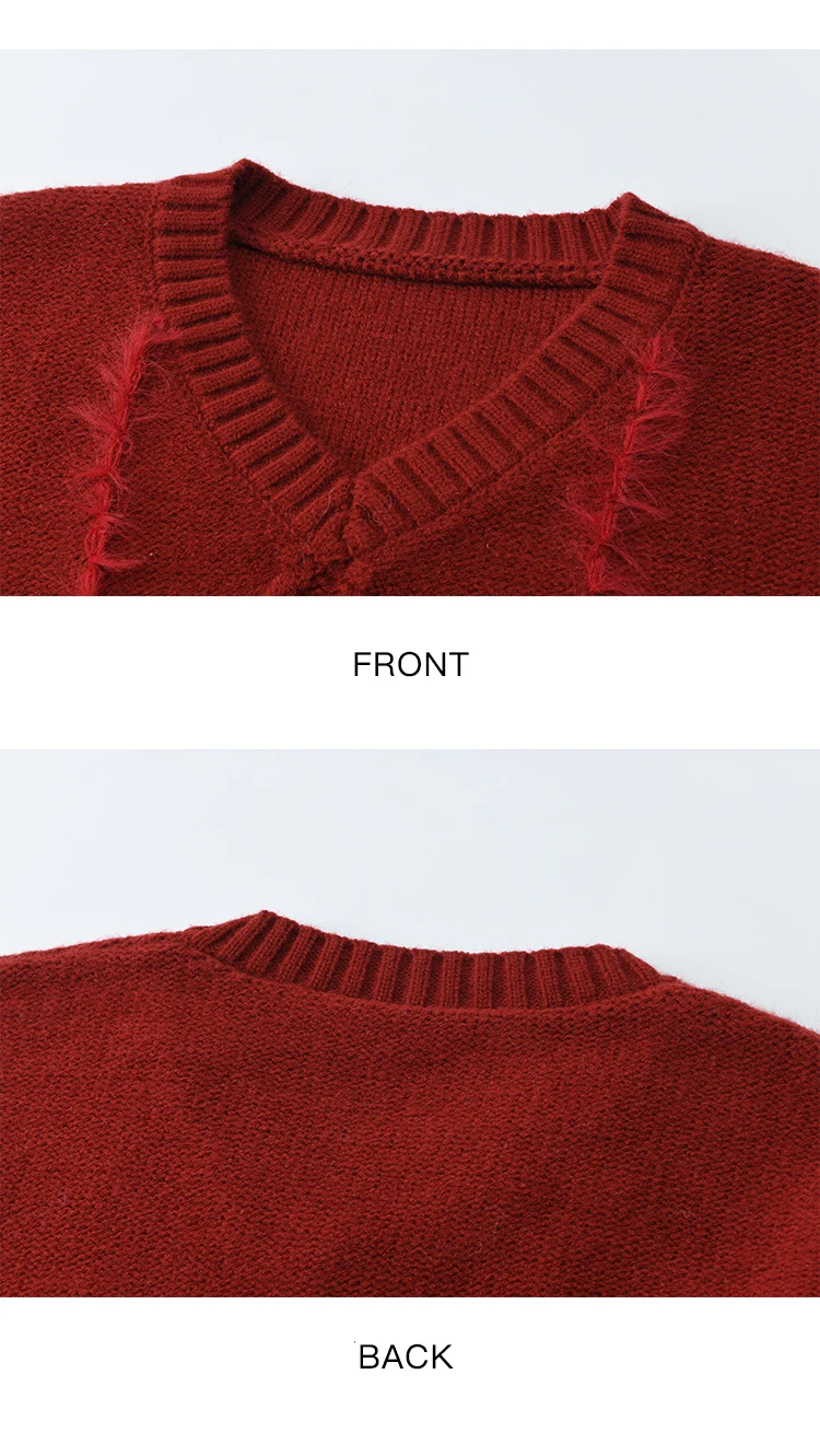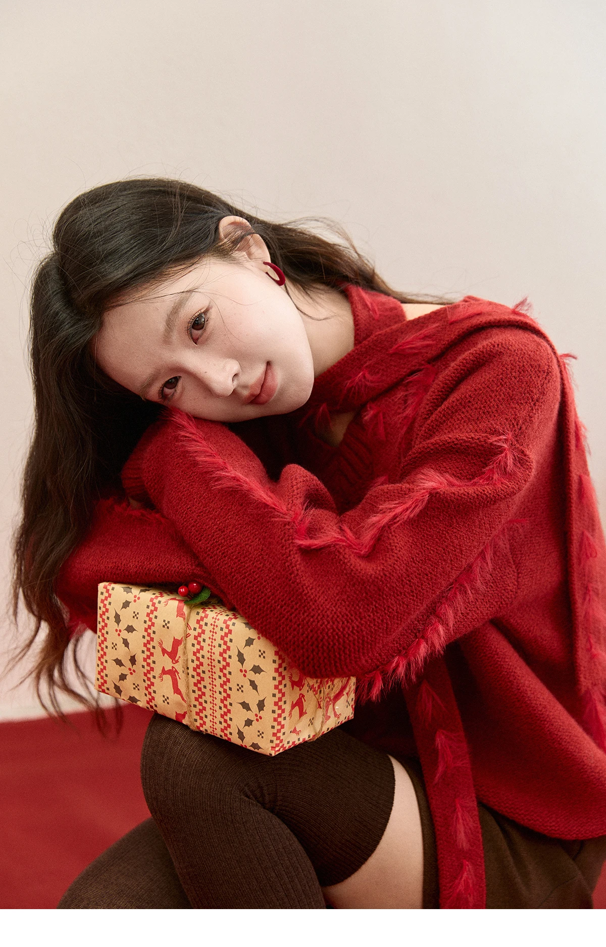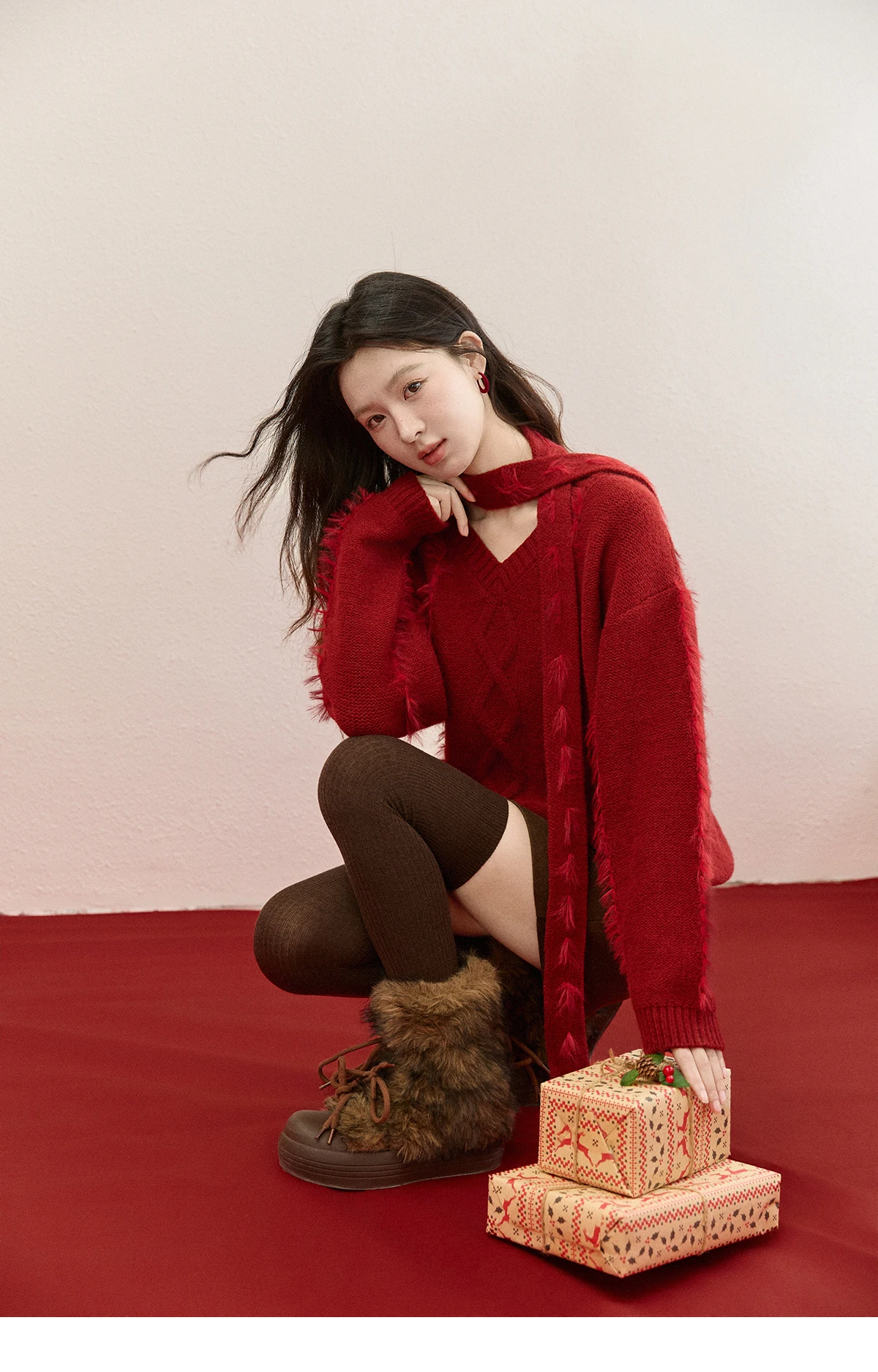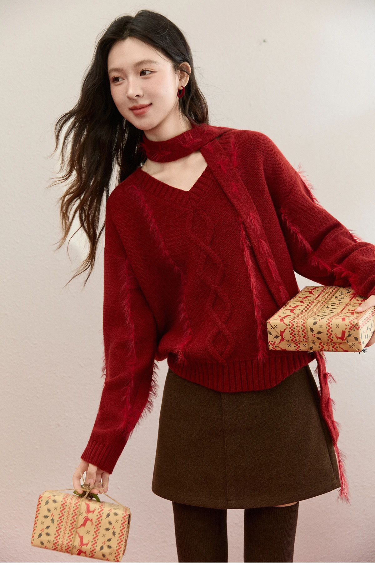 MISHOW Christmas Knitted Sweater Women 2025 Winter Burgundy V-neck Loose Tops Mink Fur Tassel with Scarf Tie Sweaters MXE93Z2809