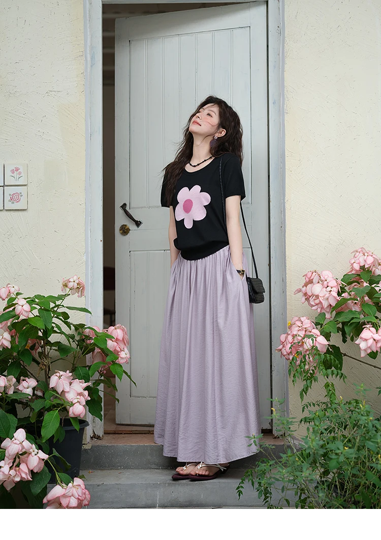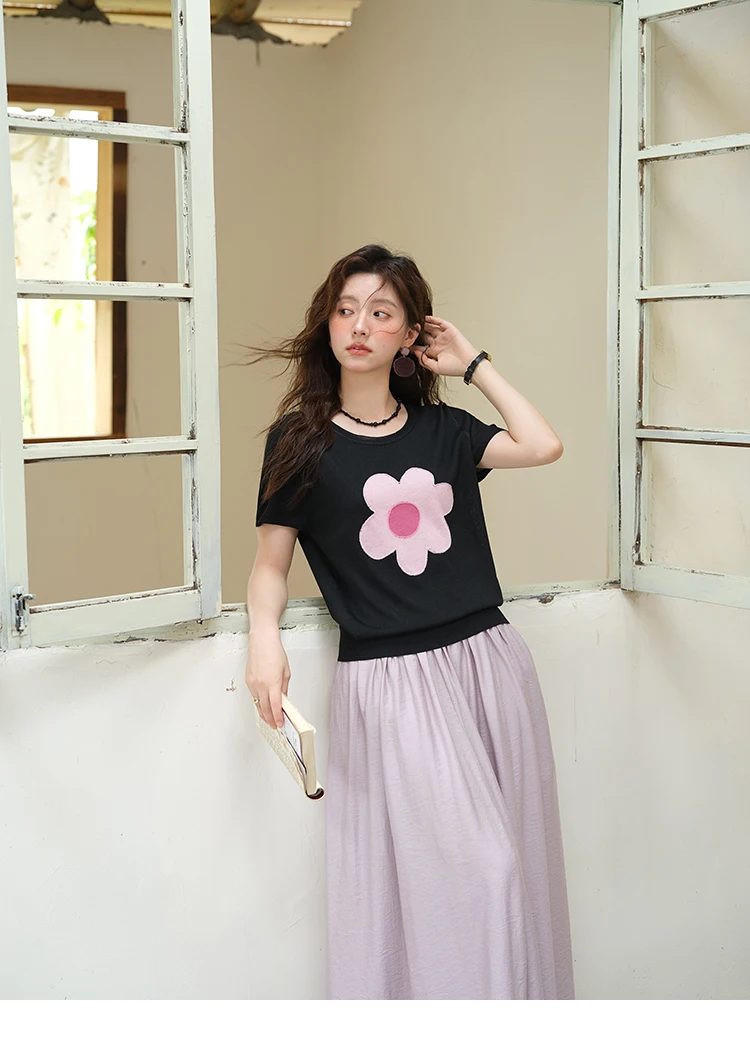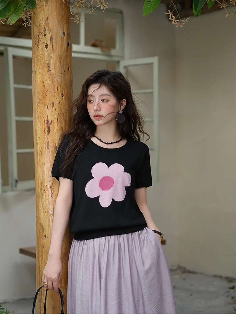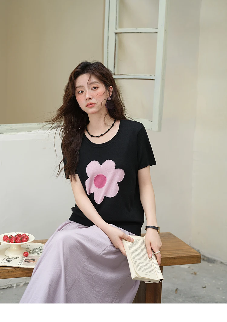 MISHOW Contrast Color Flower Knitted T-shirts for women 2025 Summer New Round Neck Top Women's Clothing Commute Tee MXE39Z1311