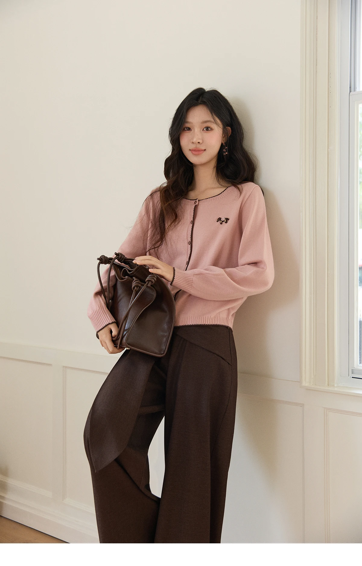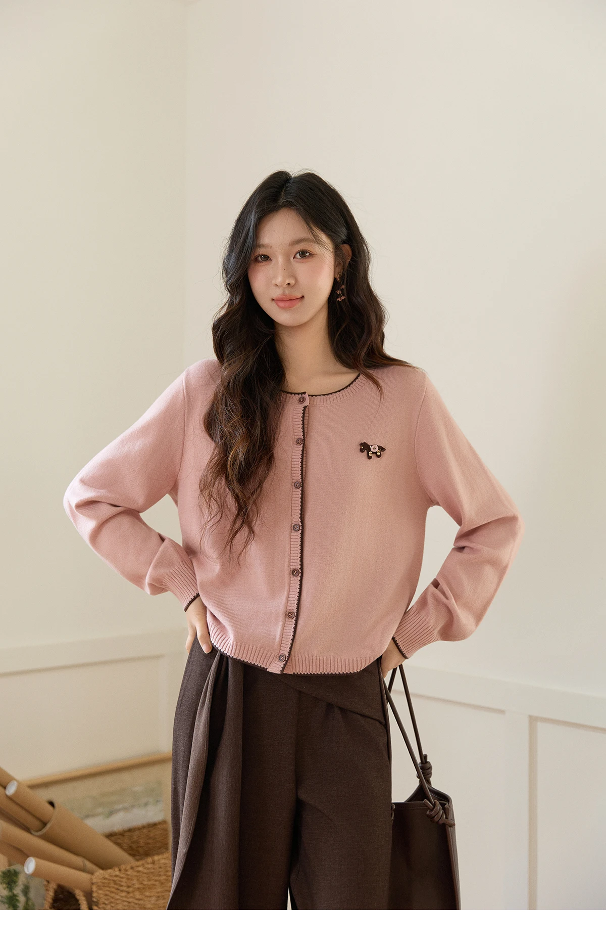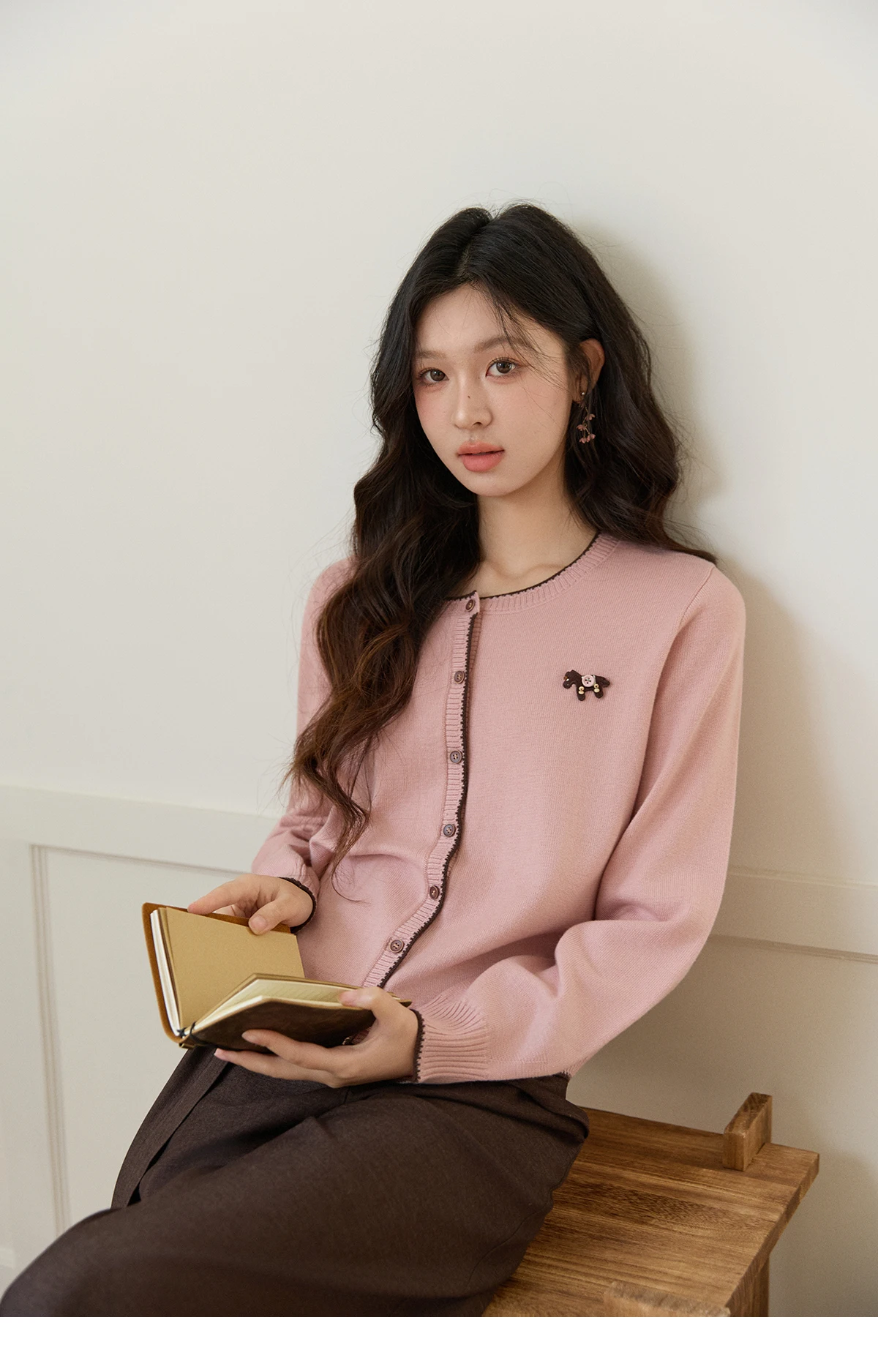 MISHOW Contrast Trim Crew Neck Knit Cardigan 2026 Spring Single Breasted Casual Pink Sweater with Pony Decoration MXF108Z1023