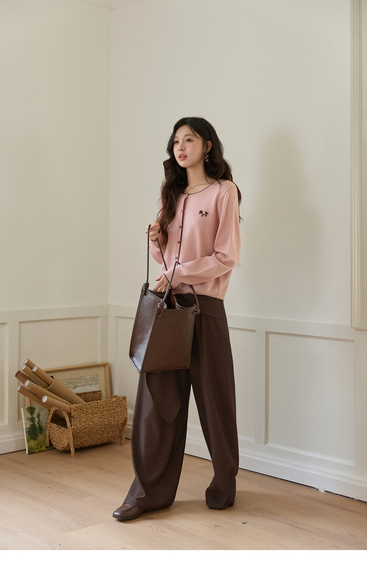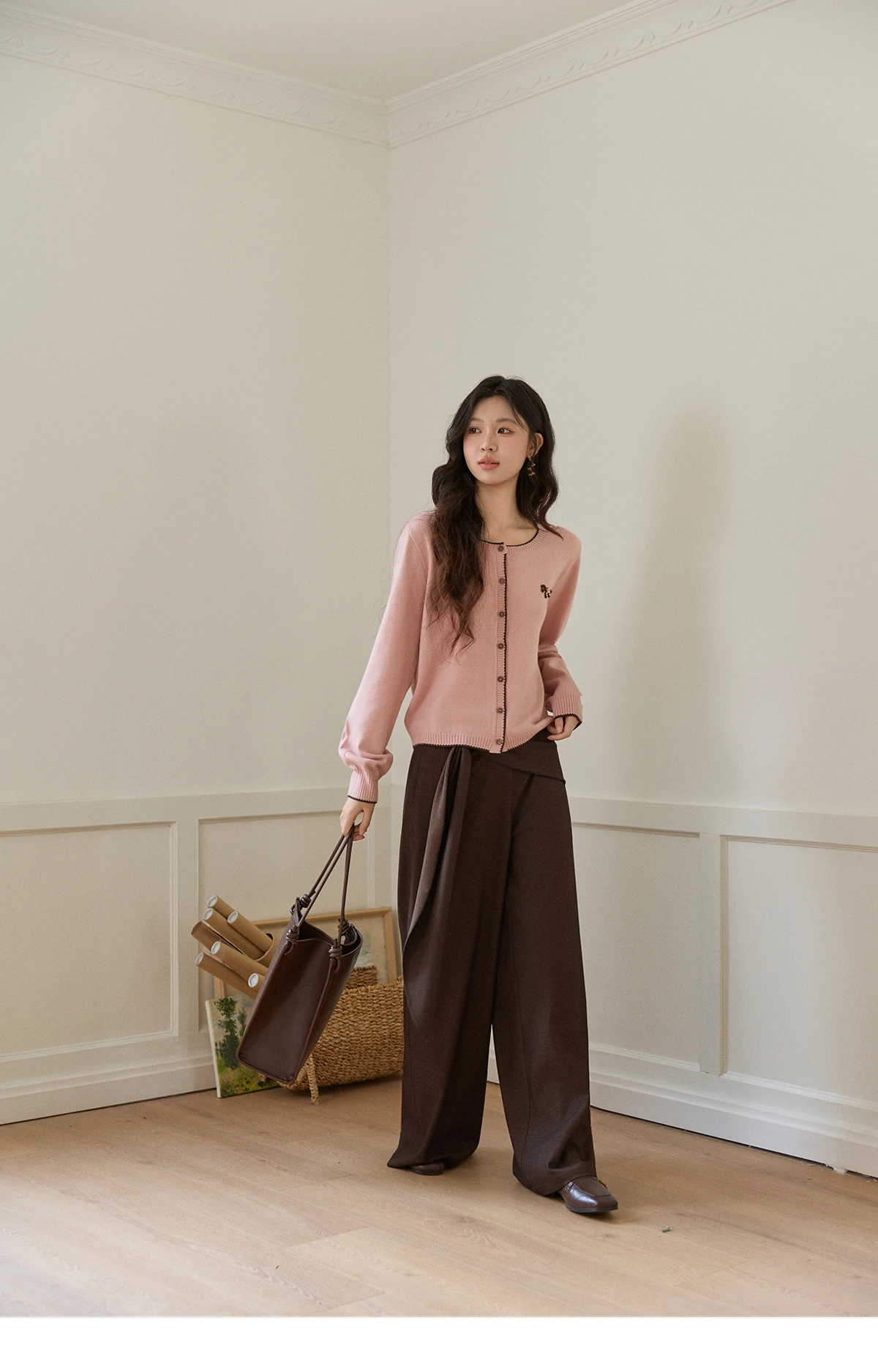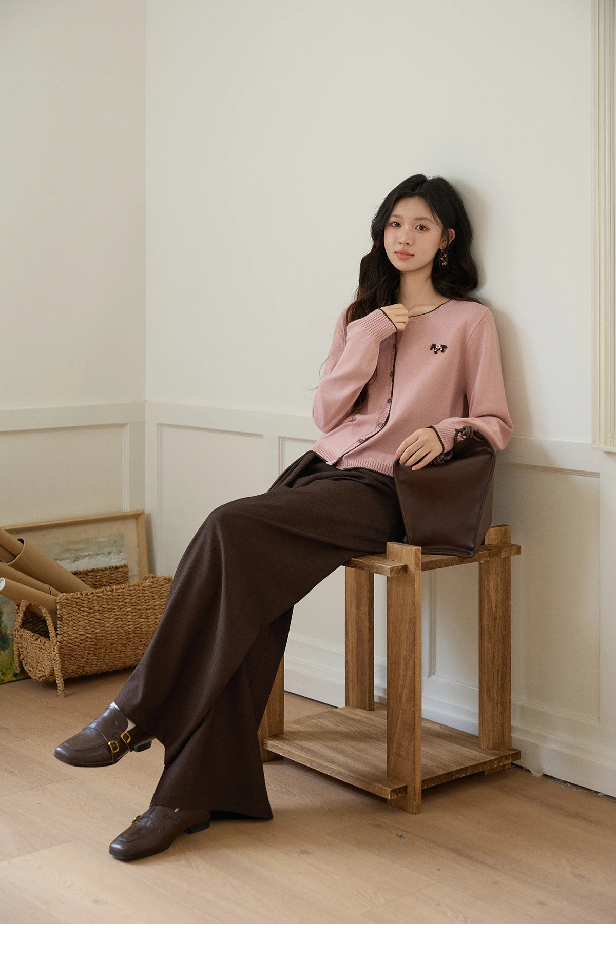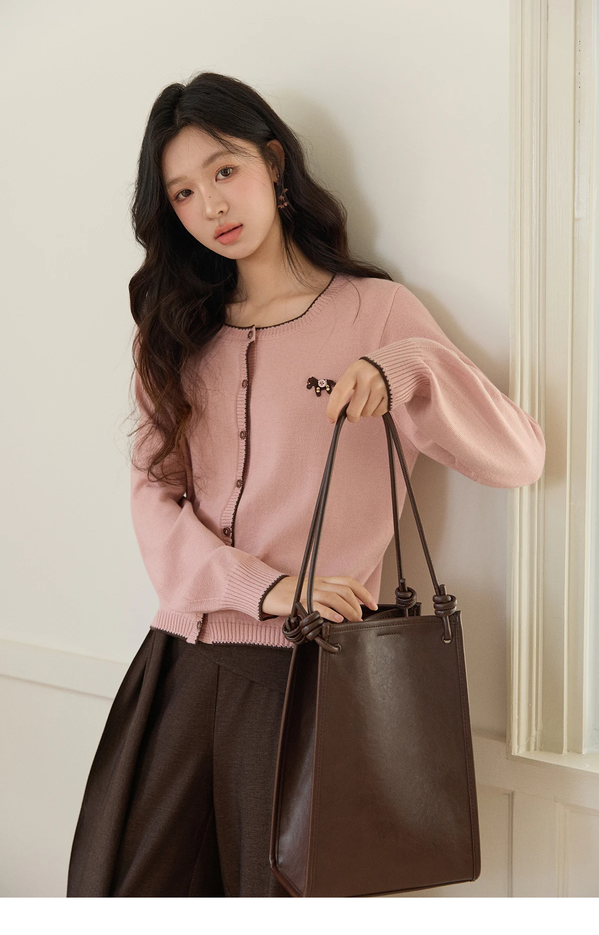 MISHOW Contrast Trim Crew Neck Knit Cardigan 2026 Spring Single Breasted Casual Pink Sweater with Pony Decoration MXF108Z1023