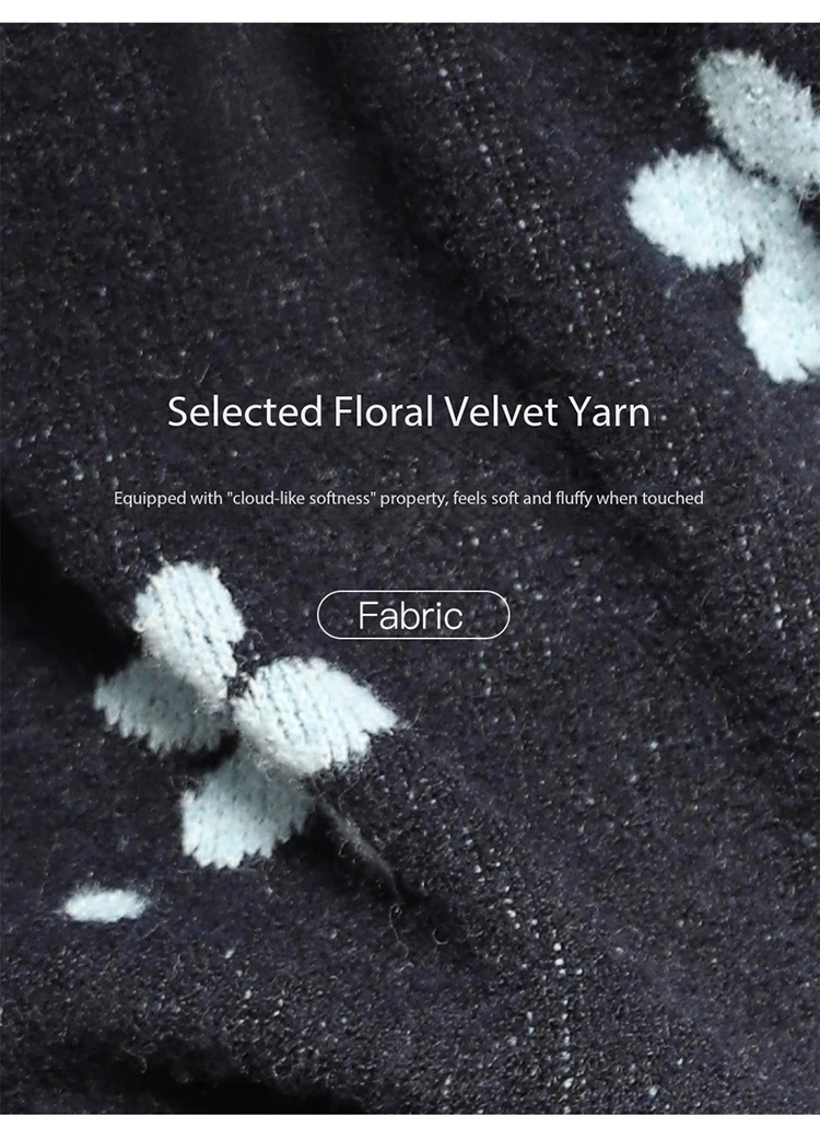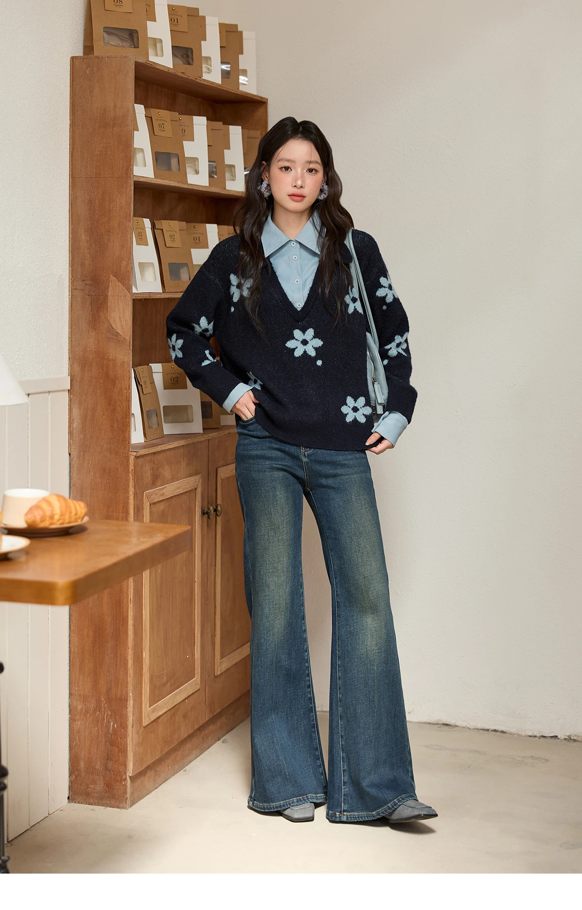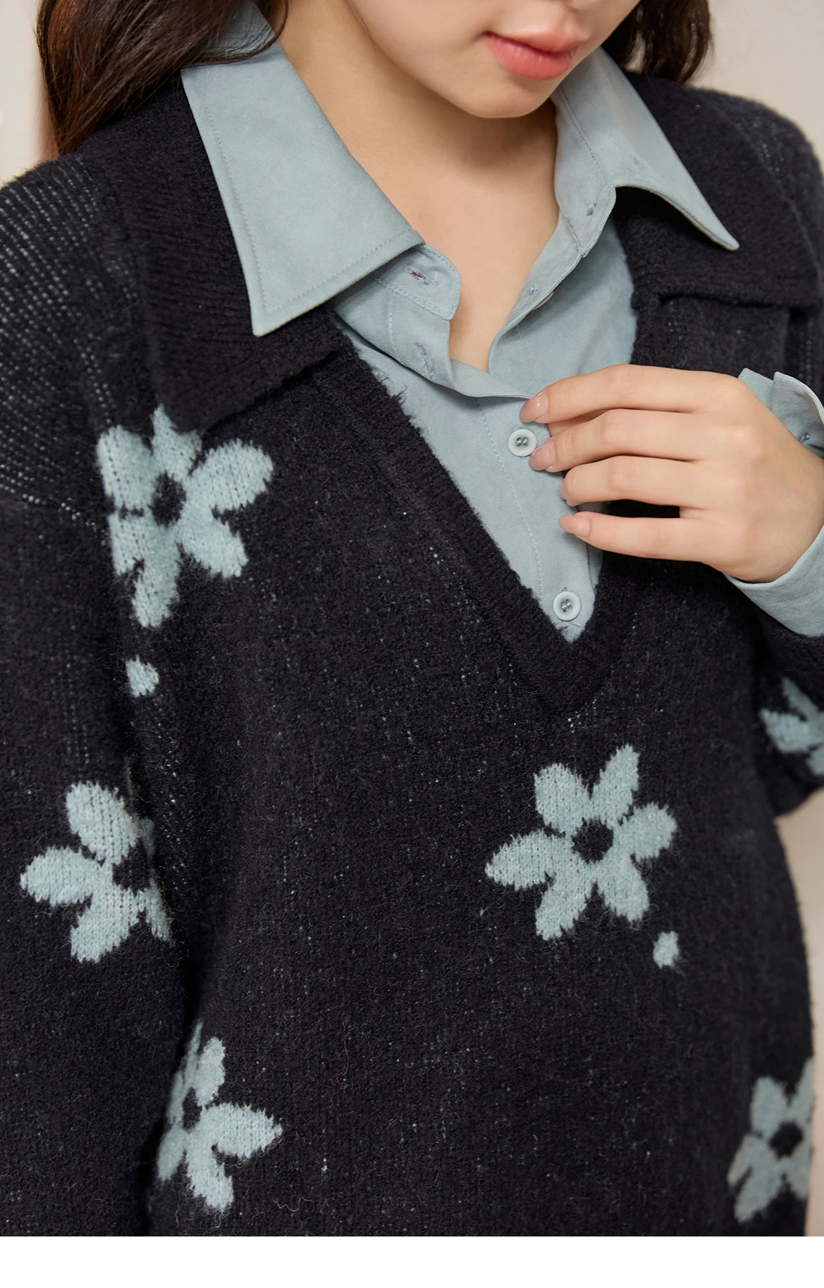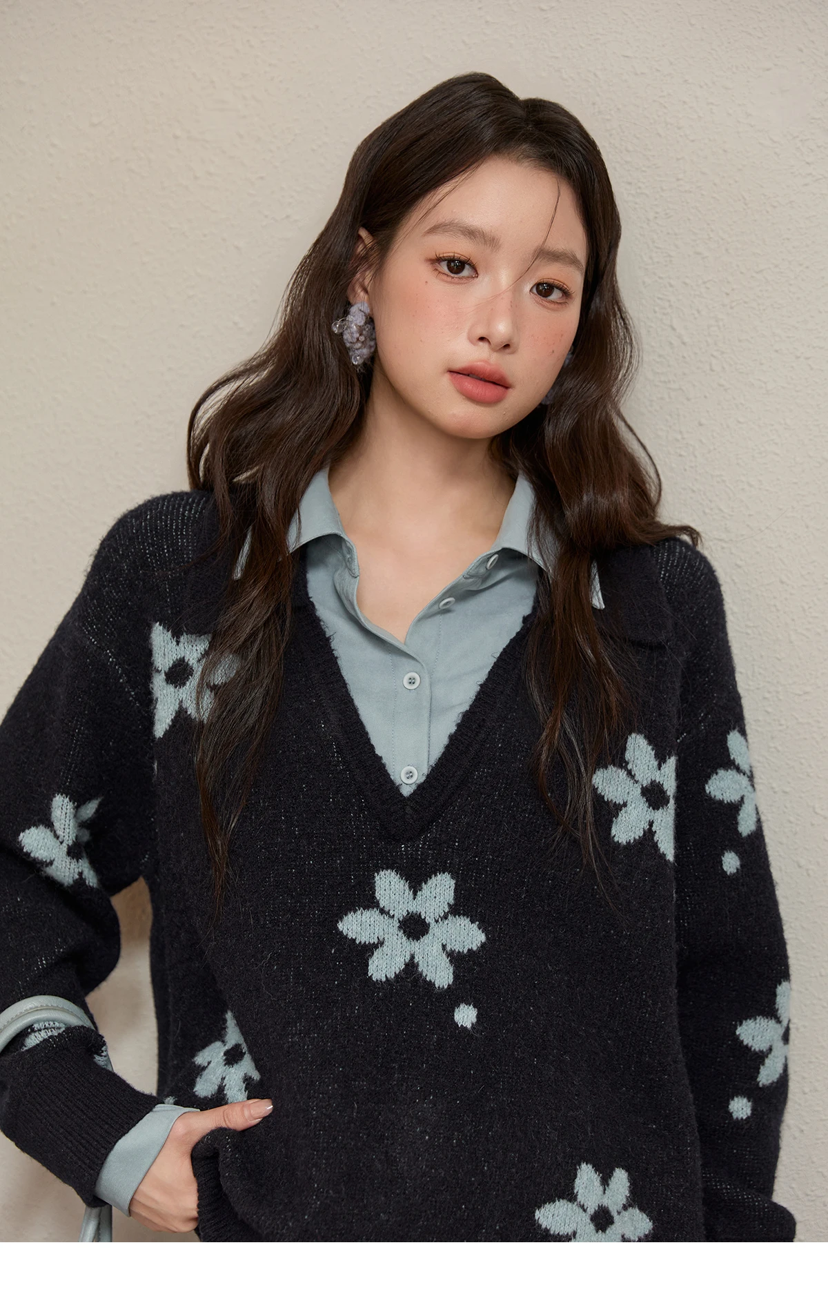 MISHOW Dark Blue Fake Two-piece Pullovers for Women 2025 Autumn Winter New Turn-down Collar Flower Pattern Sweater MXE51Z2554