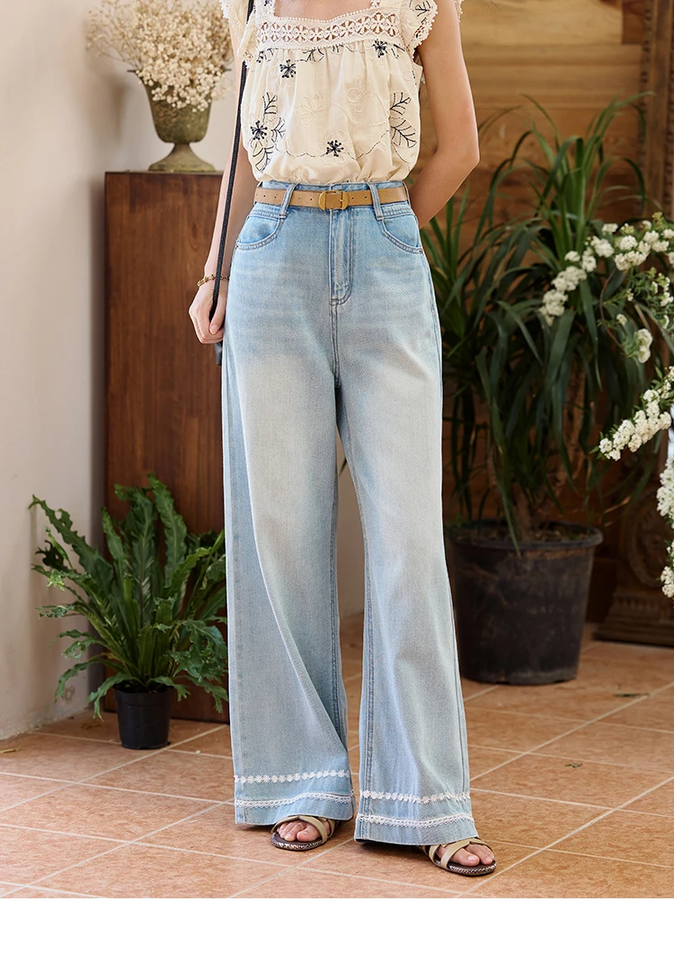MISHOW Denim Blue Lace Straight Leg Pants for Women Summer 2025 High Waist Trousers 100 Cotton Casual Wide Leg Jeans MXE35K0947