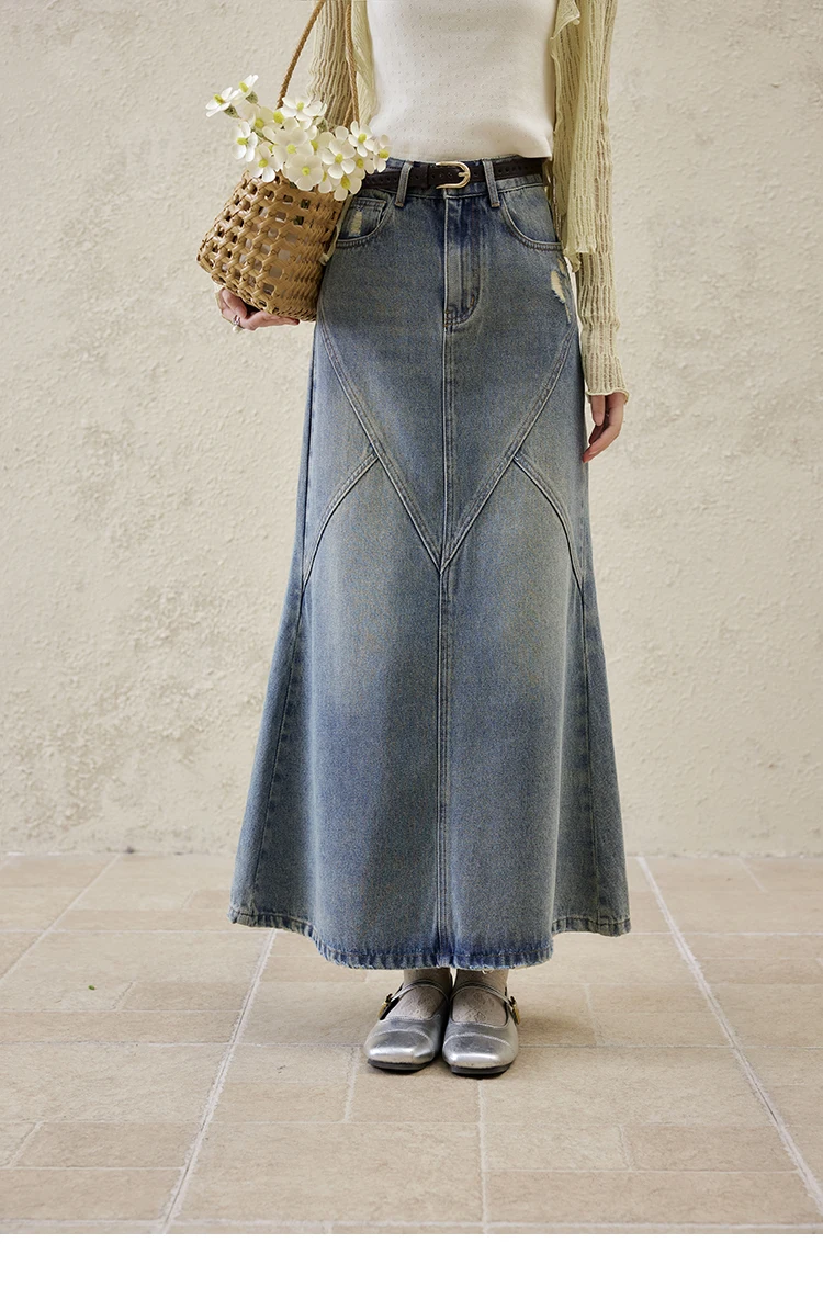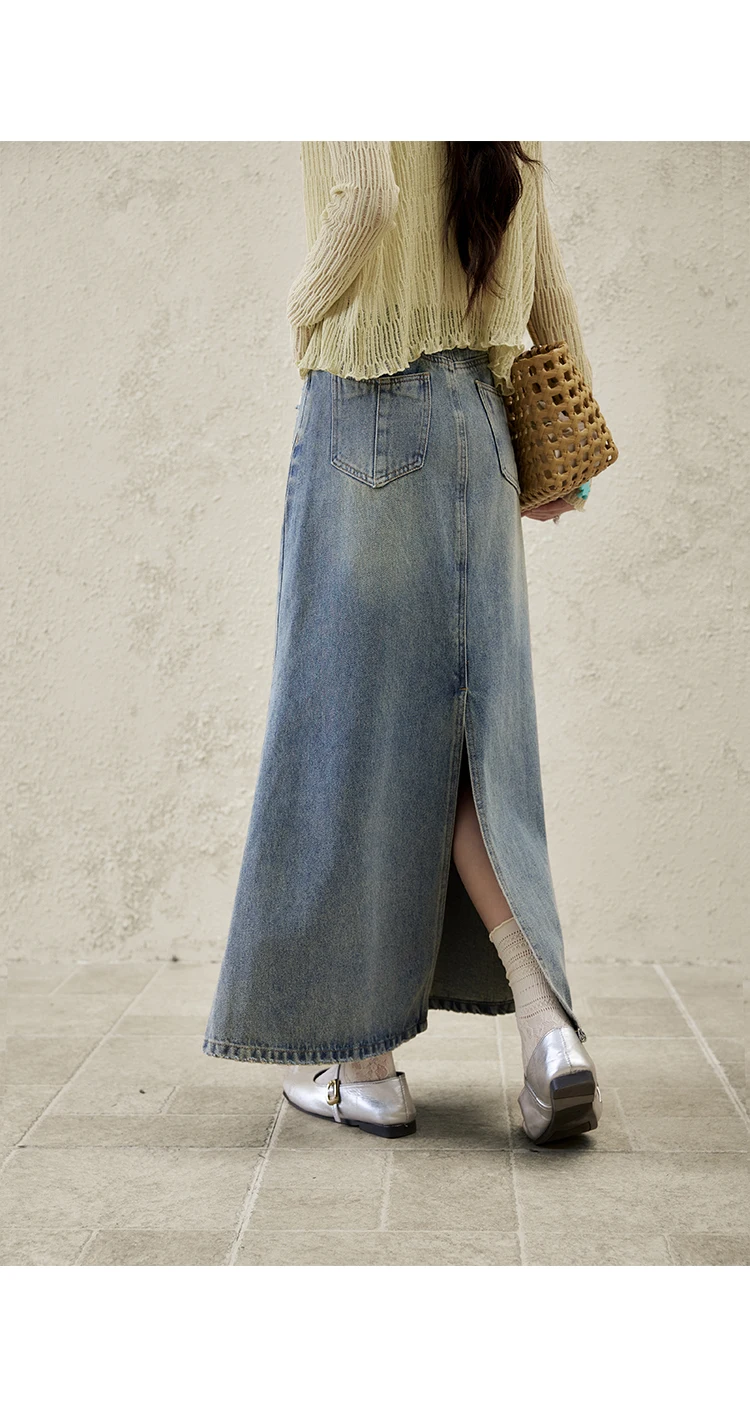 MISHOW Denim Skirt Women 2025 Spring Irregular Wash Denim Distressed Skirts Split Back Hem High Waist Commuter Skirt MXE14B0705