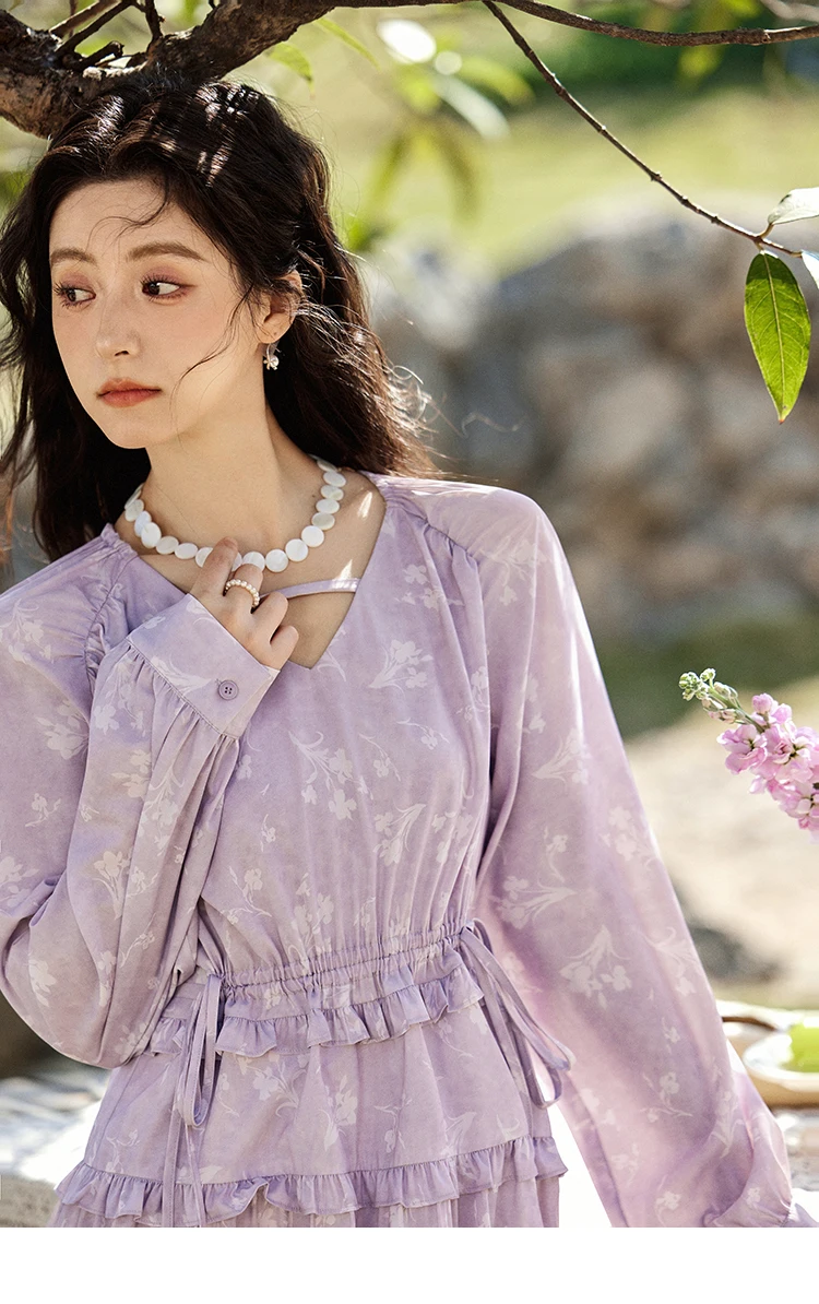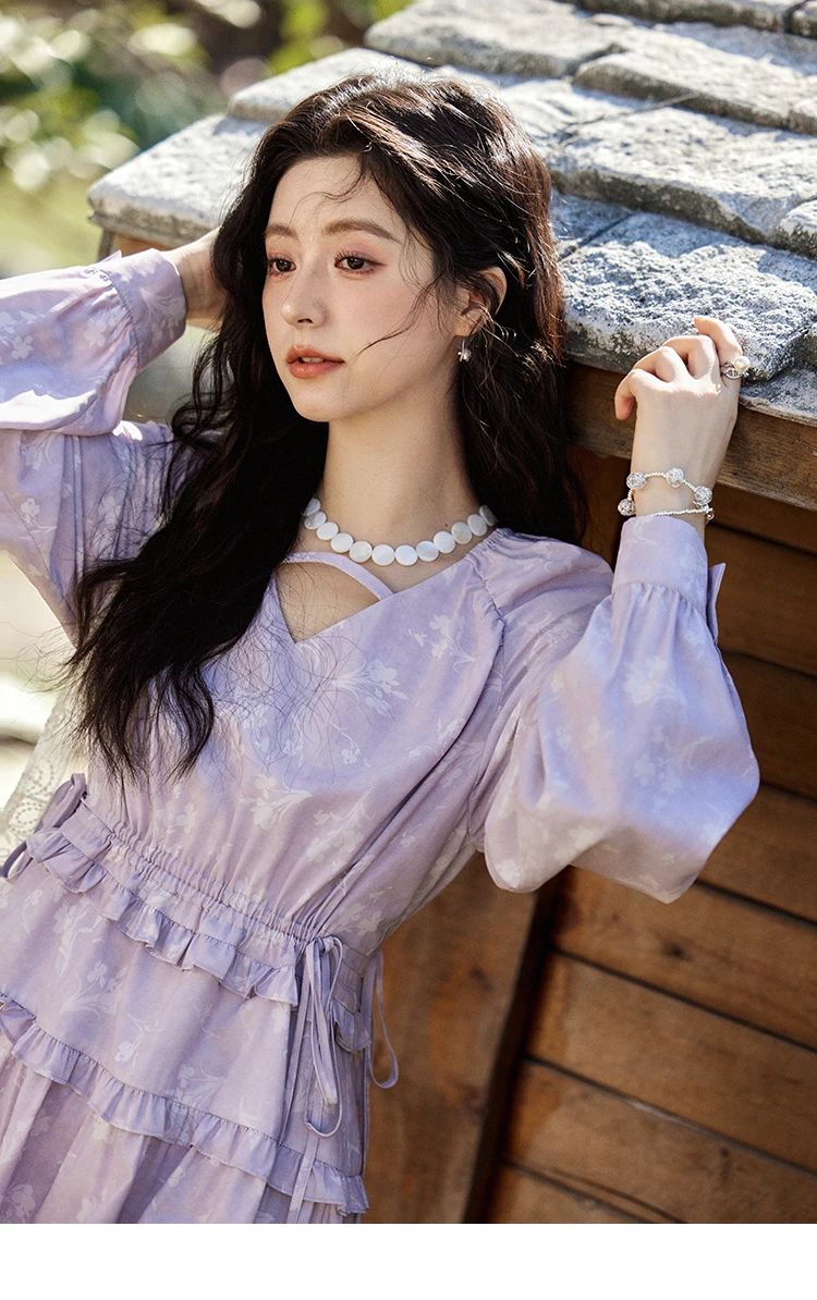 MISHOW Elegant Black Fungus Edge Dress for Women Spring 2025 Floral Lace-up Waist Dresses Long Sleeved Cake Dress MXE13L2101