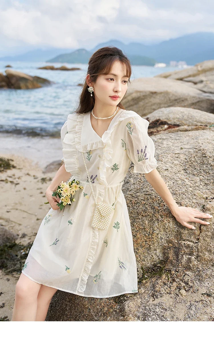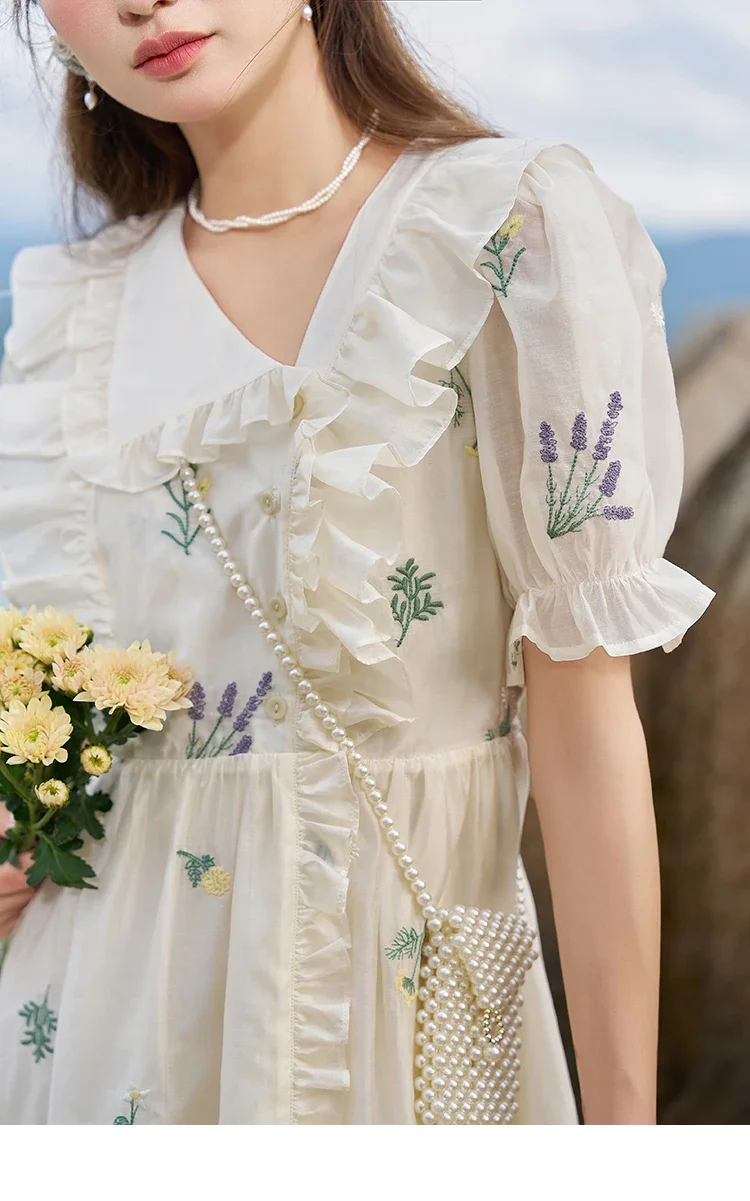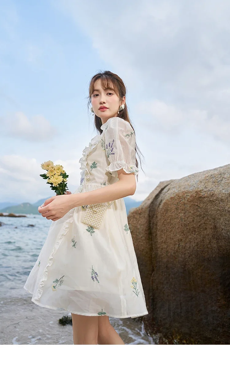 MISHOW Elegant Fairycore Embroidery Flower Dresses 2025 Summer A-line Flare Sleeve Ruffles Sweet Knee-Length Dresses MXC38L1518