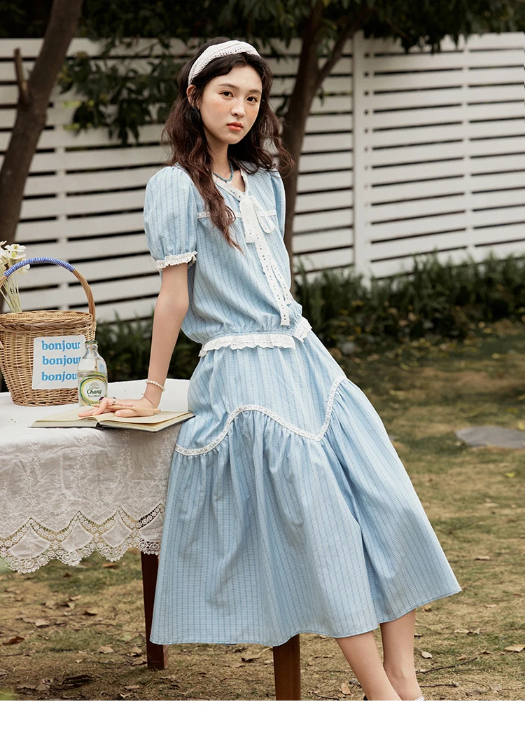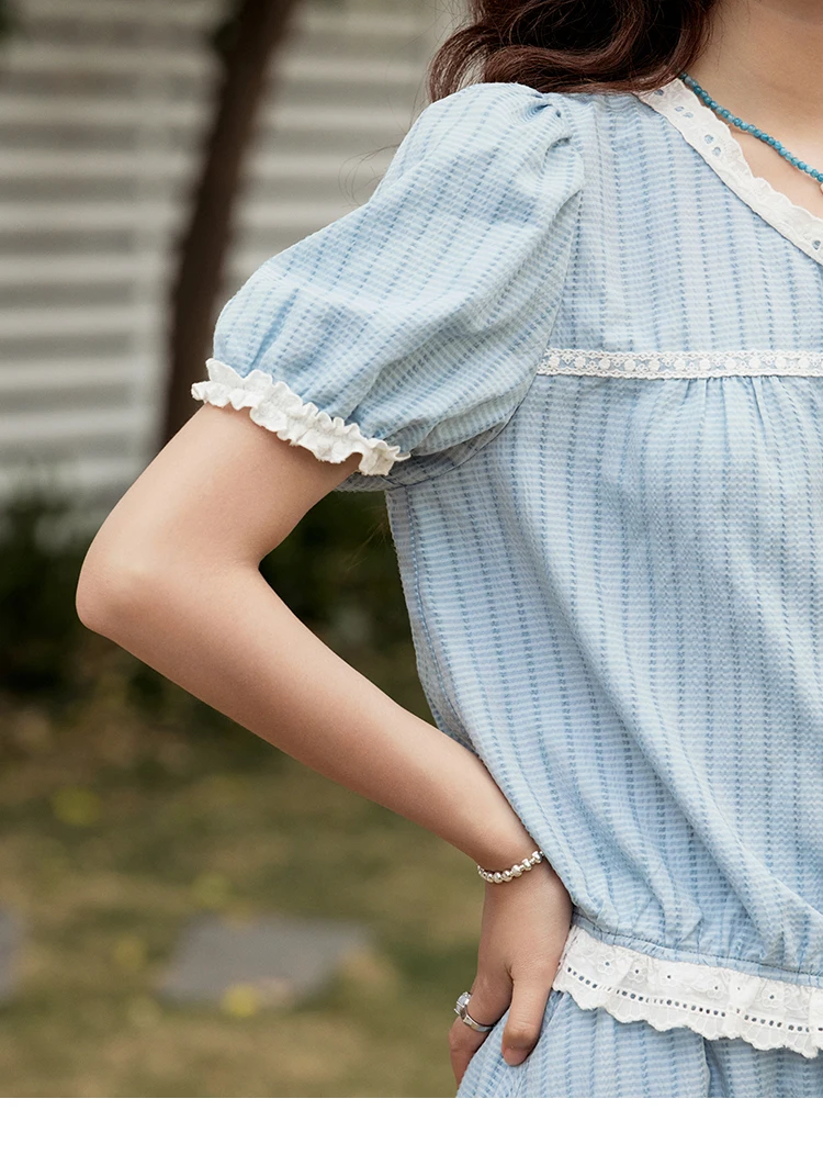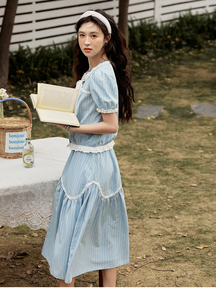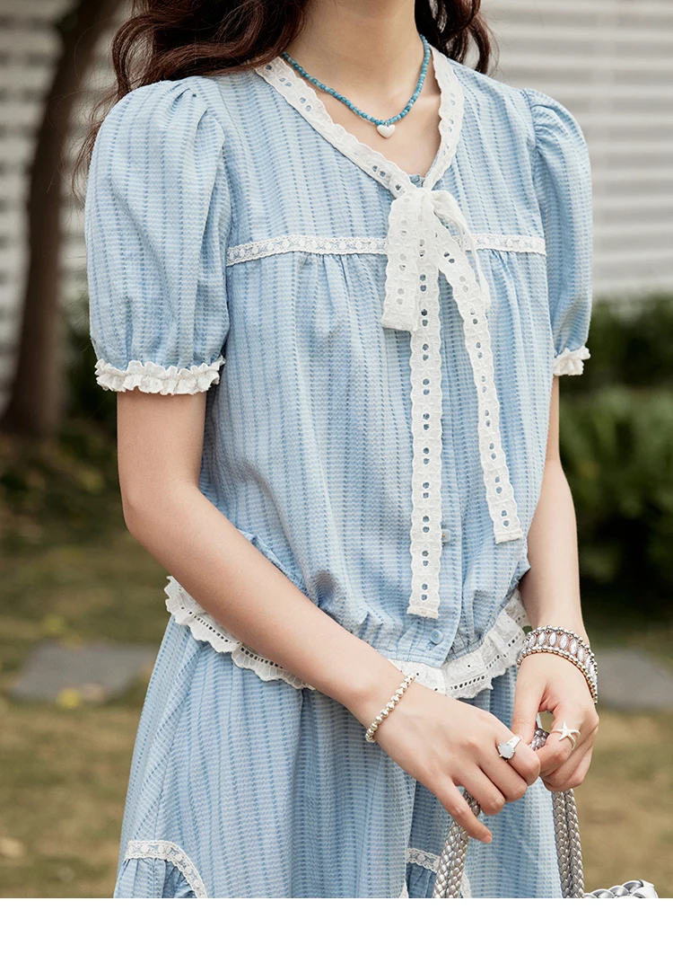 MISHOW Elegant Summer Skirts Sets Women 2025 Short Sleeve V-neck Tops Blue Stripe Lace A-line Skirt Woman Slimming MXE31T0531