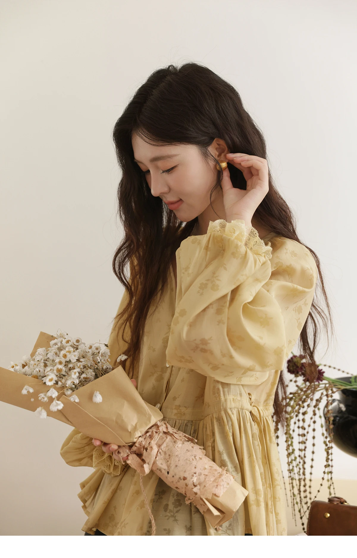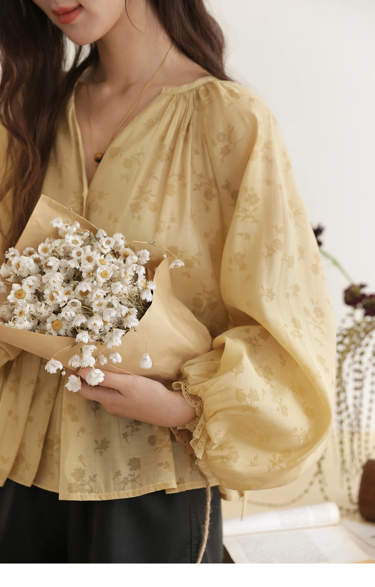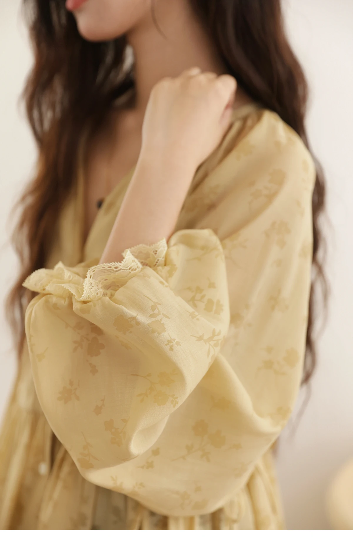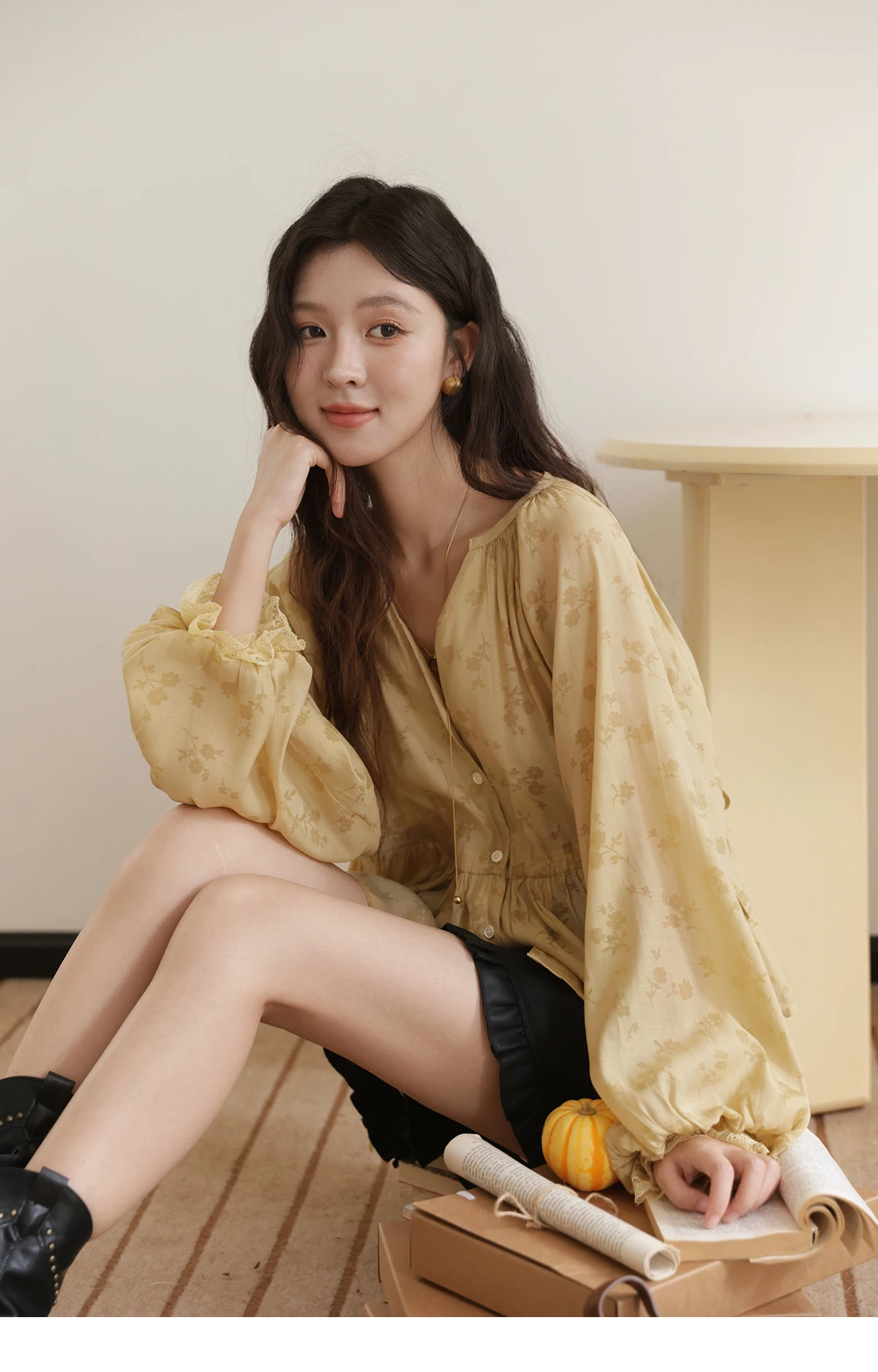 MISHOW Elegant Woman Shirt 2025 Autumn Yellow Printing Lantern Sleeves Shirt Commute Drawstring Waist Lace Trim Top MXE45X2499