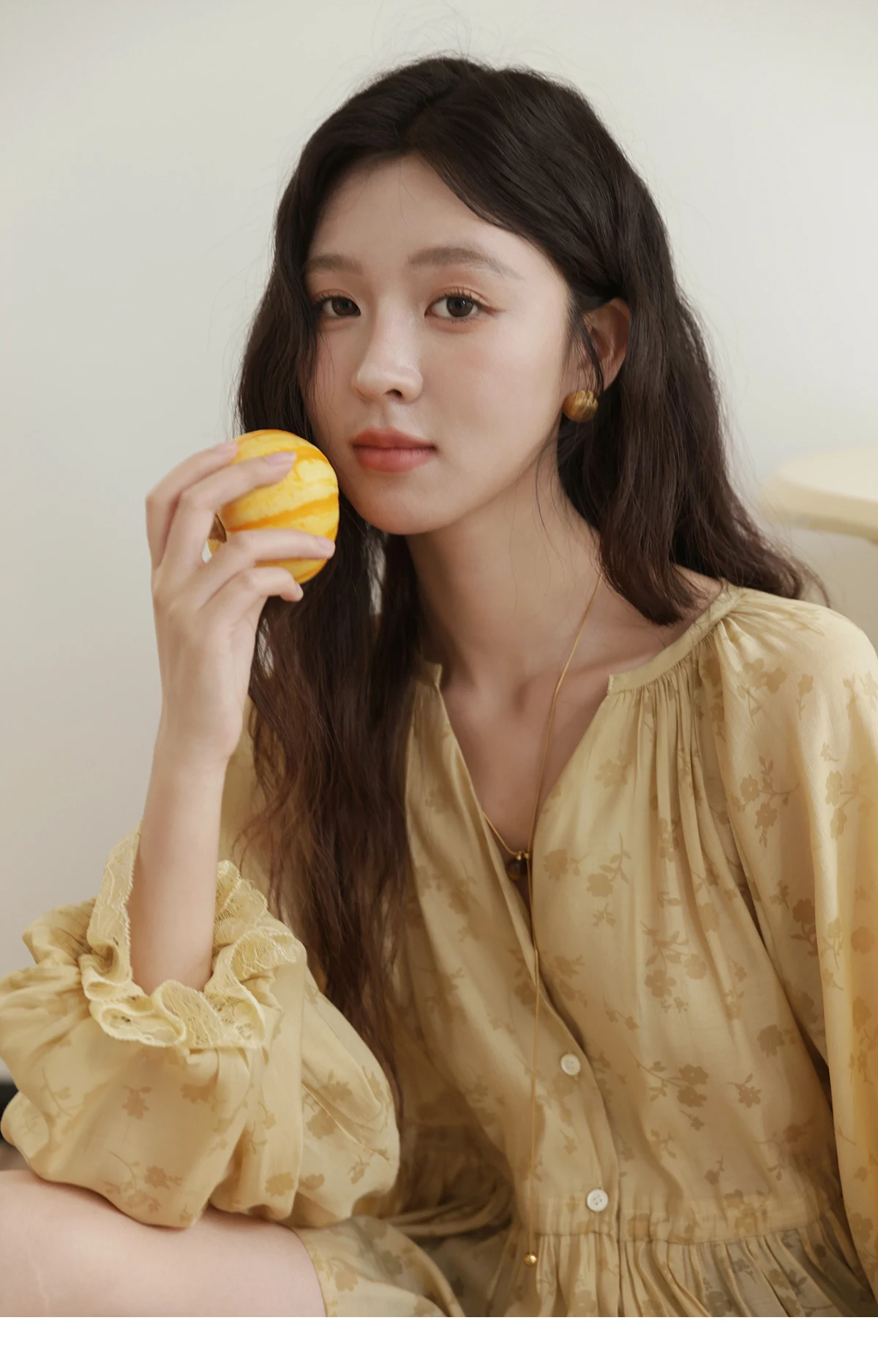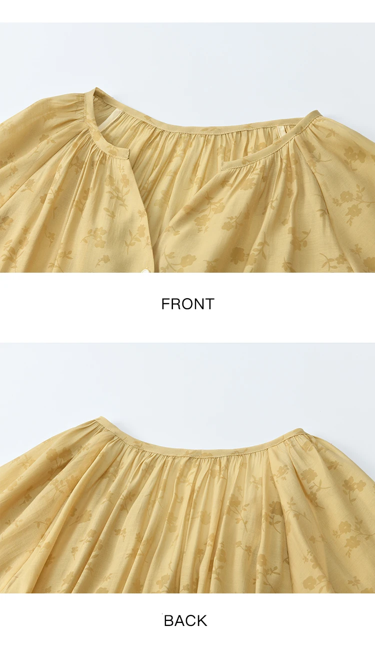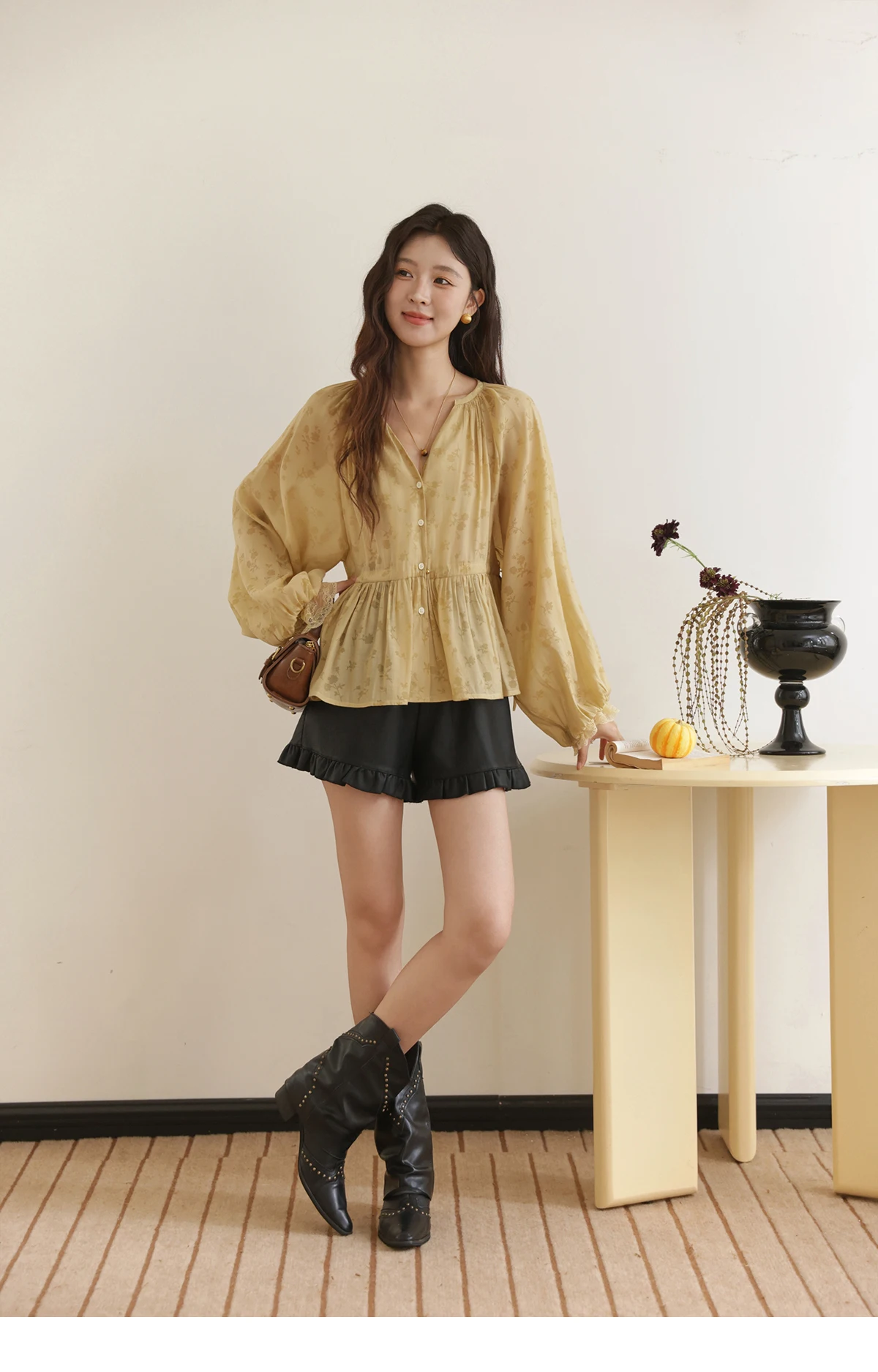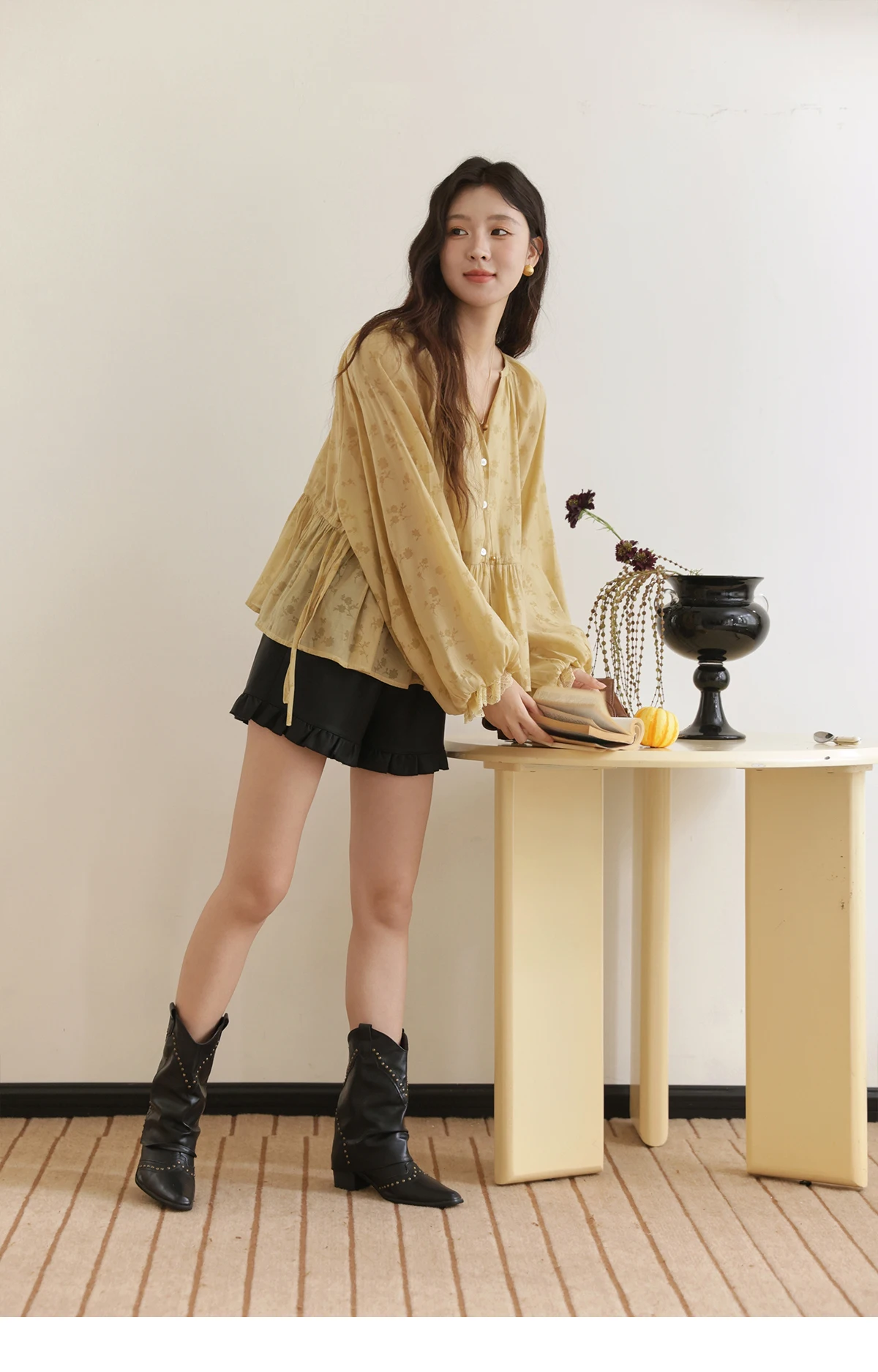MISHOW Elegant Woman Shirt 2025 Autumn Yellow Printing Lantern Sleeves Shirt Commute Drawstring Waist Lace Trim Top MXE45X2499