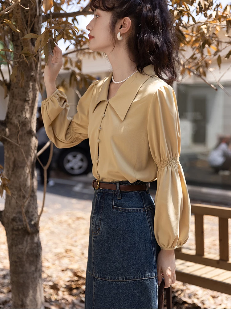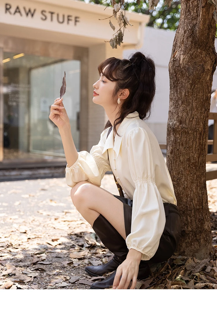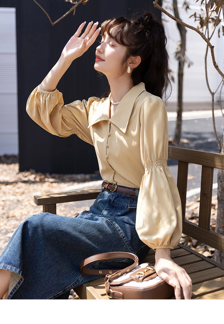MISHOW Elegant Women's Blouse Autumn Vintage French Lantern Sleeves Turndown Collar Shirt Office Lady Female Clothing MXB32C0508