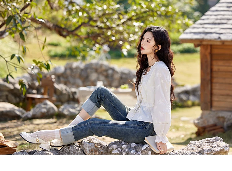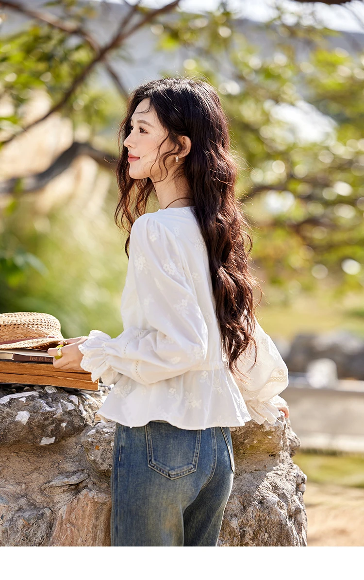 MISHOW Embroidered Blouse Women 2025 Spring New French Elegant Apricot Lace Premium Drawstring Design V Neck Tops MXE11X1708