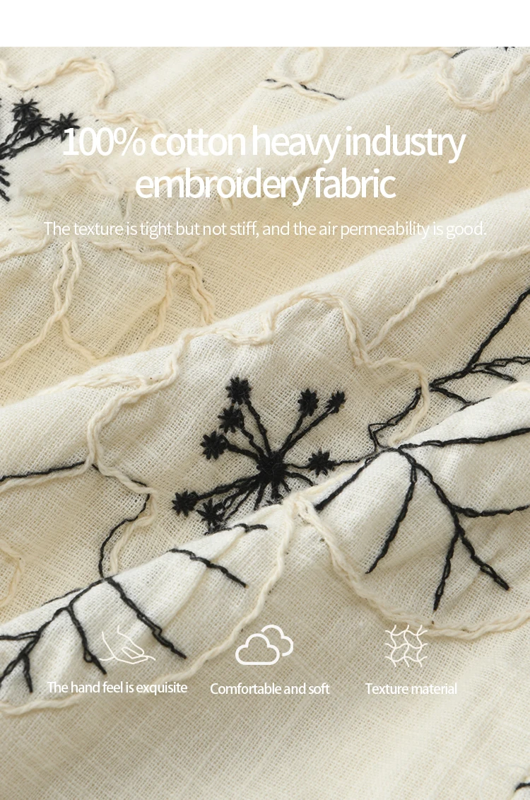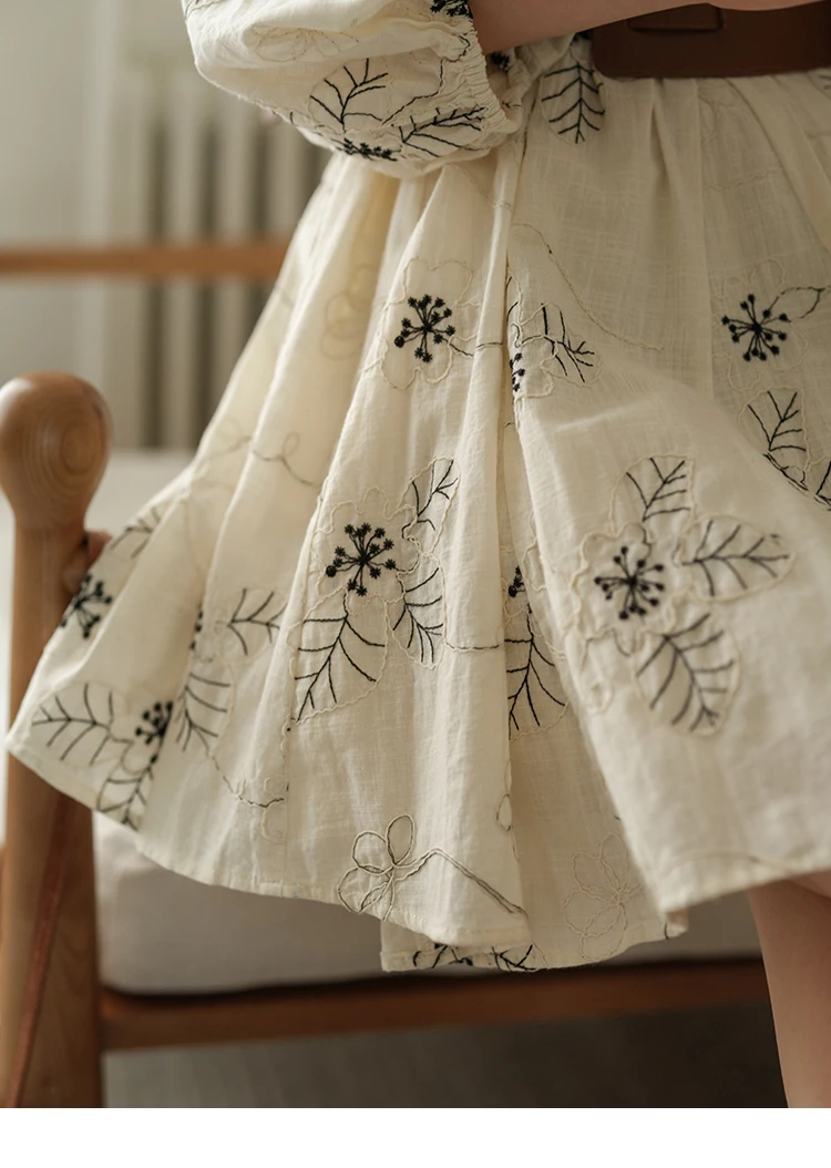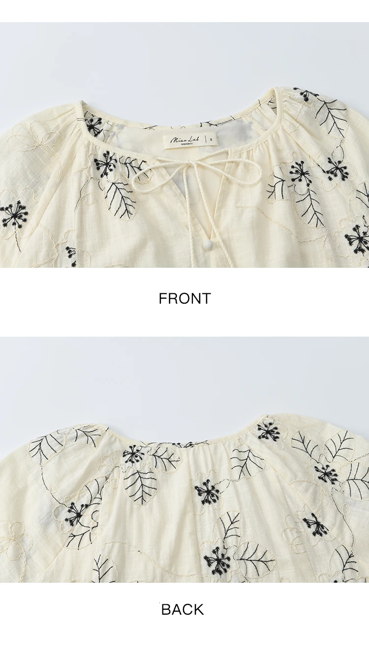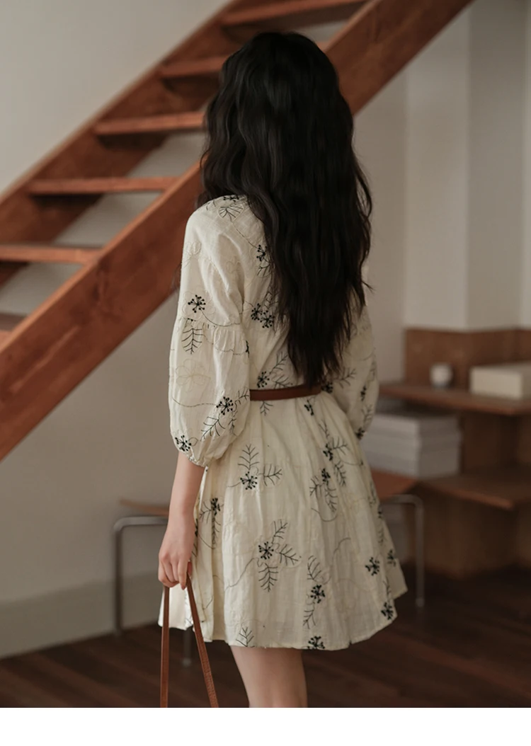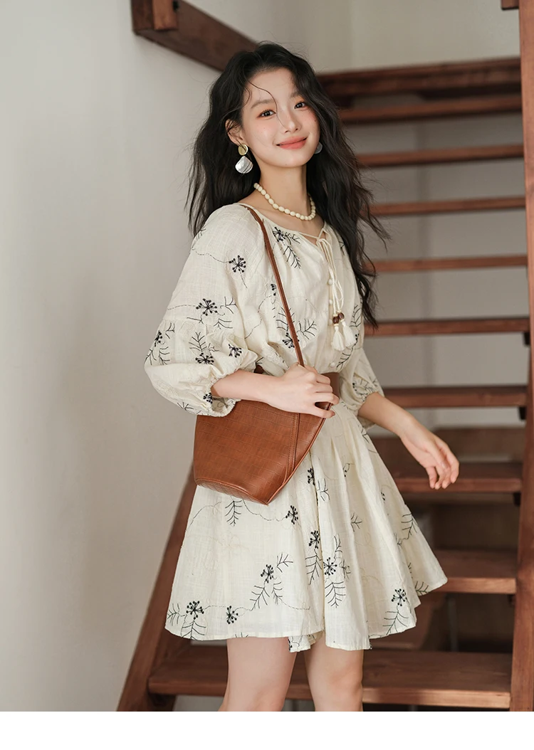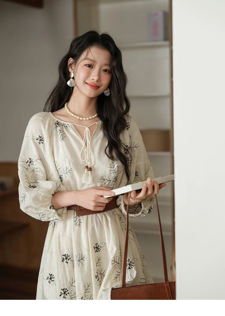 MISHOW Embroidered Doll Dress 2025 Seven Cent Lantern Sleeve Dress O-neck Tassel Lace-up Cotton Dress with Waist Belt MXE41L2480