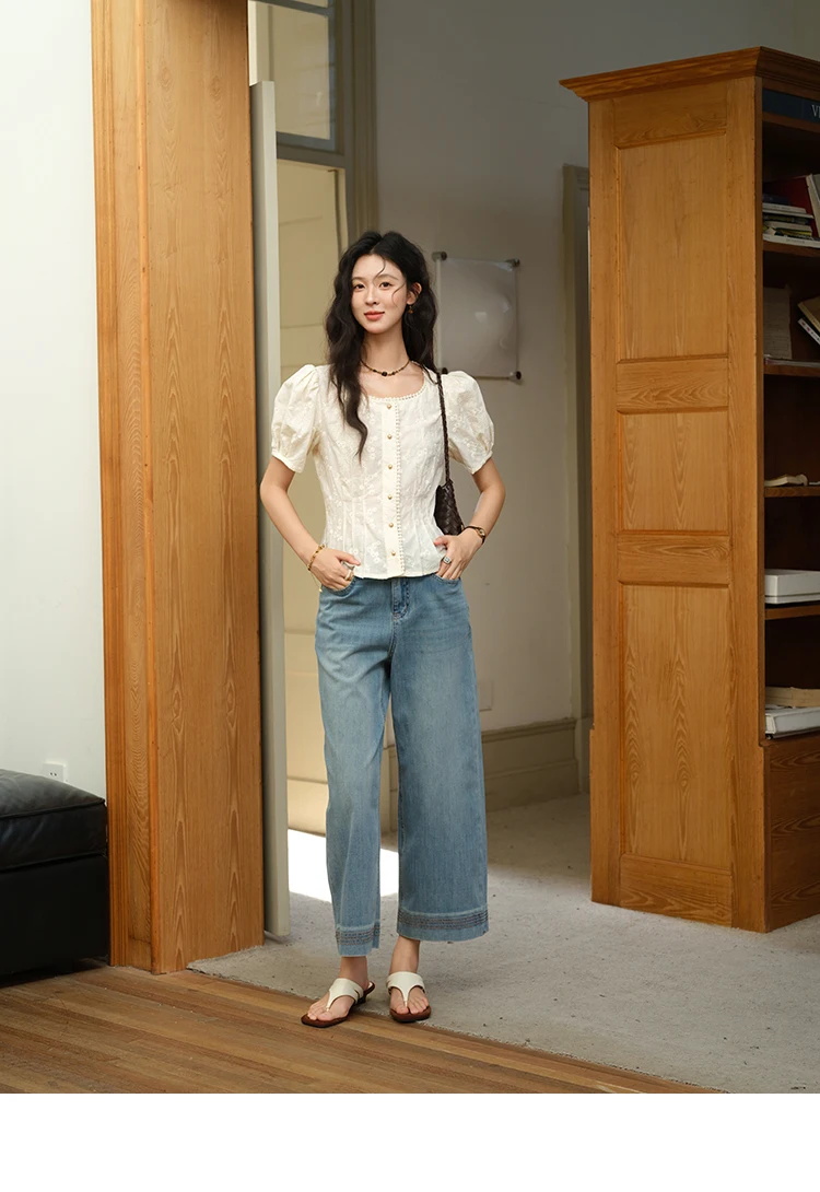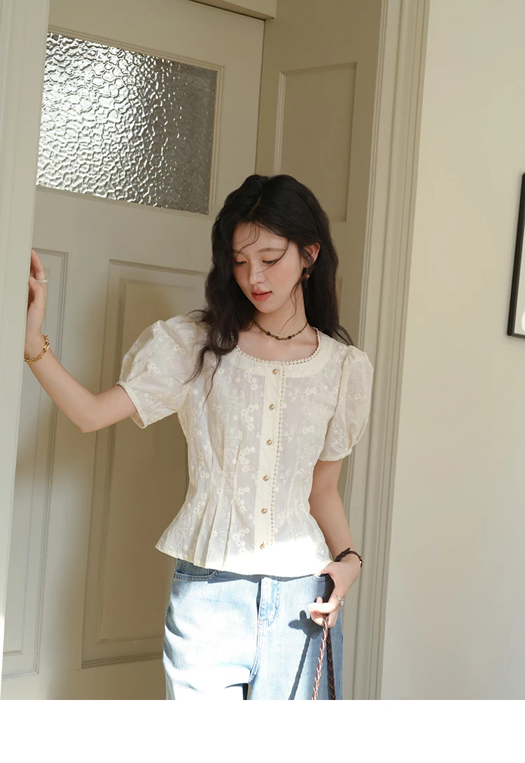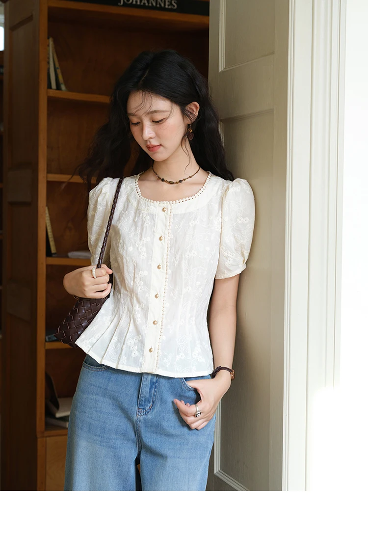 MISHOW Embroidery Cotton Shirt for Women 2025 Summer Fashion French Style Puff Sleeve Button Shirt Women's Clothing MXE39X1979