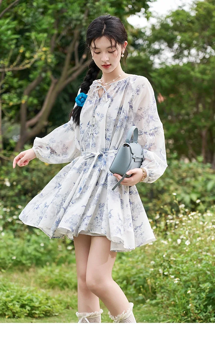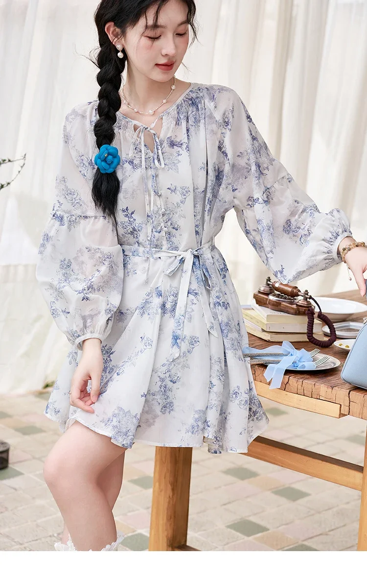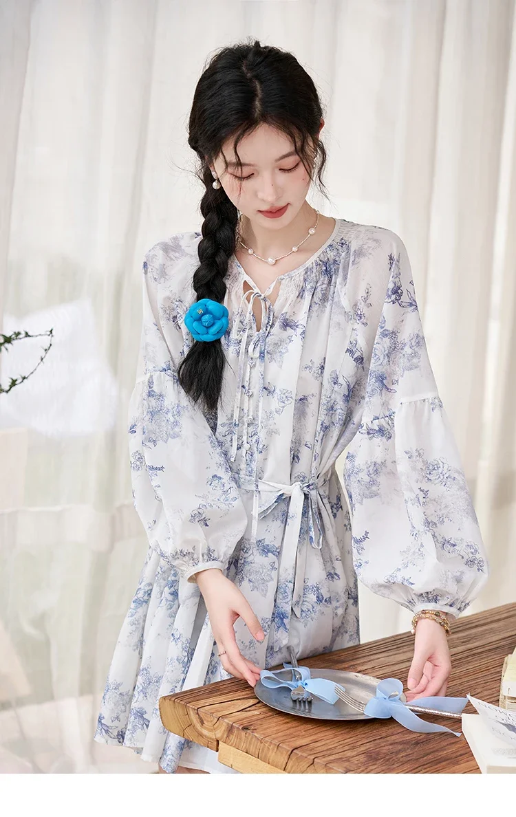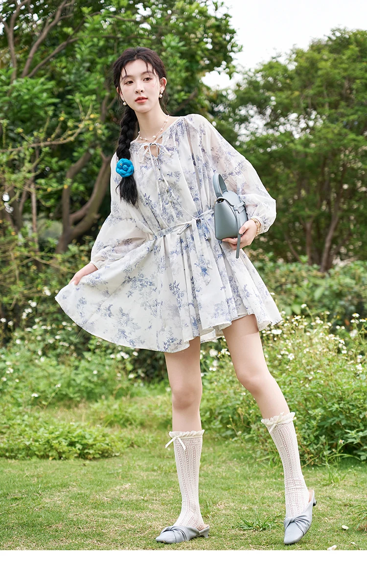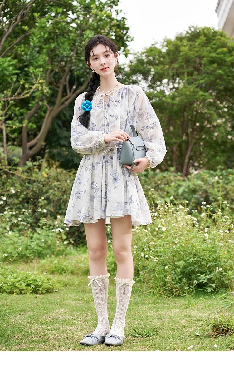 MISHOW Fairy Temperament Floral Puff Sleeved Chiffon Dress Spring Summer 2025 Lace-up O Neck Waist Knee-Length Dress MXD14L1681