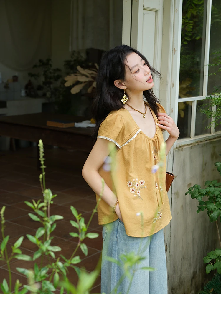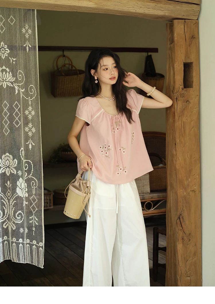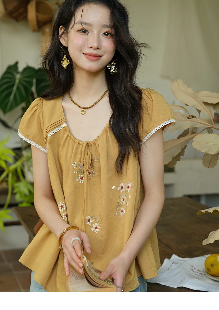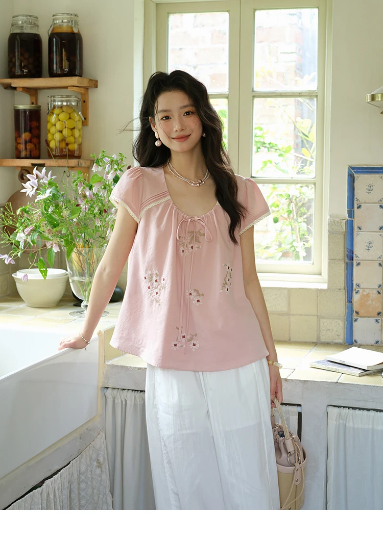 MISHOW Fashion Embroidery Flower Blouses for Woman 2025 Summer O-Neck Lace Up Flying Sleeve Lace Spliced Loose Top MXE39X1880