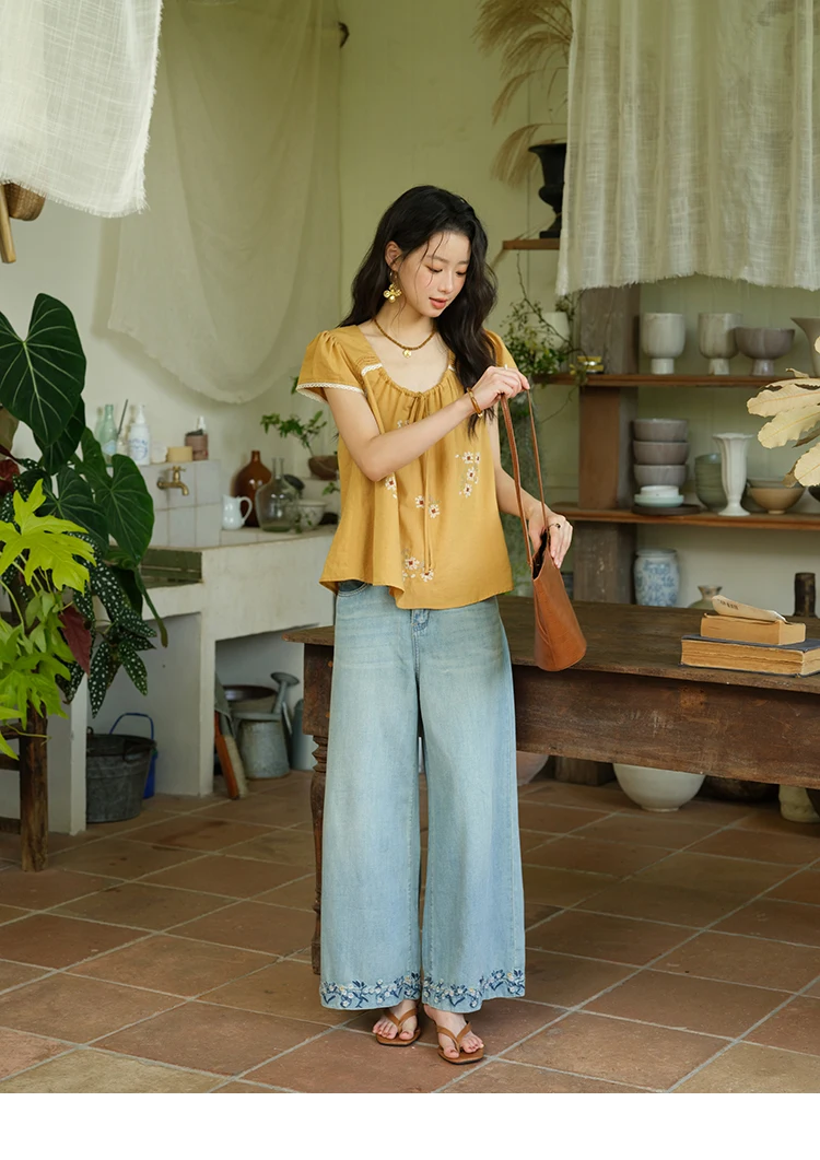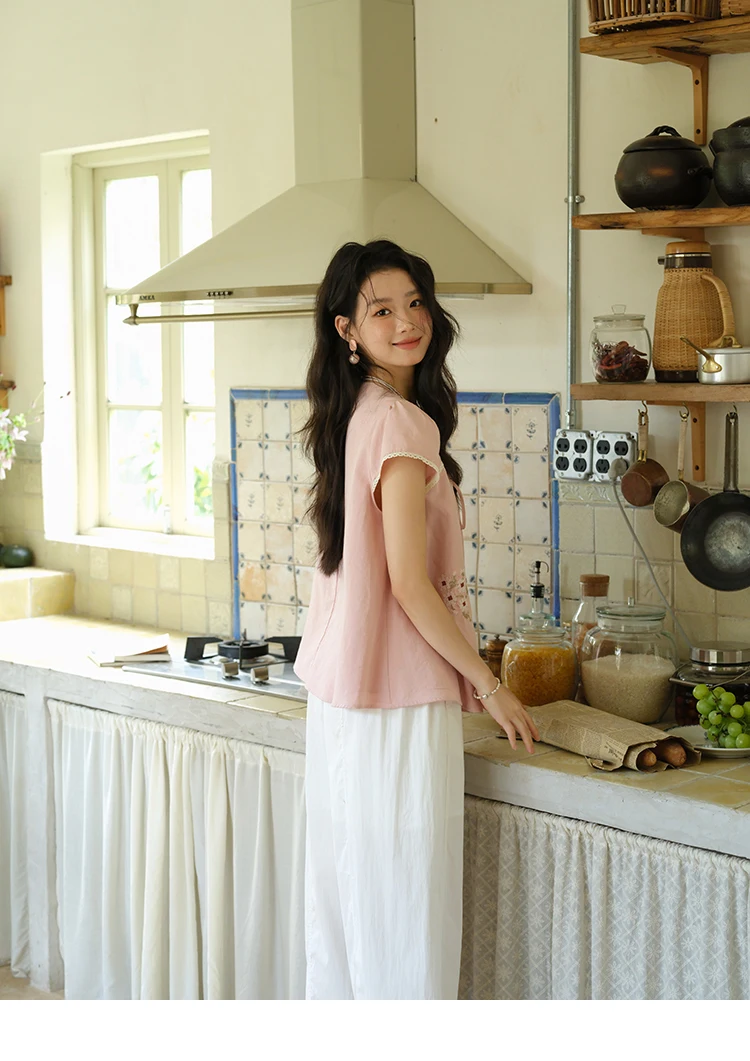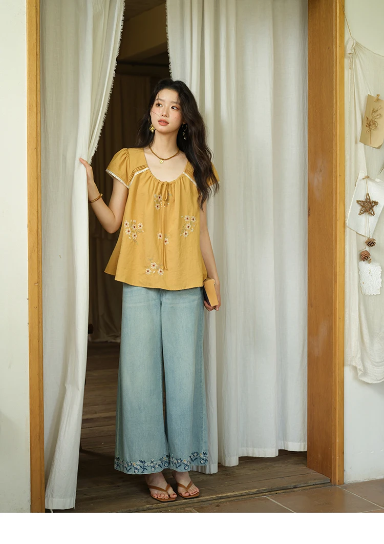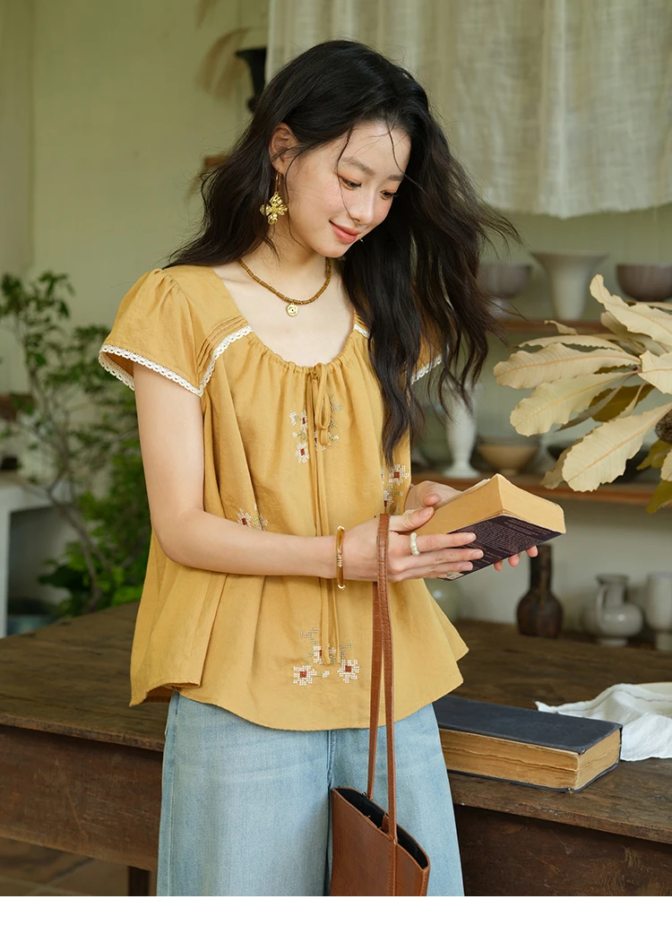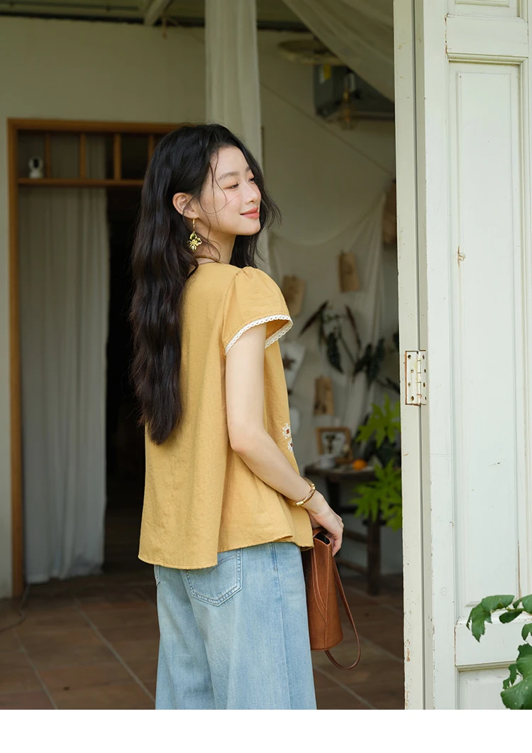 MISHOW Fashion Embroidery Flower Blouses for Woman 2025 Summer O-Neck Lace Up Flying Sleeve Lace Spliced Loose Top MXE39X1880
