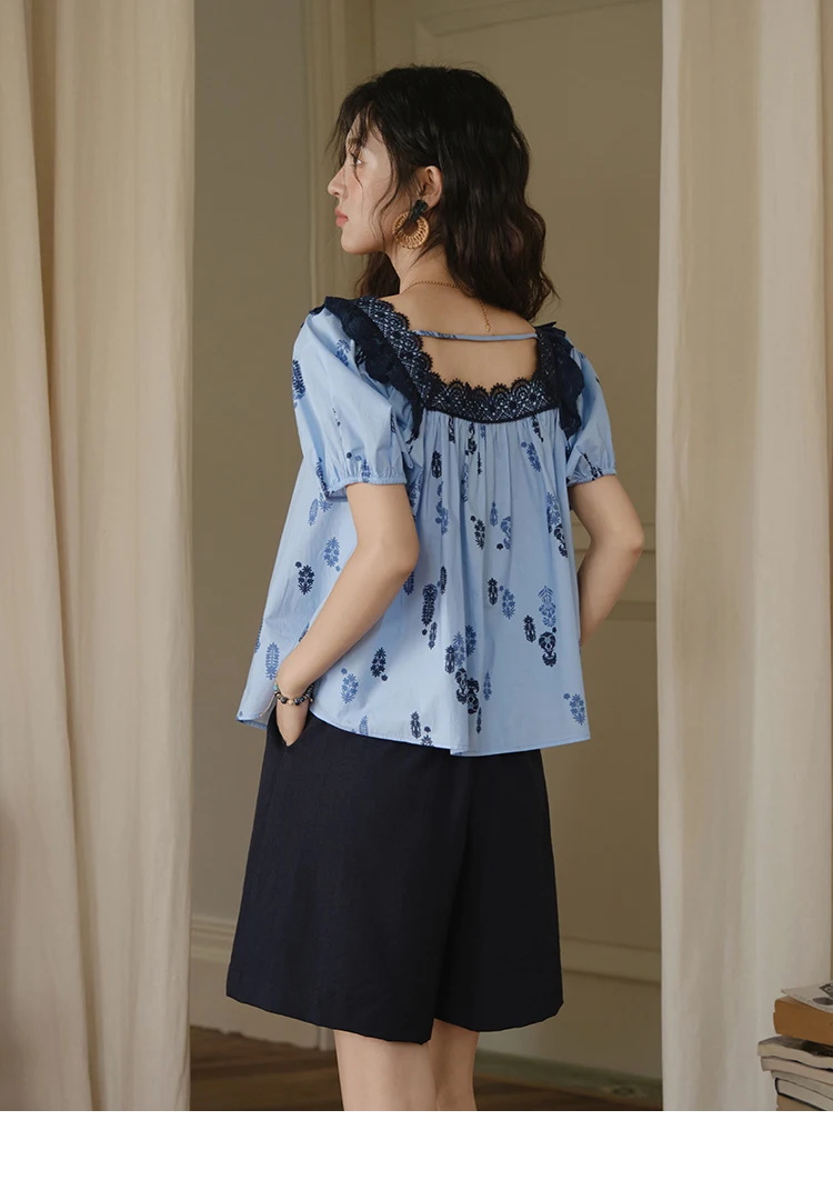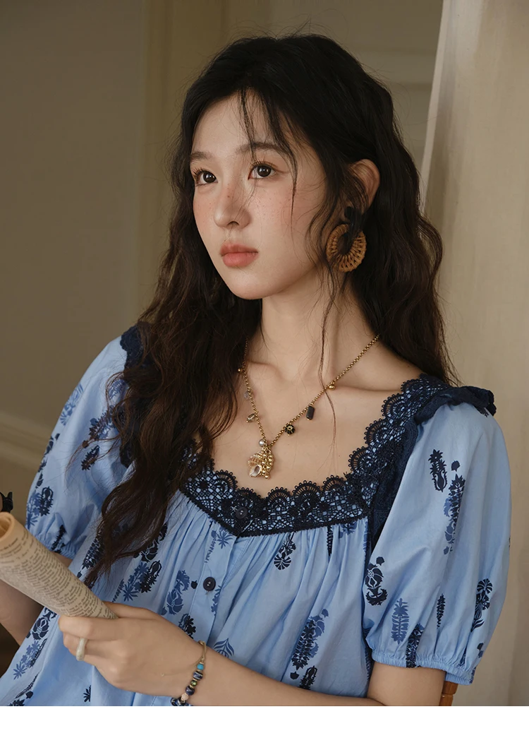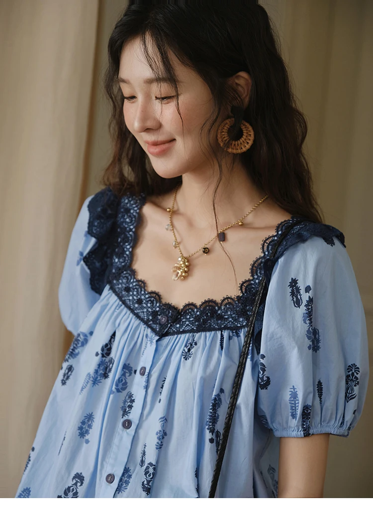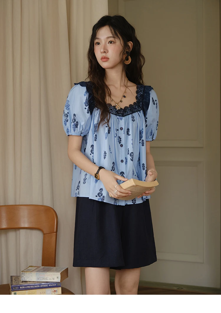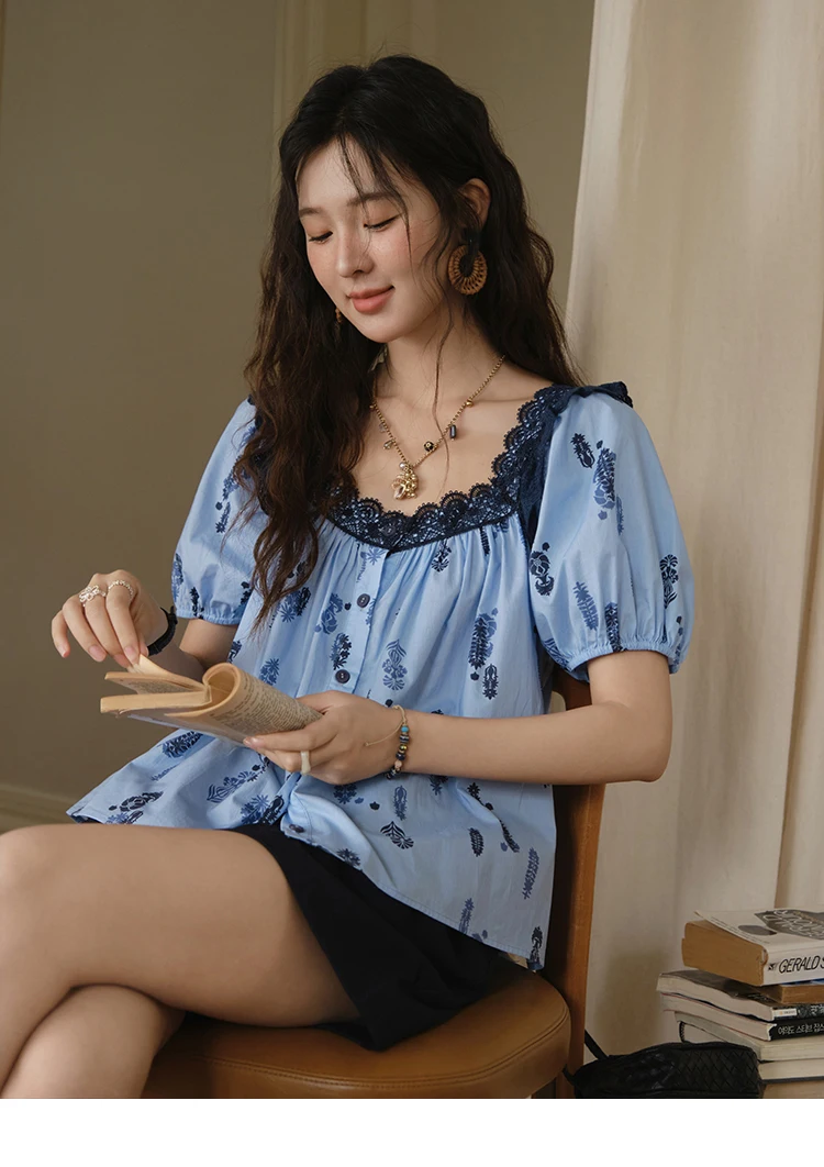 MISHOW Fashion Print Cotton Shirt for Women 2025 Summer New Puff Sleeve Lace Splicing Retro Blue Casual Button Top MXE35X1842