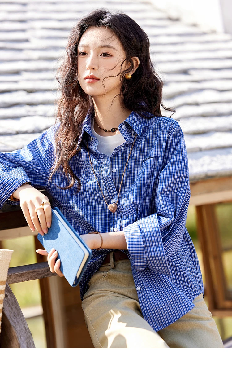 MISHOW Fashion Retro Blue Checkered Shirt Women's Autumn New Loose Casual Lapel Cotton Shirts Long Sleeves Tops Women MXE11C0398