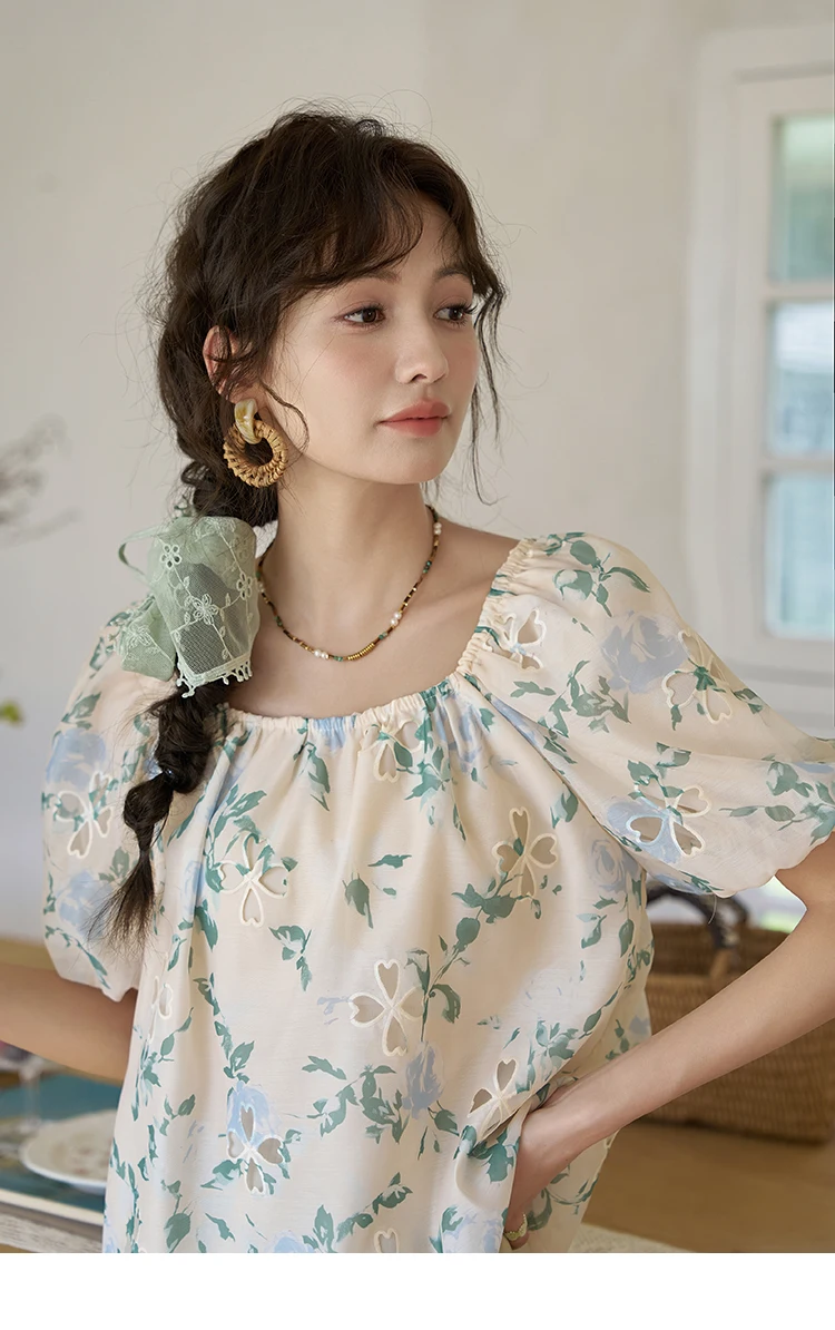 MISHOW Floral Hollow Blouse for Women 2024 Summer Korean Square Collar Elastic Blouses Sweet Puff Sleeve Loose Tops MXD29X1602