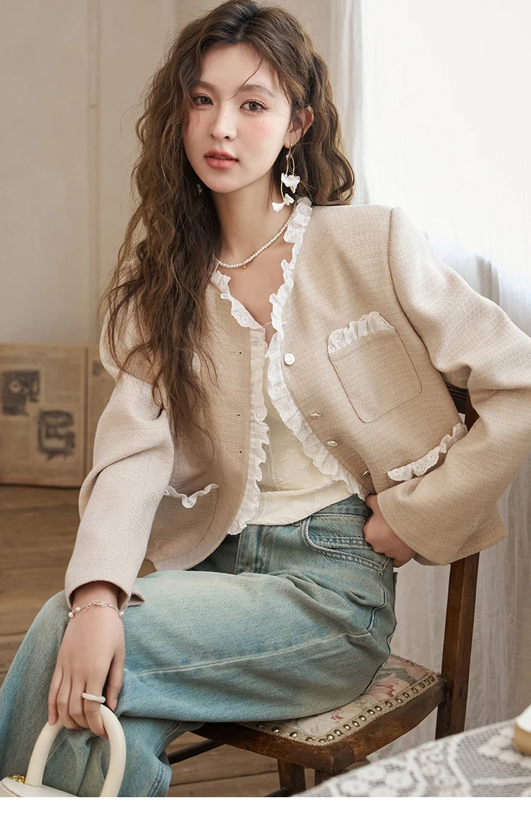 MISHOW French Fragrant Coat Solid Skirt Separately 2025 Spring Collar Pocket Splicing Lace Top Hem Split Back Skirt MXD12W0274