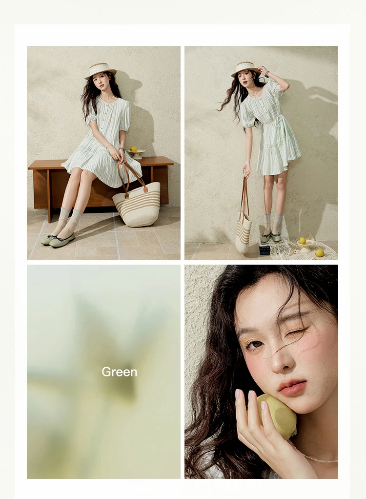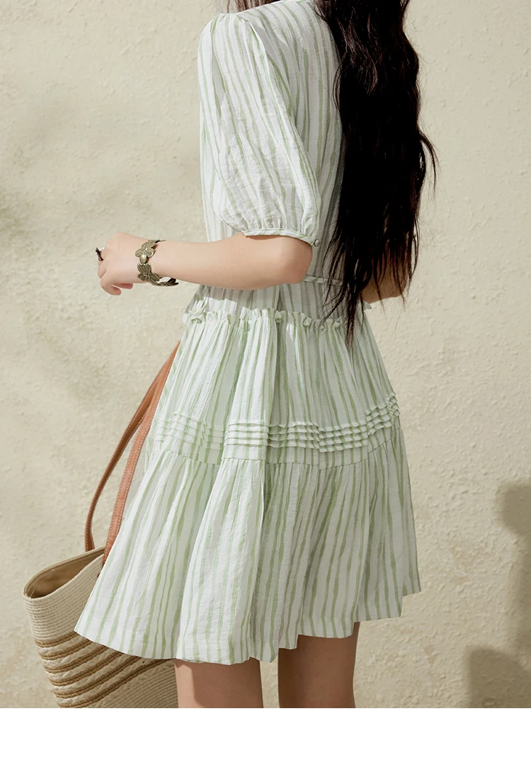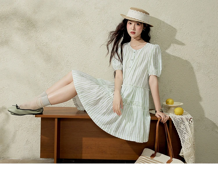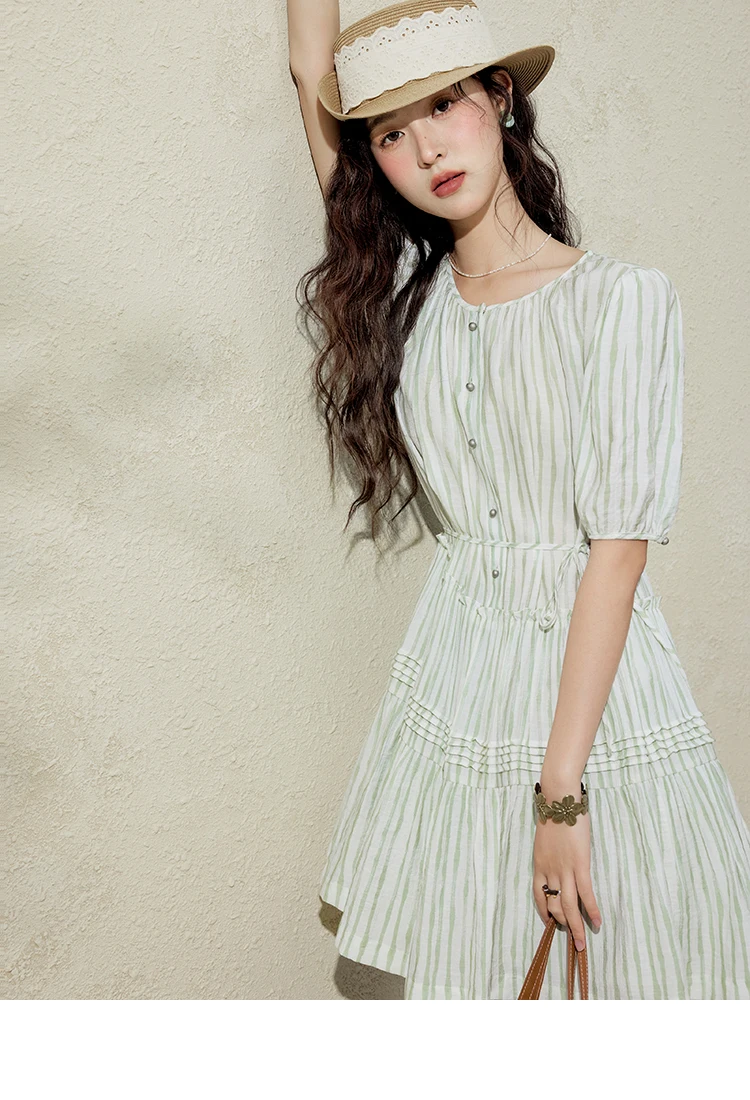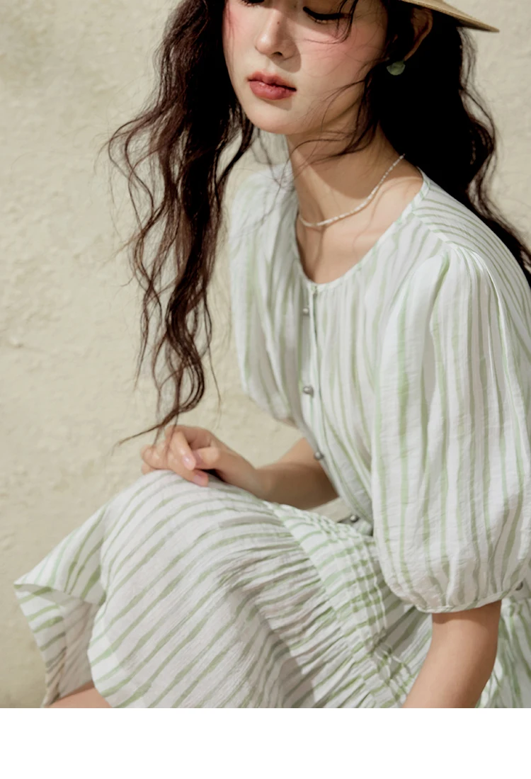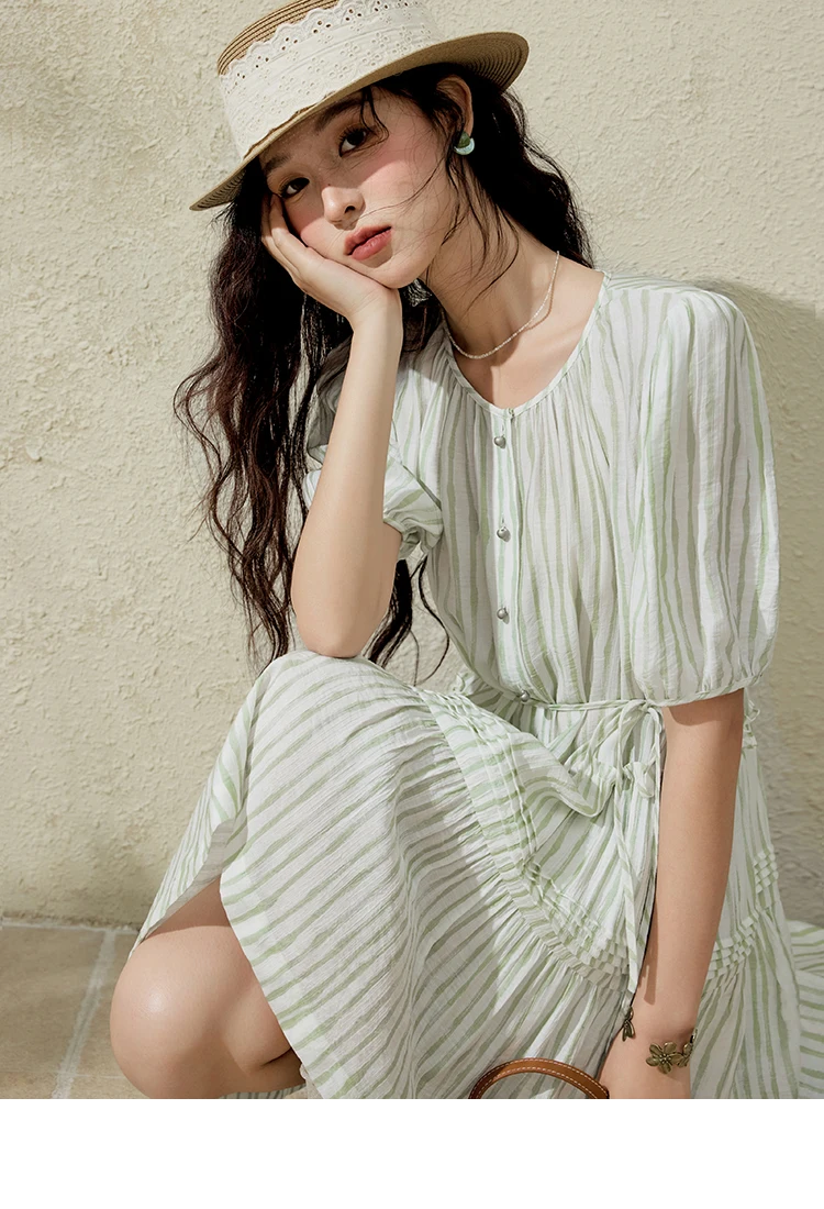 MISHOW French Green Striped Dress Women Summer 2025 Short Puff Sleeve Round Neck New Mid-length Dresses Woman Fashion MXE15L2141
